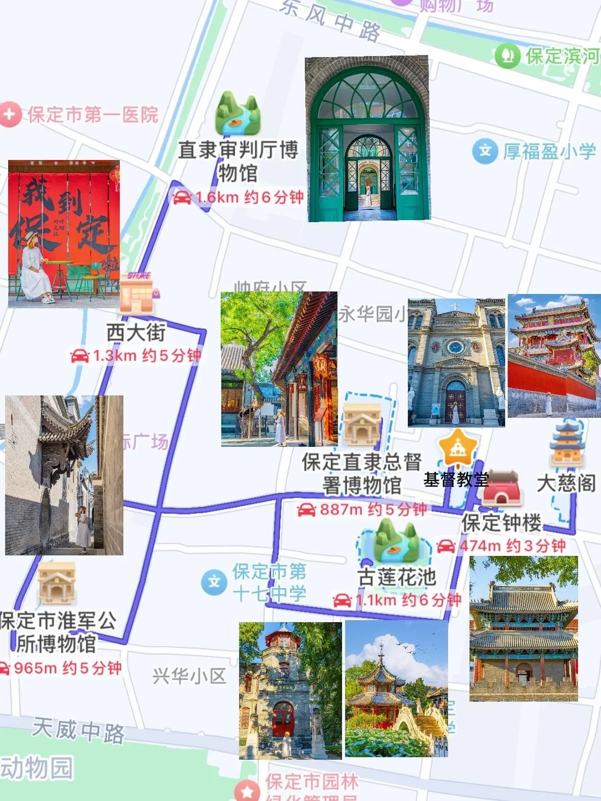 西大街—直隶审判厅博物馆—保定淮军公所博物馆—直隶总督府—古莲花池—保定天主教堂—保定中楼—大慈阁