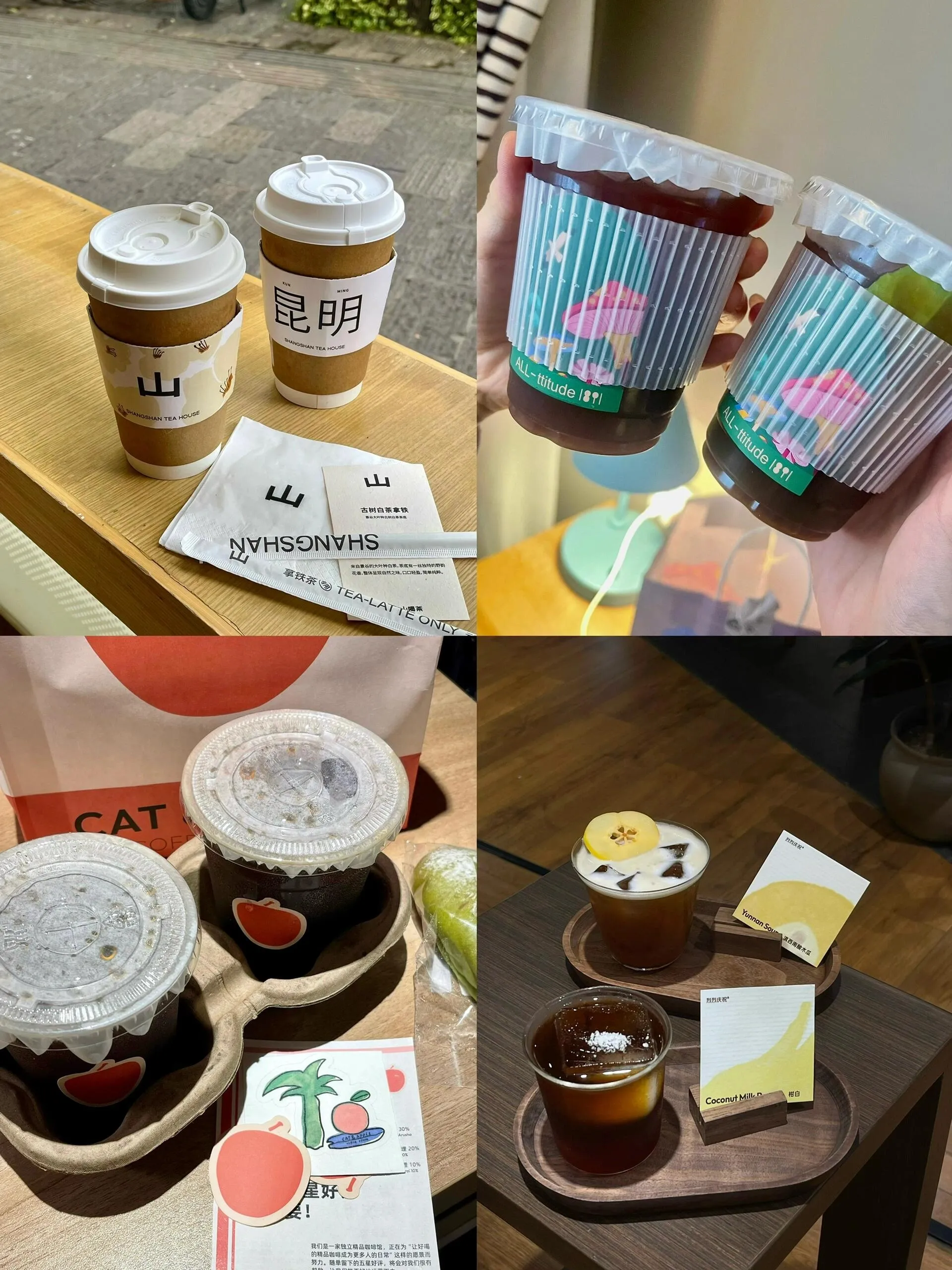 饮品方面,上山喝茶是昆明的专属味道。滇红拿铁是招牌,五种茶叶混合配制味道超浓!古树白茶拿铁相比之下茶味淡一点,建议喜欢喝奶茶的朋友都尝尝。烈烈庆祝是一家温馨的咖啡店,木瓜酸口感酸涩,夏天来上一杯很清爽。柑白的风味非常明显,有加一些椰蓉来增强风味,很值得一试。CAT&APPLE 猫和苹果有超可爱的苹果贴纸,还有自家烘焙的面包,香气四溢。地平线All·ttitude1891的罗望子酸角冰美式和重瓣玫瑰冰美式,酸甜的酸角汁和清新的玫瑰汁搭配美式咖啡真的很绝妙。