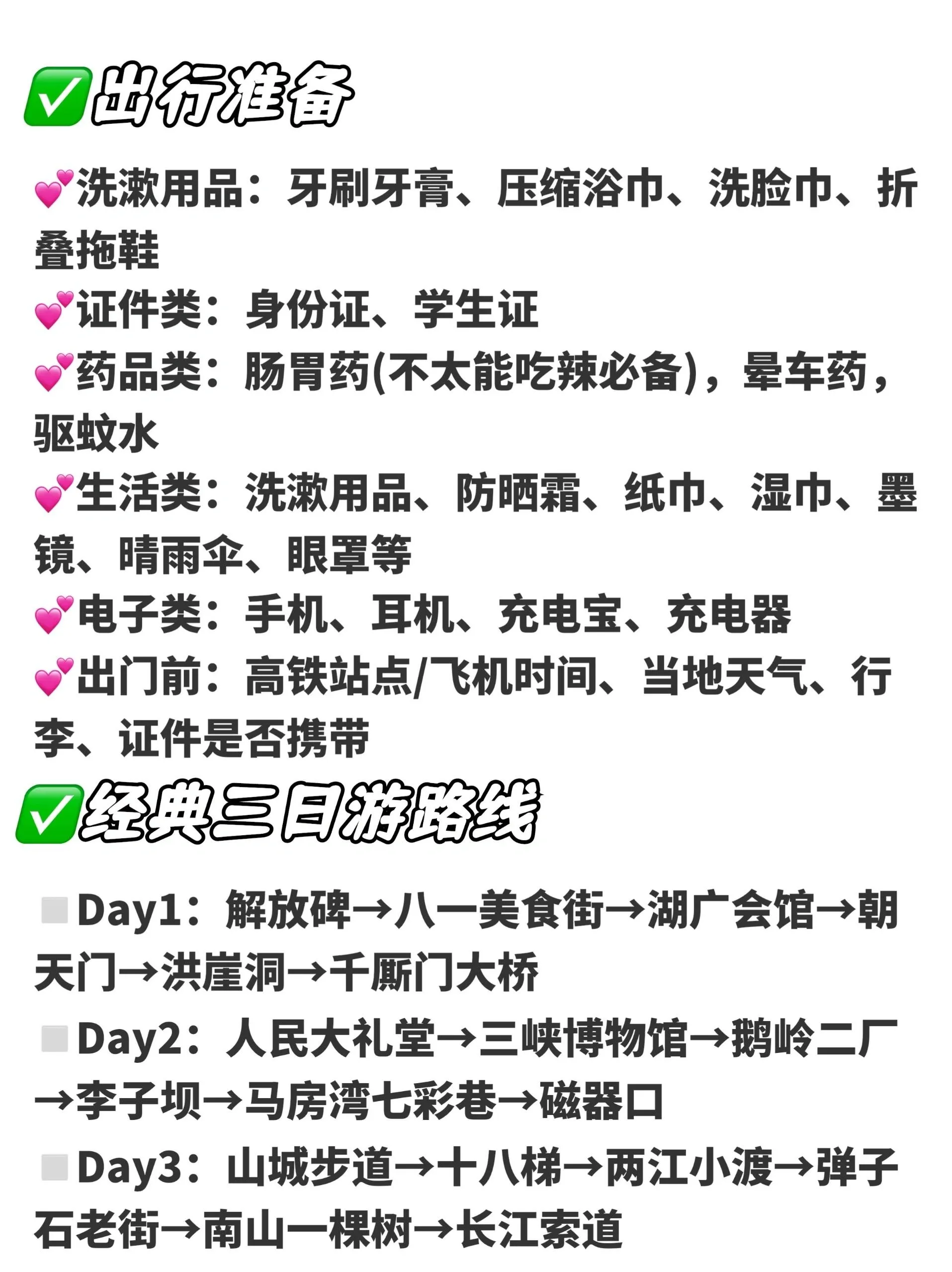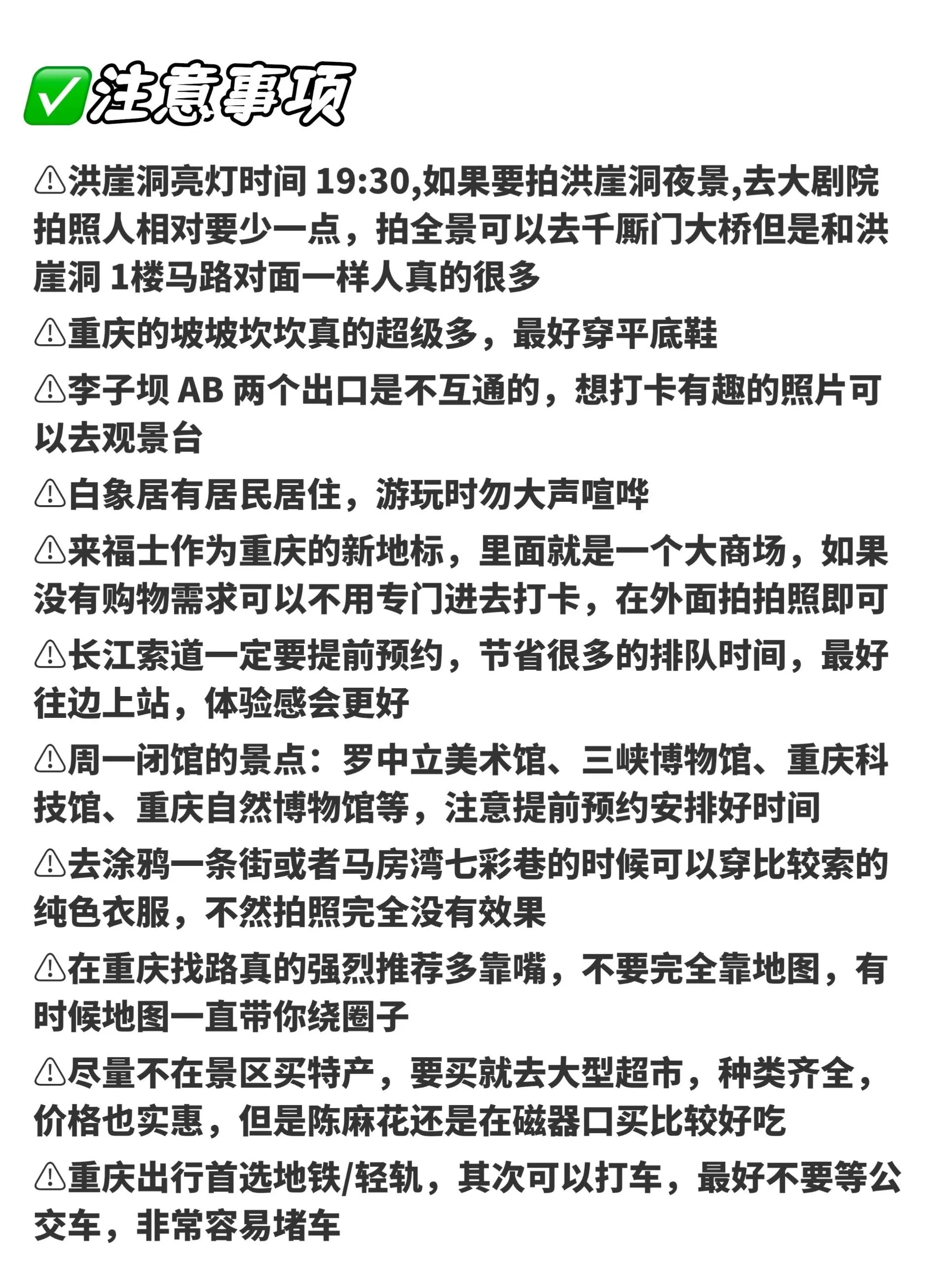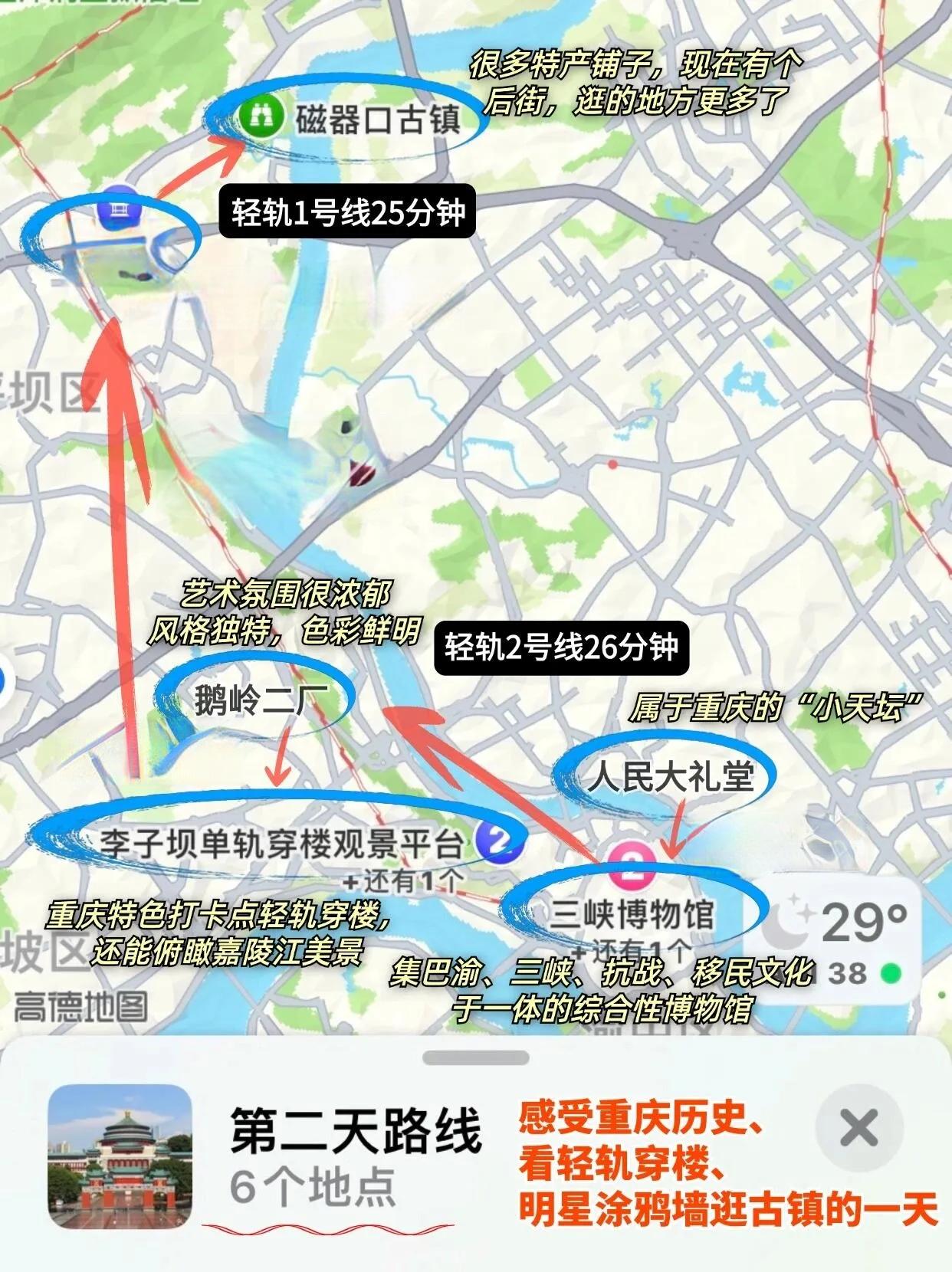 这条路线涵盖了重庆的主要景点,既有现代都市风貌,又不乏历史文化气息 ,还能欣赏到重庆独特的地貌和夜景。建议根据实际情况和个人喜好进行适当调整,以获得最佳的旅行体验。