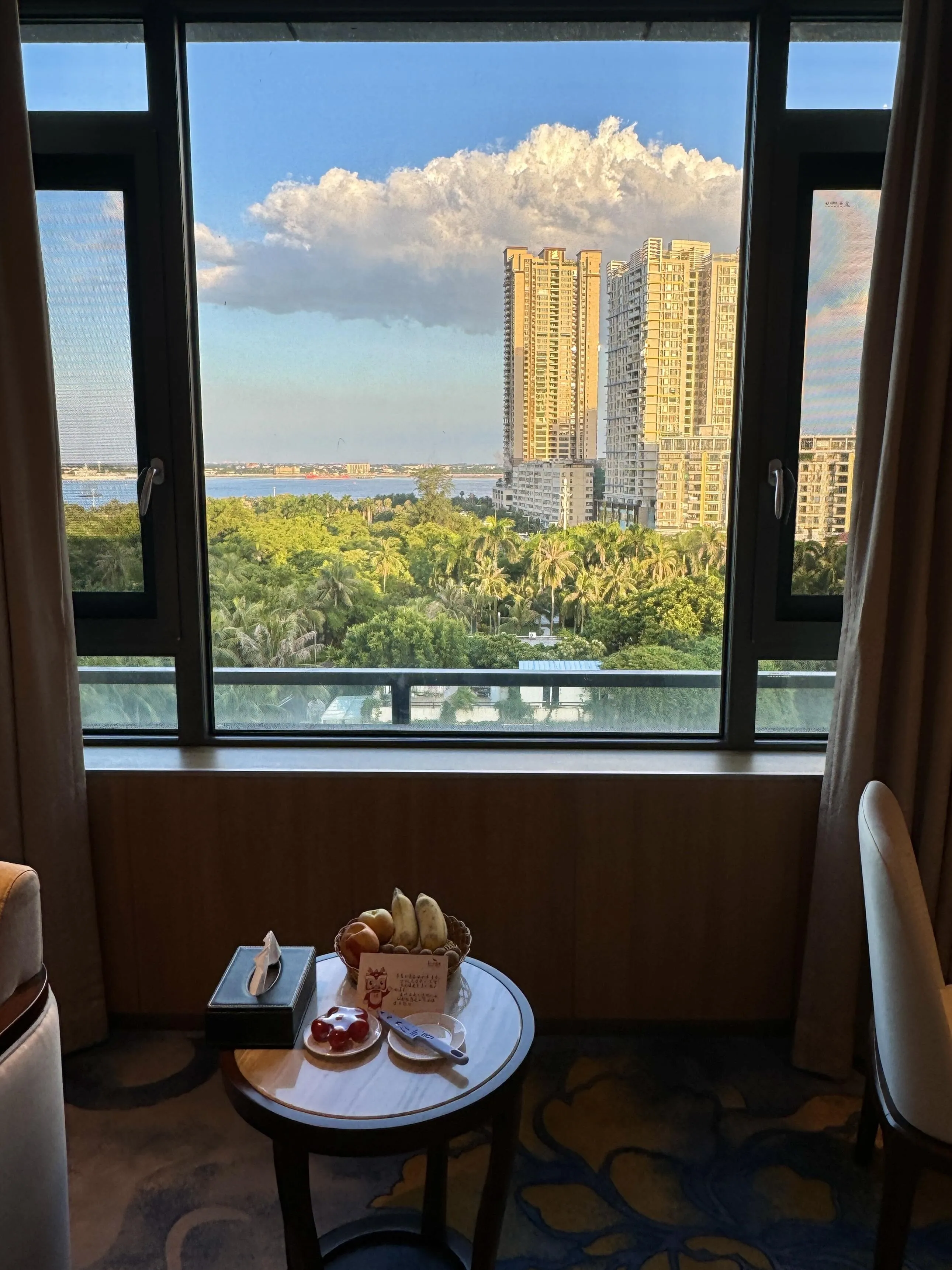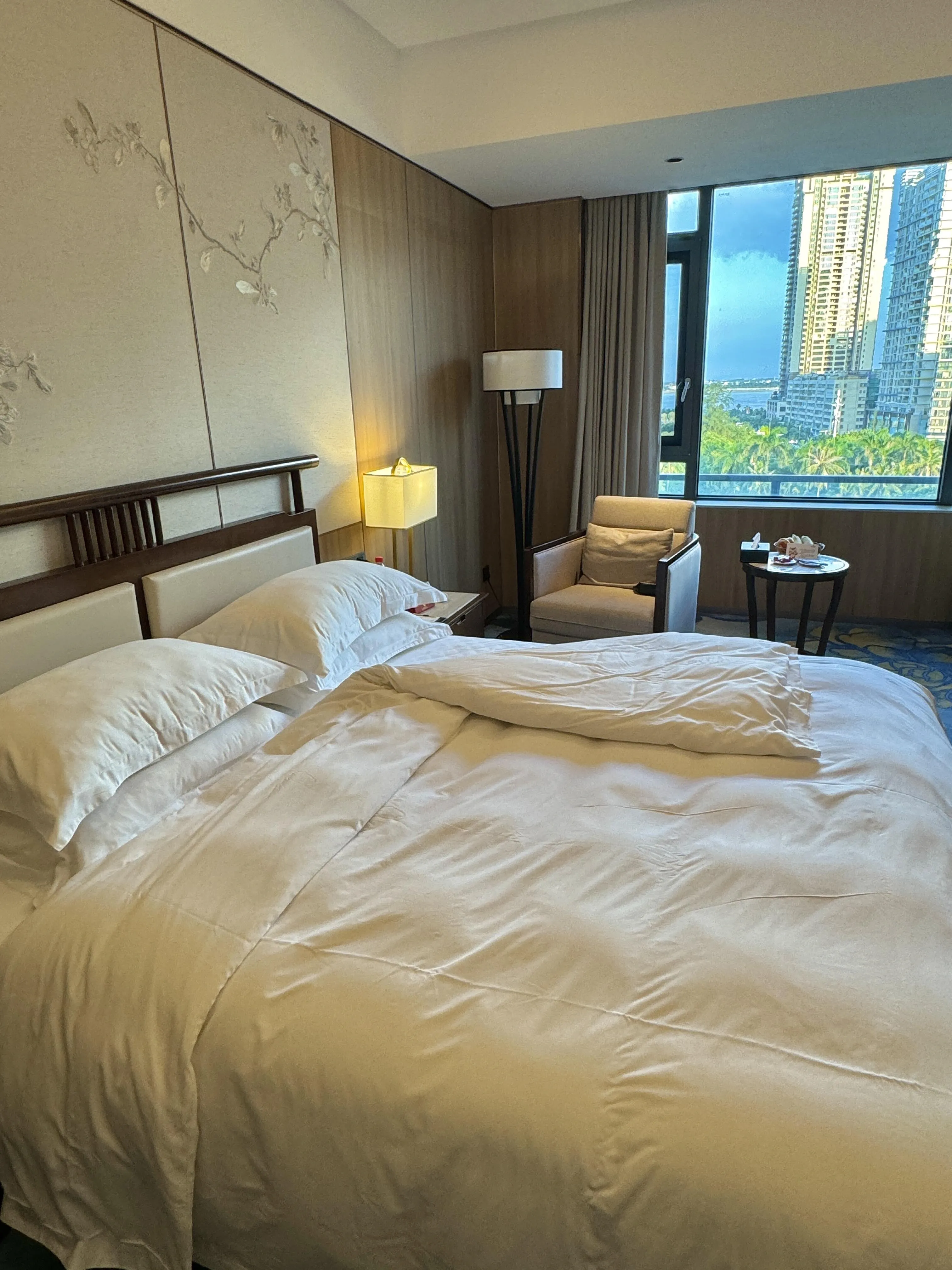 房间方面,豪华大床房约28平米,布局合理,设计讲究。床具舒适,尤其是枕头的松软程度恰到好处,对颈椎不好的客人来说非常友好。 房间的一大亮点是落地窗 ,可以直接欣赏到壮阔的海景。窗边还贴心地摆放了茶几和小沙发,成为了让人流连忘返的休憩角落。