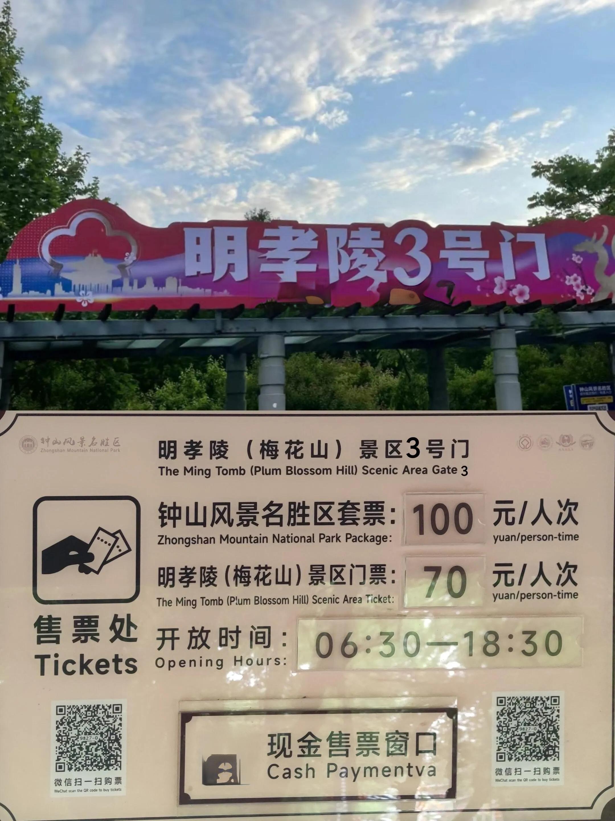 门票:从明孝陵3号口进入。 门票70元,套票100元。 6点半前进入免票。