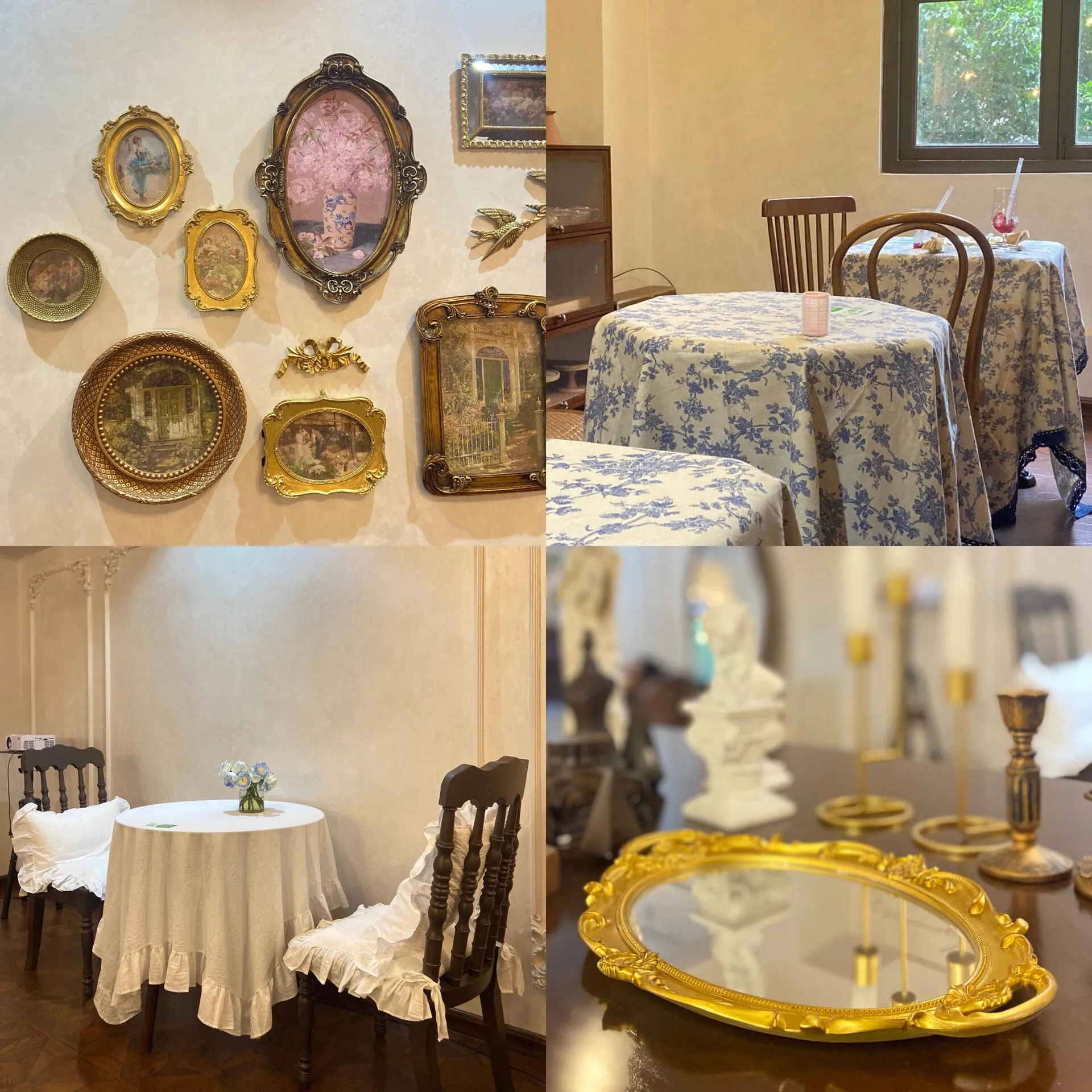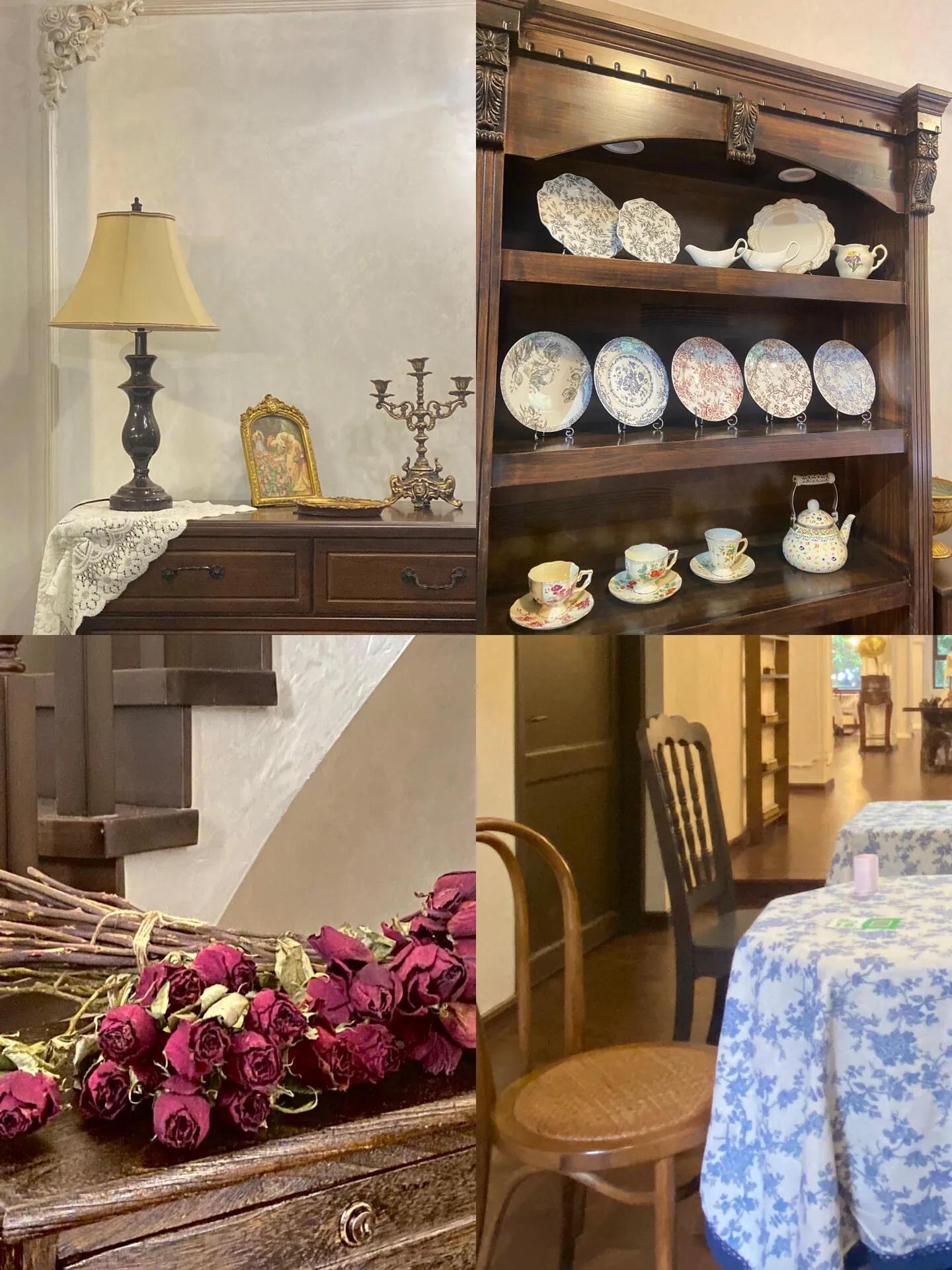店铺装修复古奢华,是各种风格穿搭拍照的绝佳场所。一楼是服装区,提供衣服、帽子和配饰,还有食品展示台。二楼是宽敞的休息区,设有单人桌、双人桌、四人桌和多人聚餐长桌,甚至还有适合举办派对的包间。