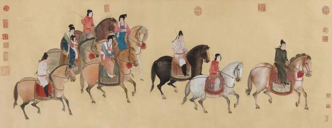 张萱的《虢国夫人游春图》描绘了唐玄宗与杨贵妃姐妹骑马游春的奢华排场。