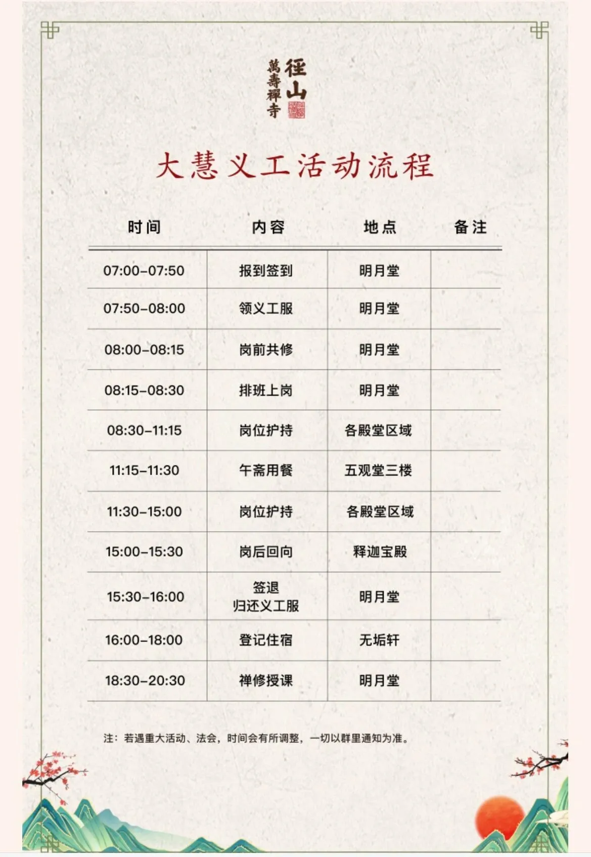 我参加了径山寺的两日义工活动,体验包括寺庙住宿和一日三餐。寺庙的素斋口味很不错,每天都有变化。虽然径山寺门票需要30元,但作为义工可以免门票并深入体验寺庙生活。