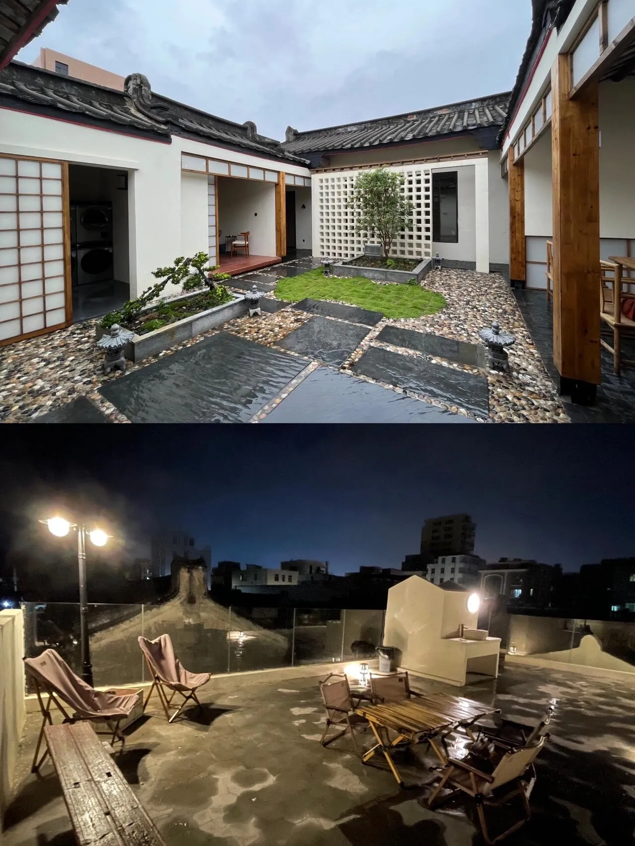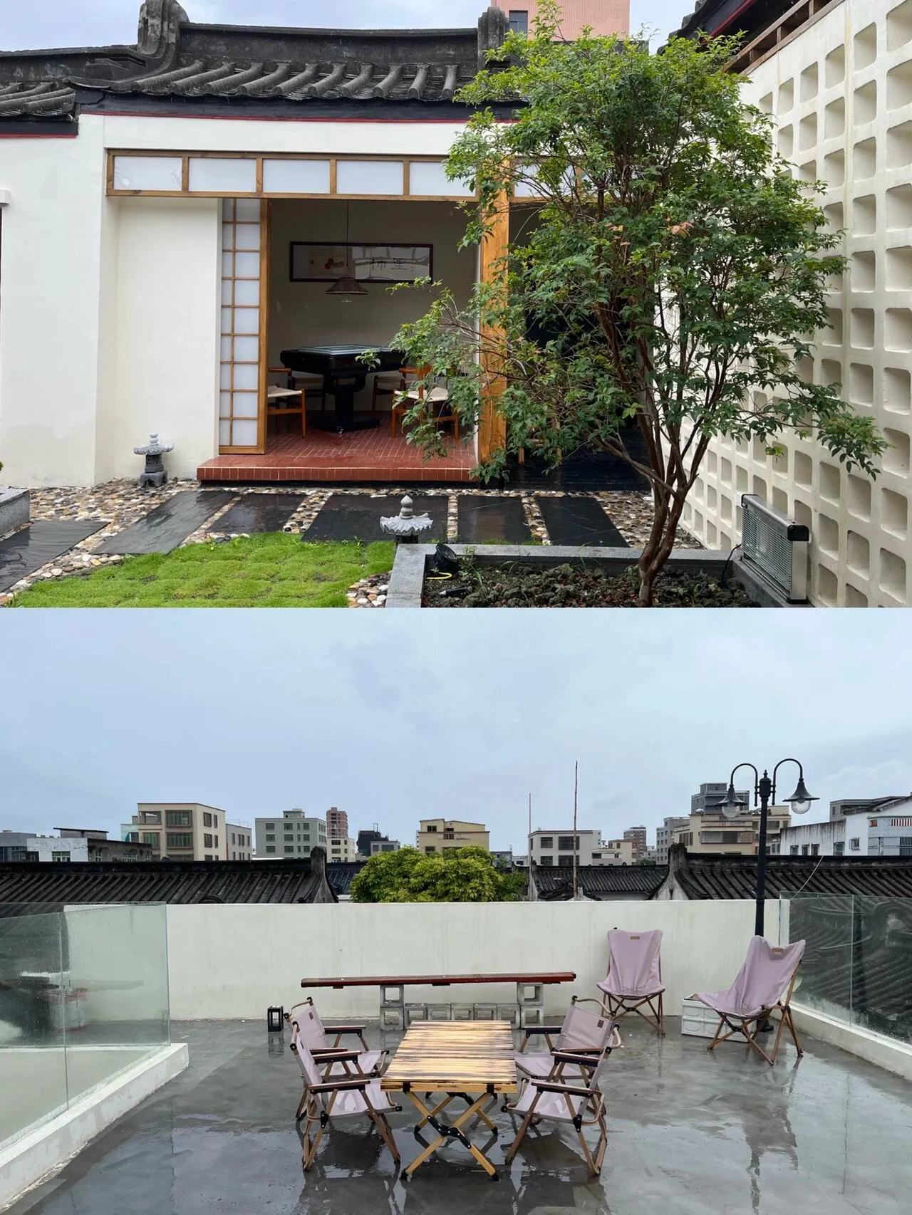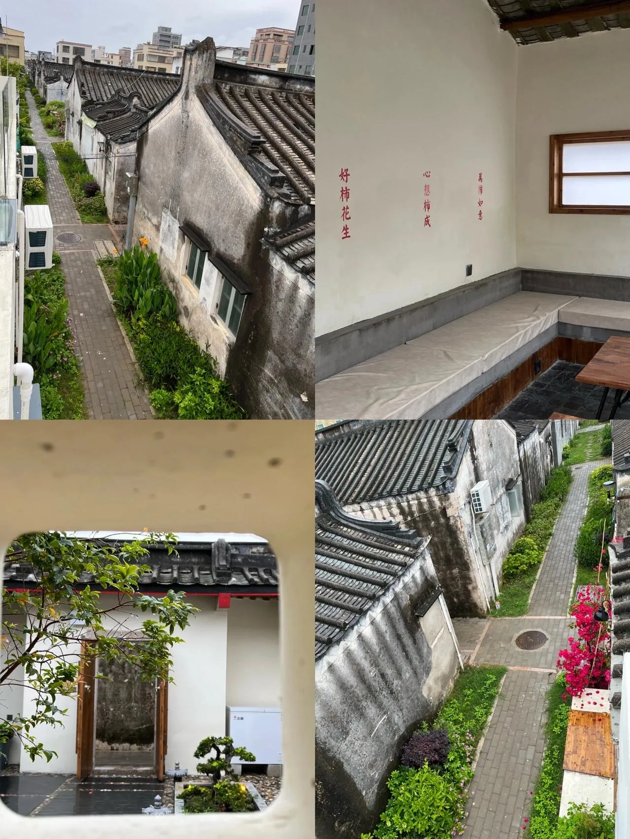 这是一家隐藏在汕头市龙湖区十一合村的宝藏轰趴民宿——柿里轰趴民宿。 虽然位于不起眼的长巷子里,但推门而入,一个日式中式风格混合的小庭院立即映入眼帘。素雅古朴的环境中,郁郁葱葱的灌木丛和大簇红艳的三角梅随意生长,营造出生机勃勃的氛围。