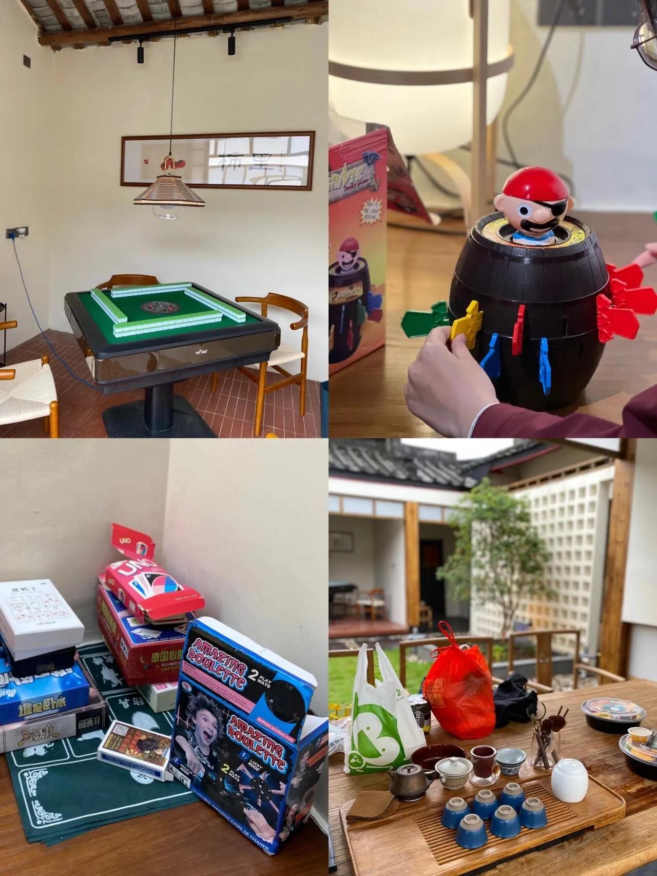 民宿的轰趴设施相当丰富,包括全自动麻将桌、茶几、各类桌游棋牌、飞镖、大露台和烧烤炉等。 无论人多人少,都能找到适合的娱乐方式。天气好的时候,还可以在露台上看星星。