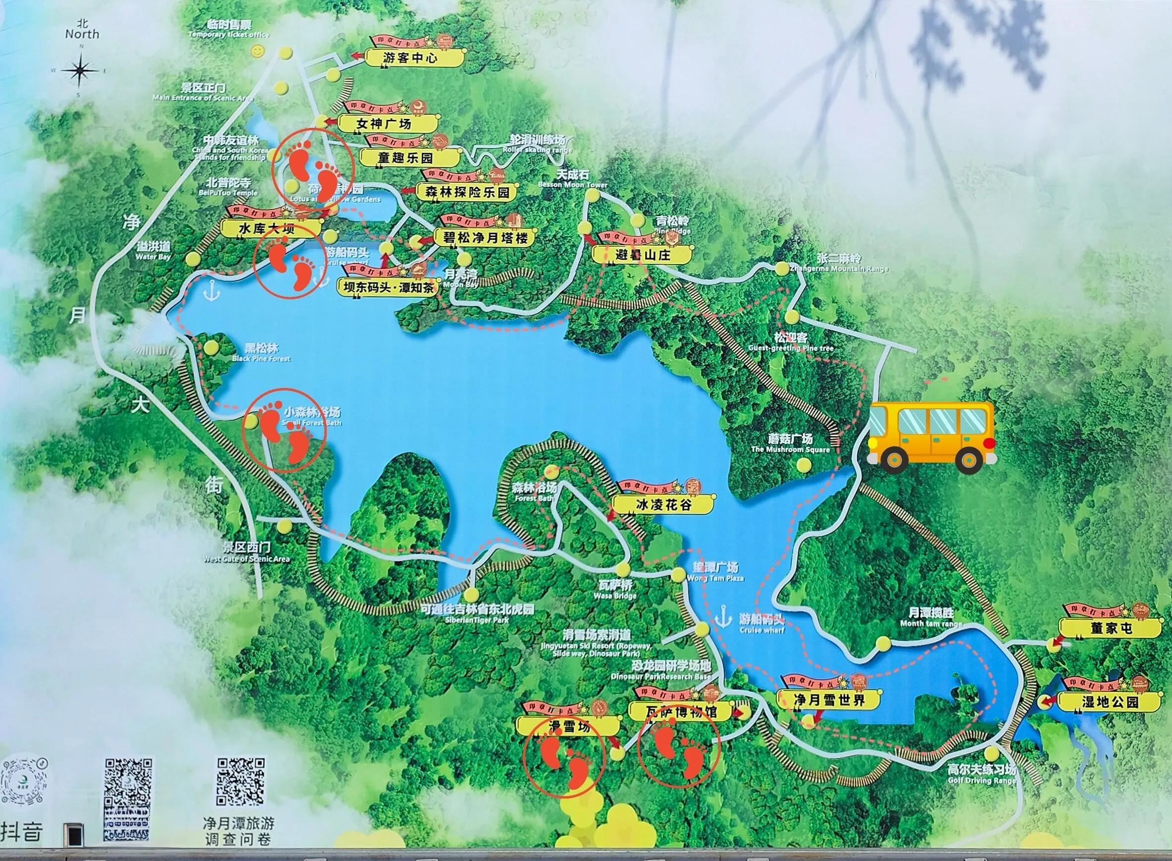一进门就能看到景区地图,旁边有个肯德基甜品站,可以买咖啡和冰淇淋,生意很火爆。顺着甜品站往前就是观光车售票处,20元/人,全天随便坐,记得把红色手环戴好别弄丢了。