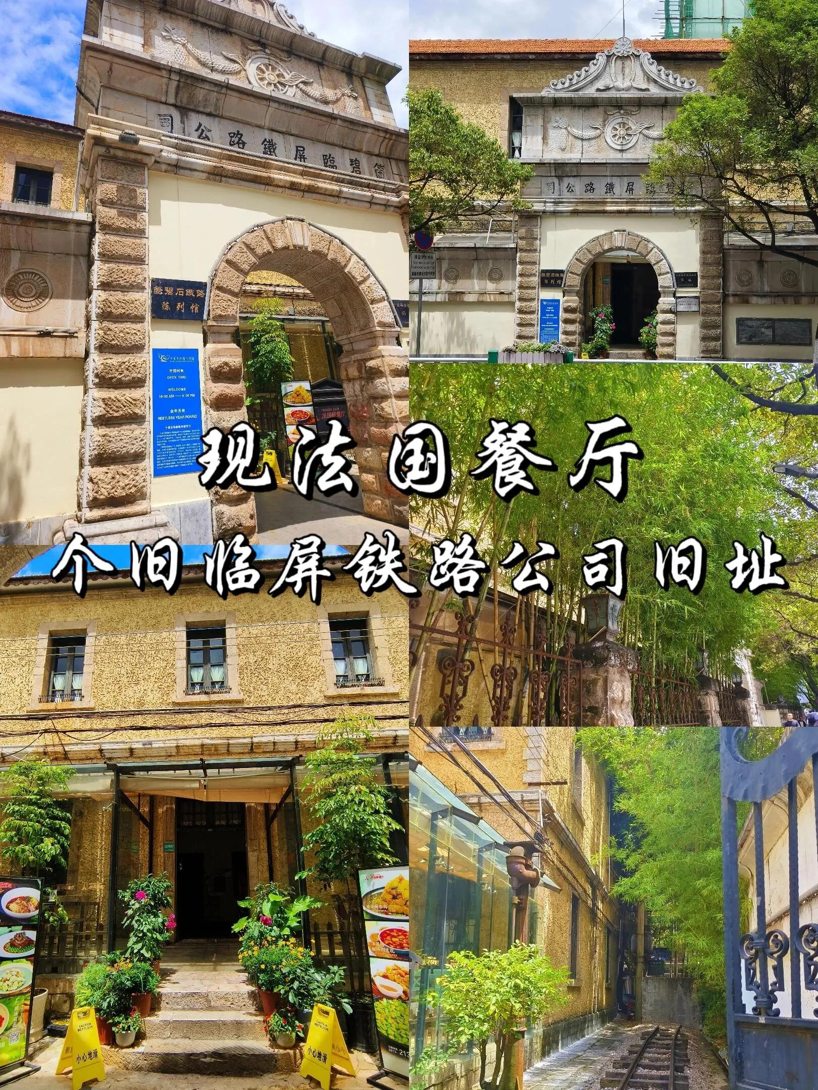 个旧临屏铁路公司旧址(现为法国餐厅):免费参观,餐厅营业时间9:00-21:30。从缆车步行700米即到。现在是一家法国餐厅,菜品偏甜。我征得老板同意后参观了一下,内部很适合拍照,建议穿小裙子来打卡。