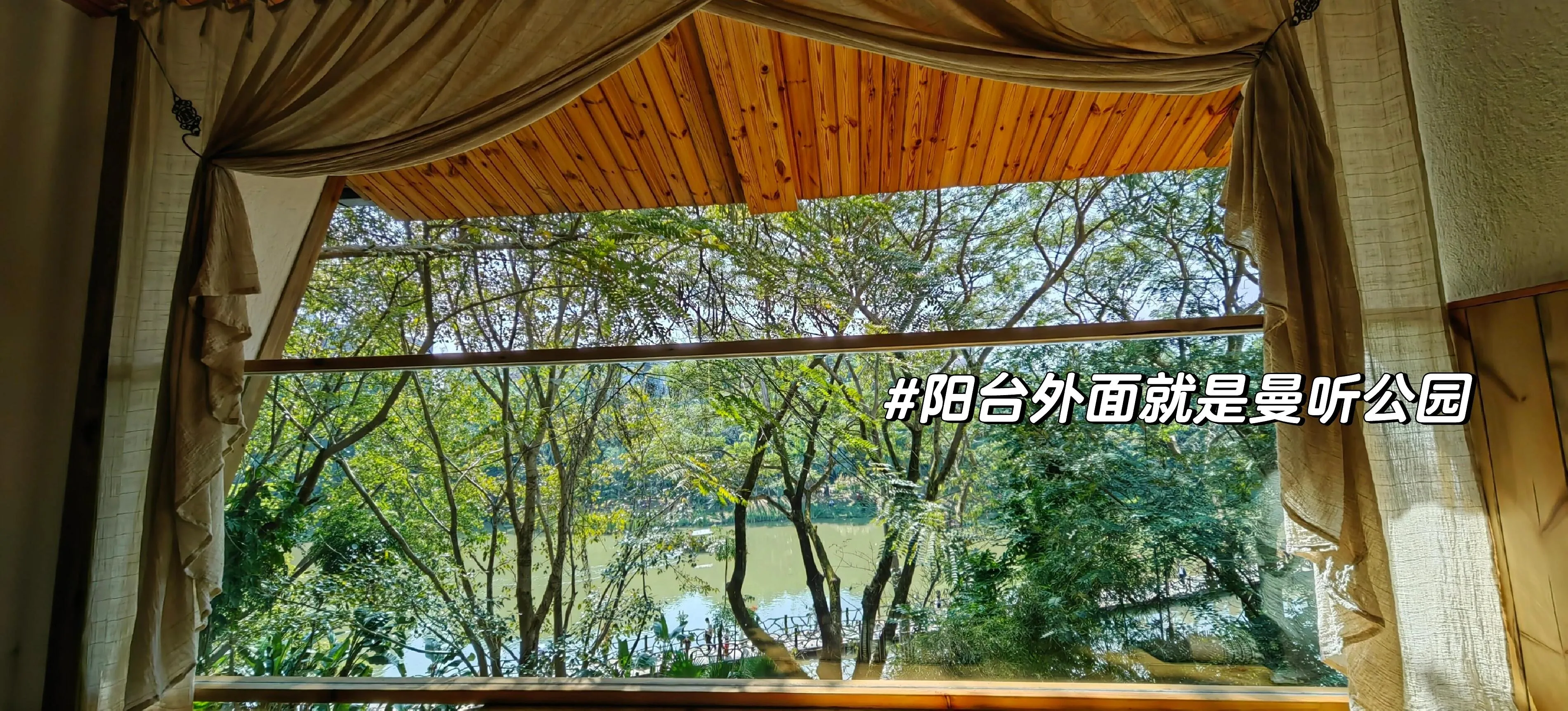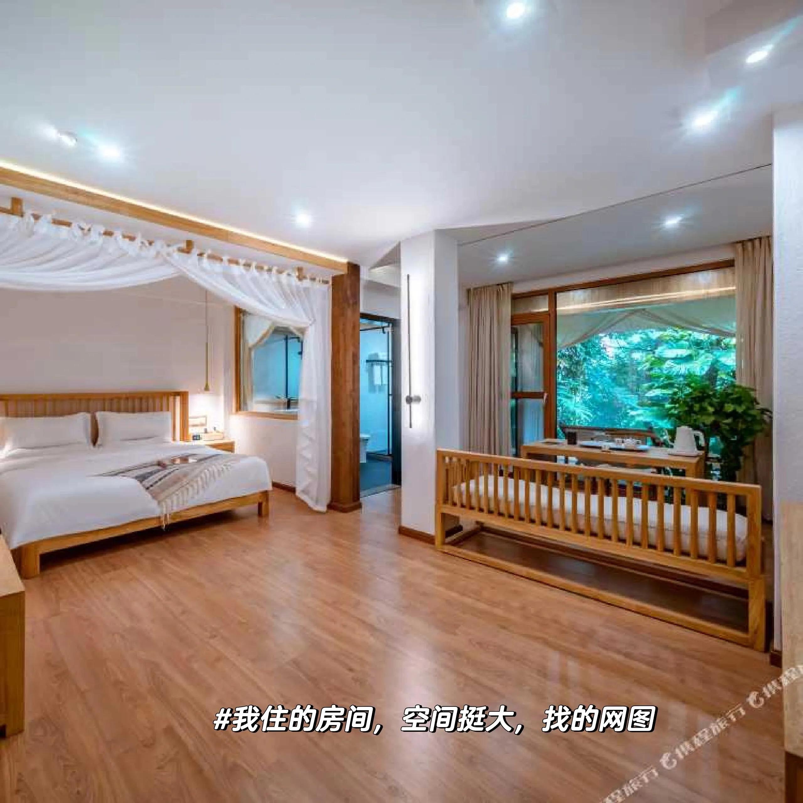 房间是这家民宿的一大亮点。我订的大床房面积约六七十平米,相当宽敞。室内装修以中式风格为主,大量使用木制品。阳台是最吸引人的地方,不仅可以俯瞰楼下游客来往,还能欣赏曼听公园的美景,泡茶吃水果,惬意至极。