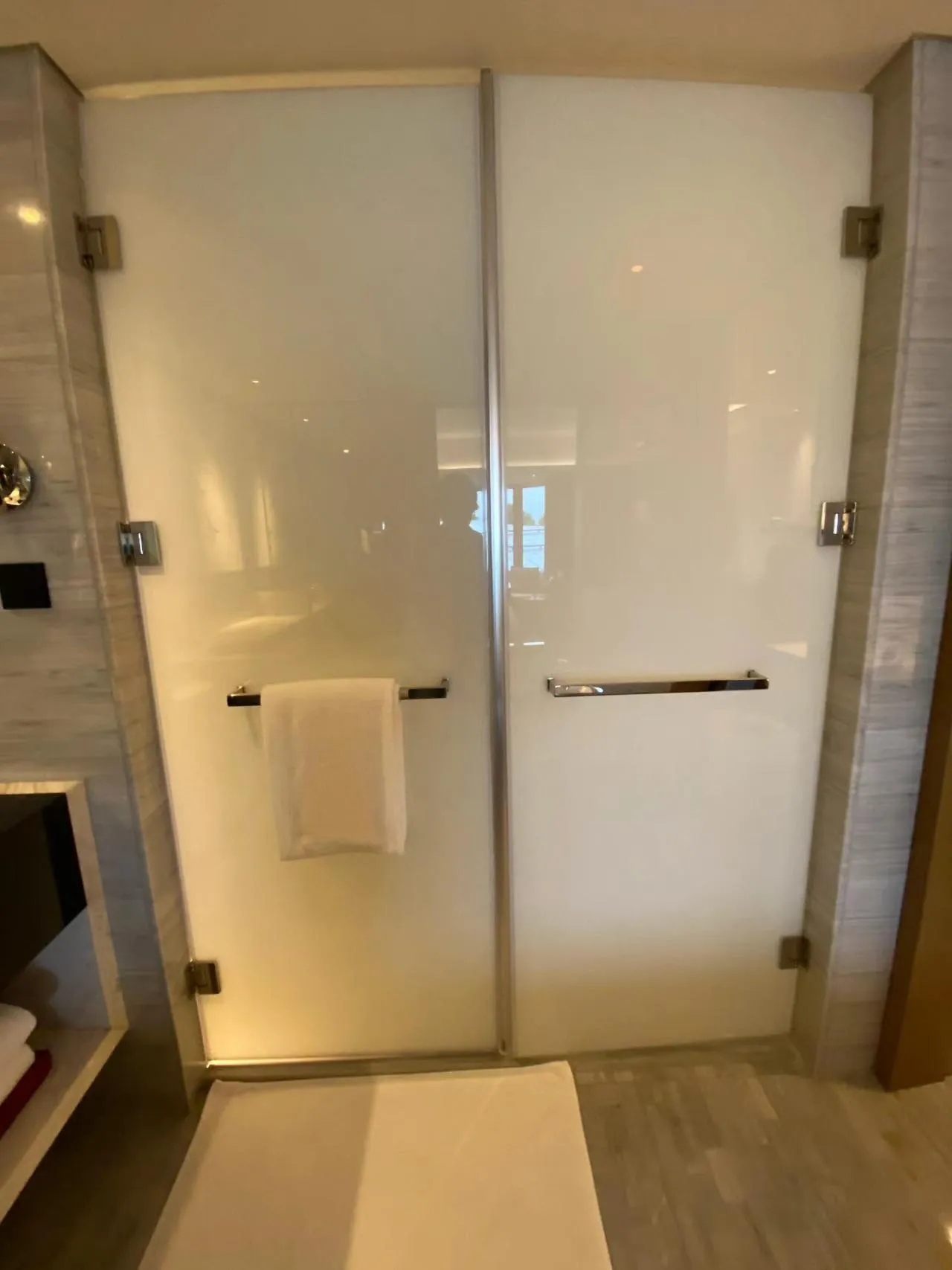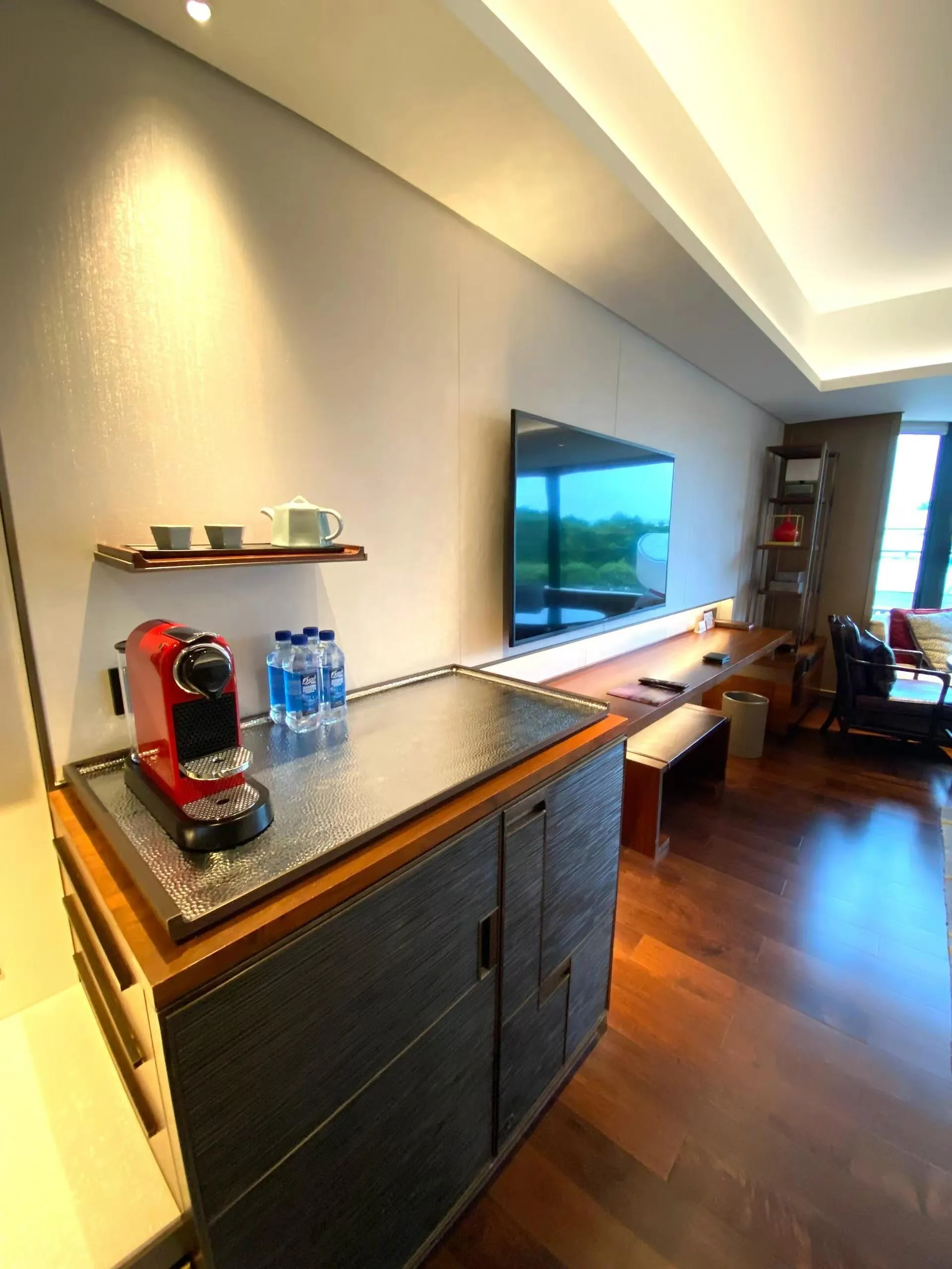 客房宽敞舒适,配备四分离卫浴设施 ,浴缸单独位于洗手台一侧。房间入口处设有小玄关,方便放置手机和挂衣服,细节之处体现了酒店的贴心。虽然低楼层的西湖景观可能被部分遮挡,但整体居住体验仍然令人满意。