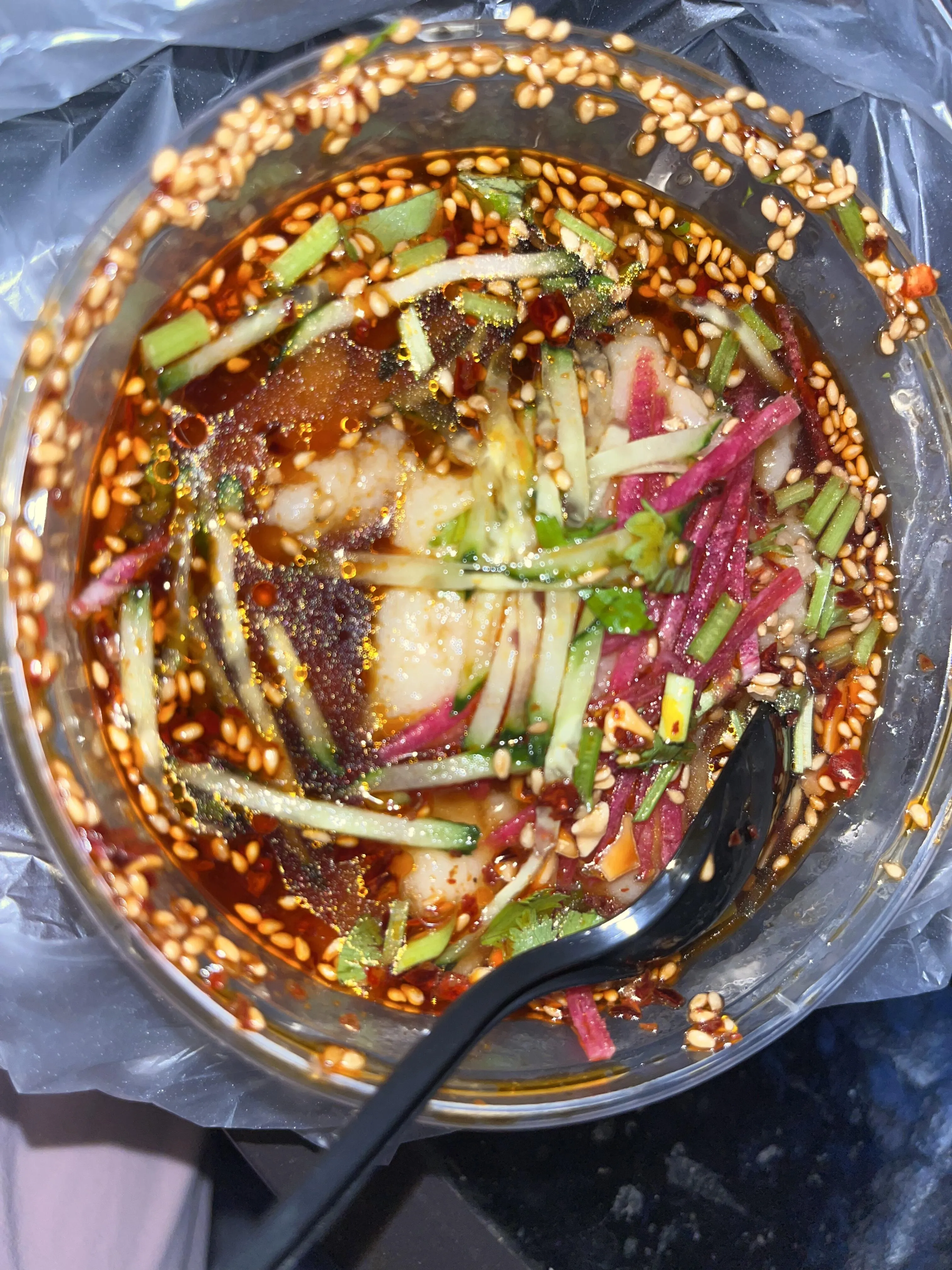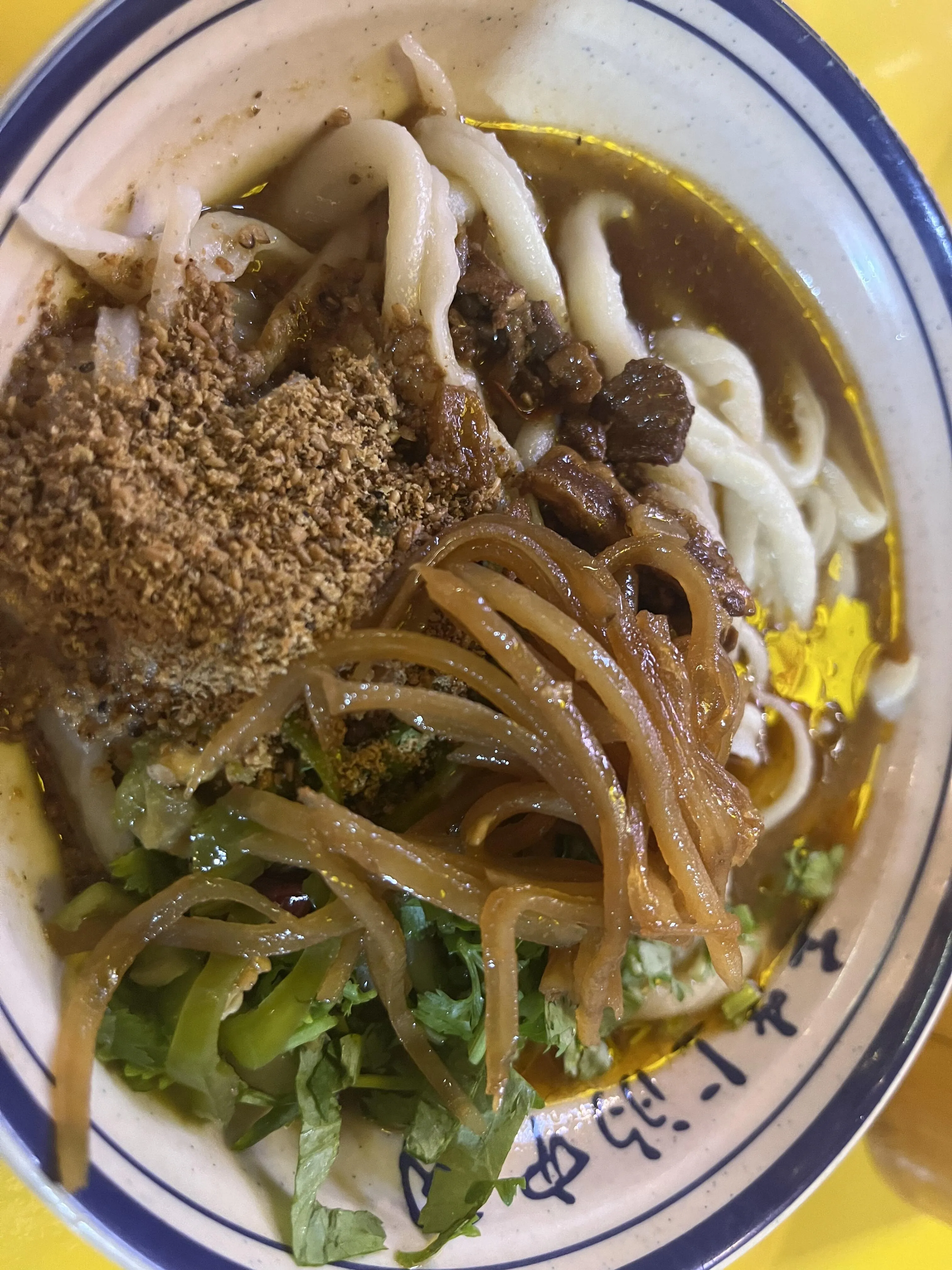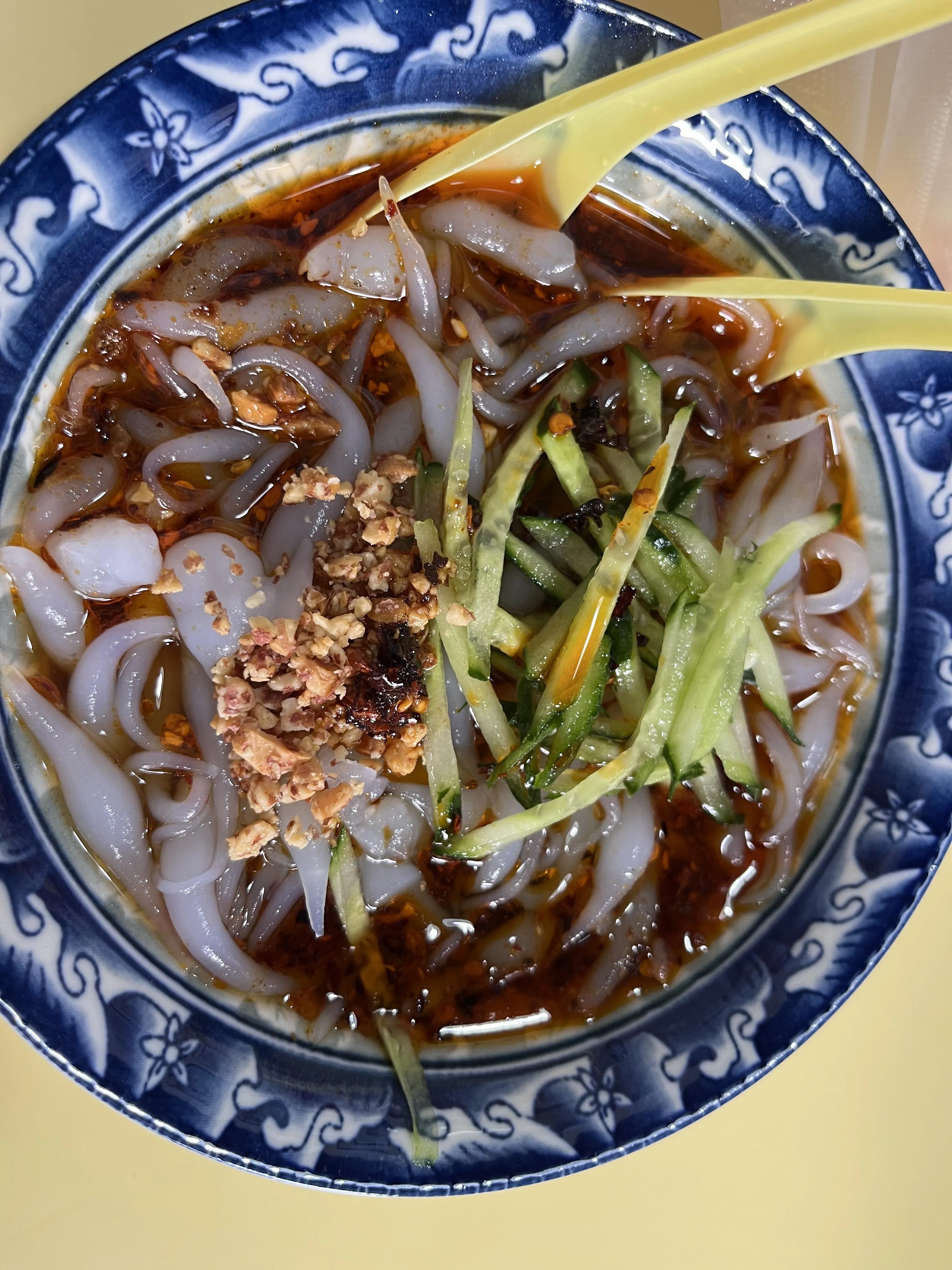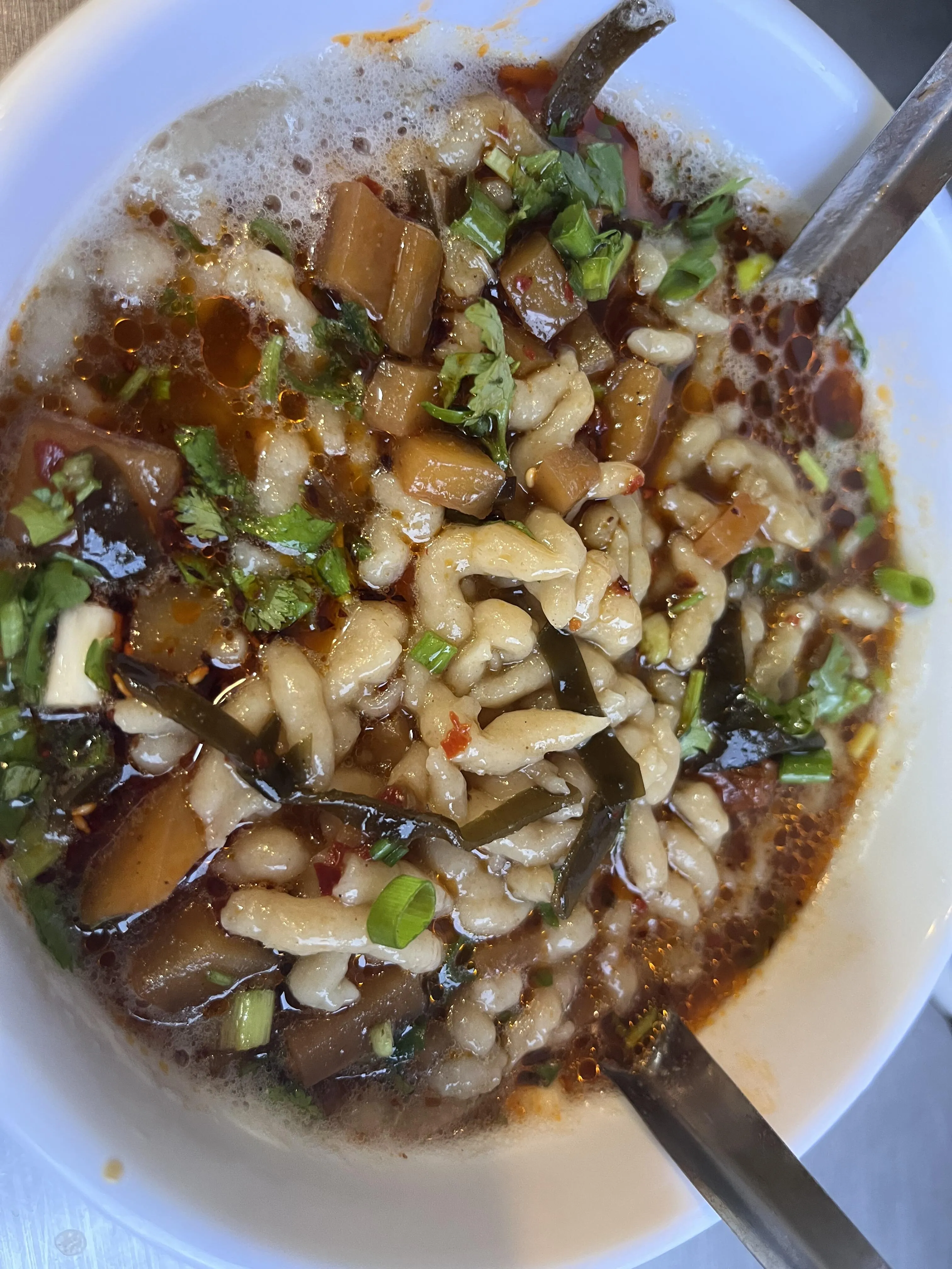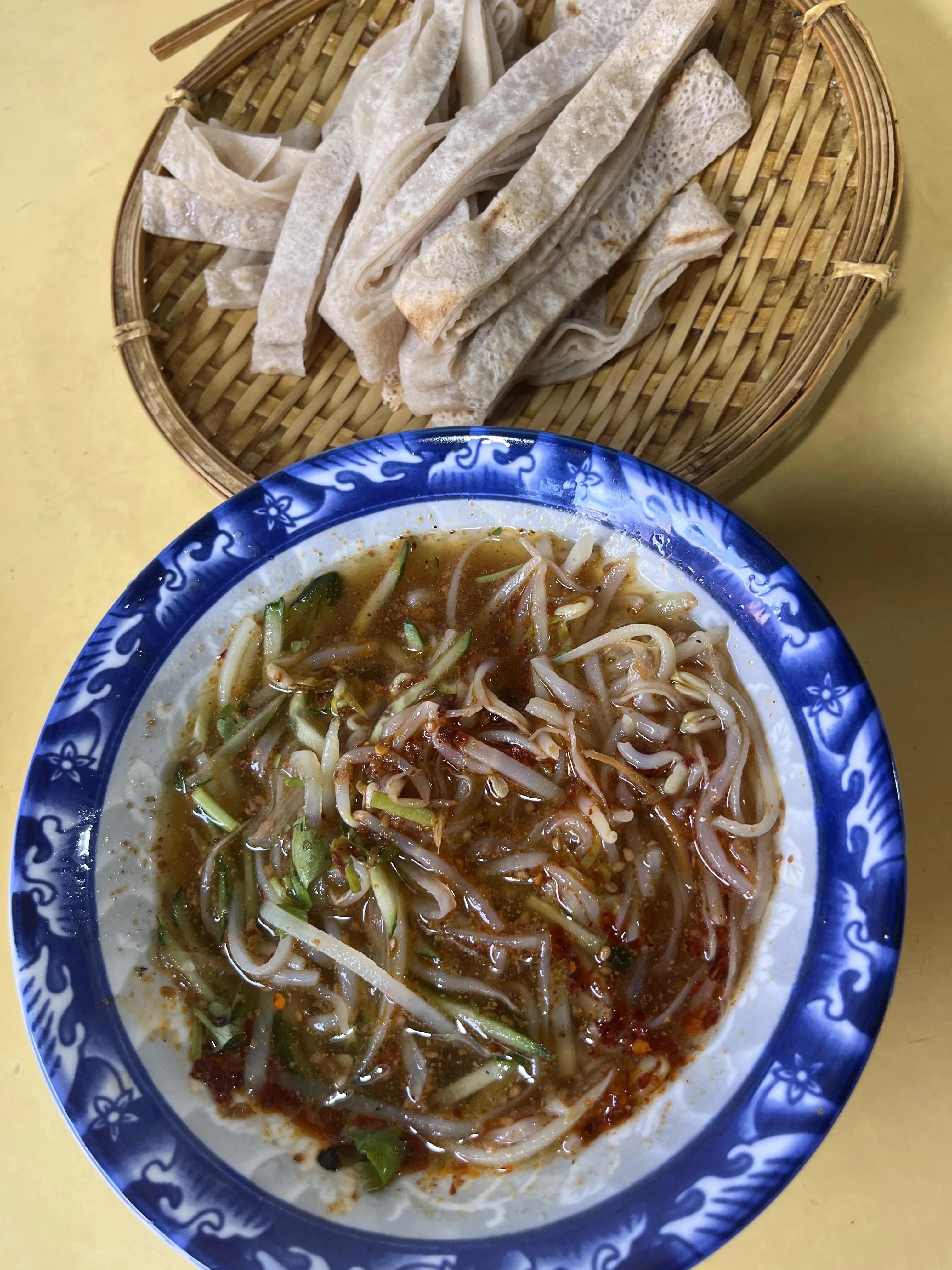 碗托:有点难以形容,介于面和粉之间,加了麻酱、醋和辣椒,口感特别,可能需要适应。
