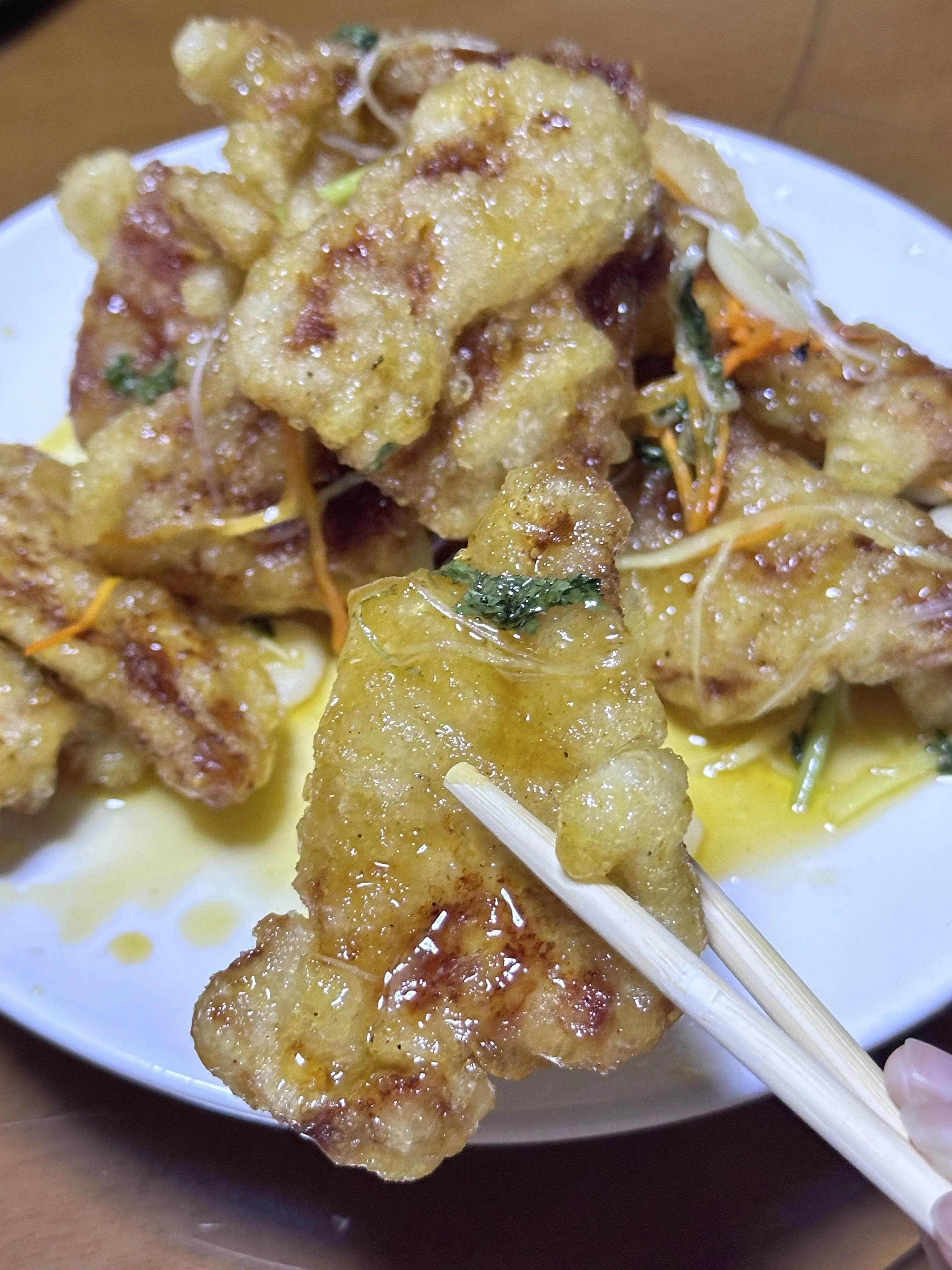 接下来来到了 享味巷子。 这里的 锅包肉带有浓浓的东北风味 ,糖醋味很正宗,是必点菜品之一。一份42元,量很足,三个人吃绰绰有余。烤羊肉串配大蒜的搭配也不错。凉拌拉面则是惊喜之作,口感清凉爽口,咸酸适中,很开胃,而且价格实惠。干锅菜花带有烧烤口味,份量十足,也是值得推荐的菜品。