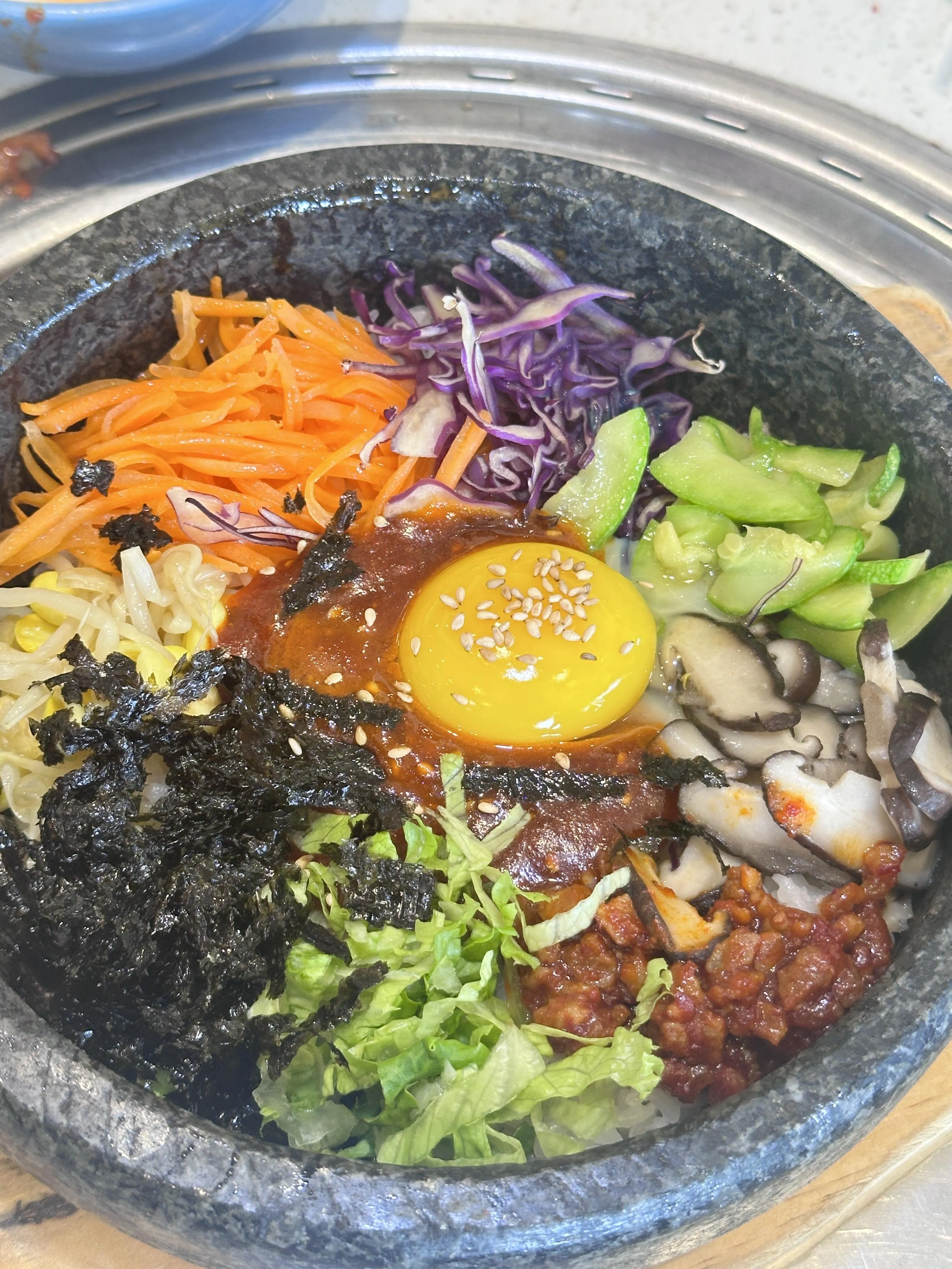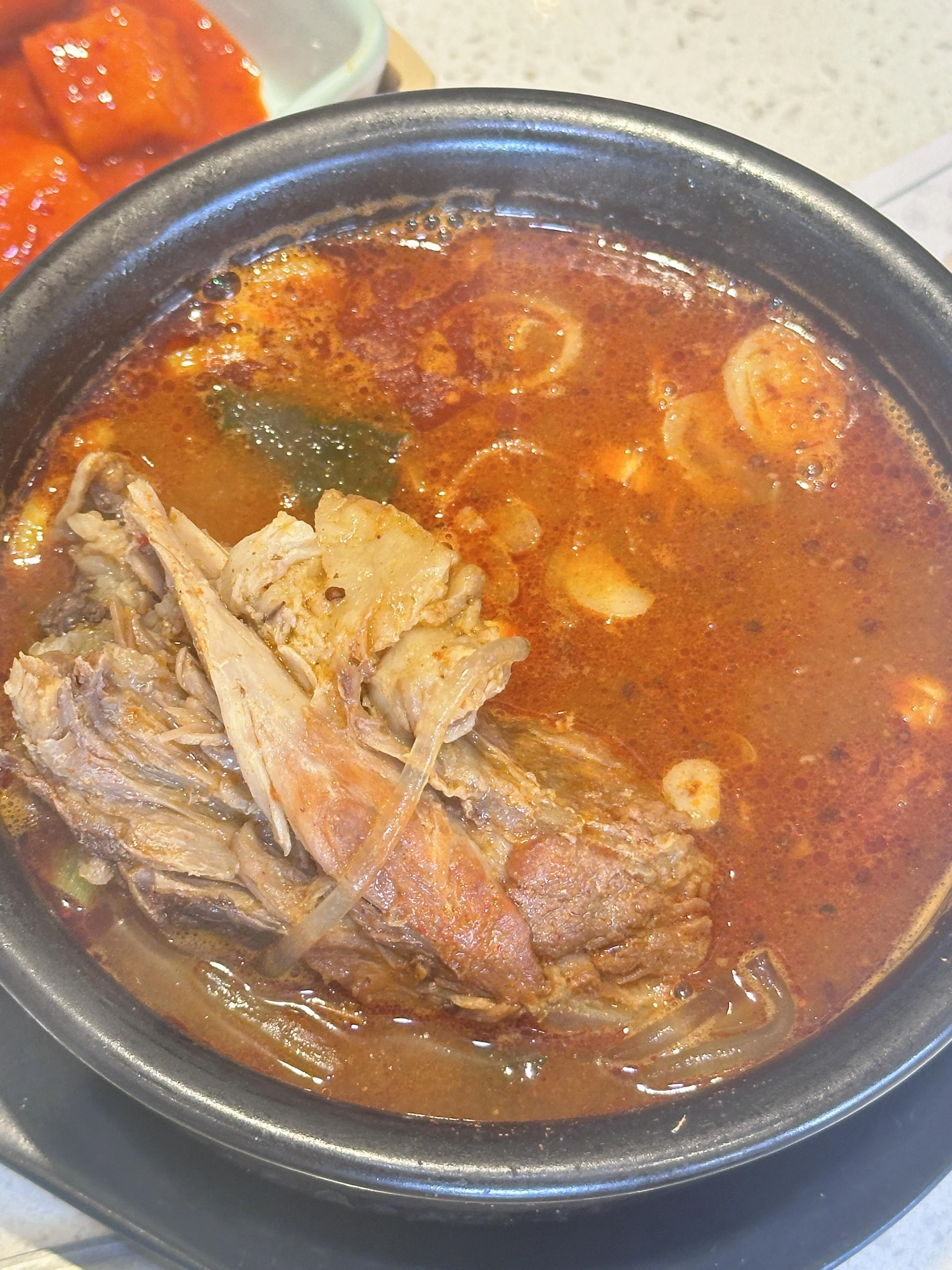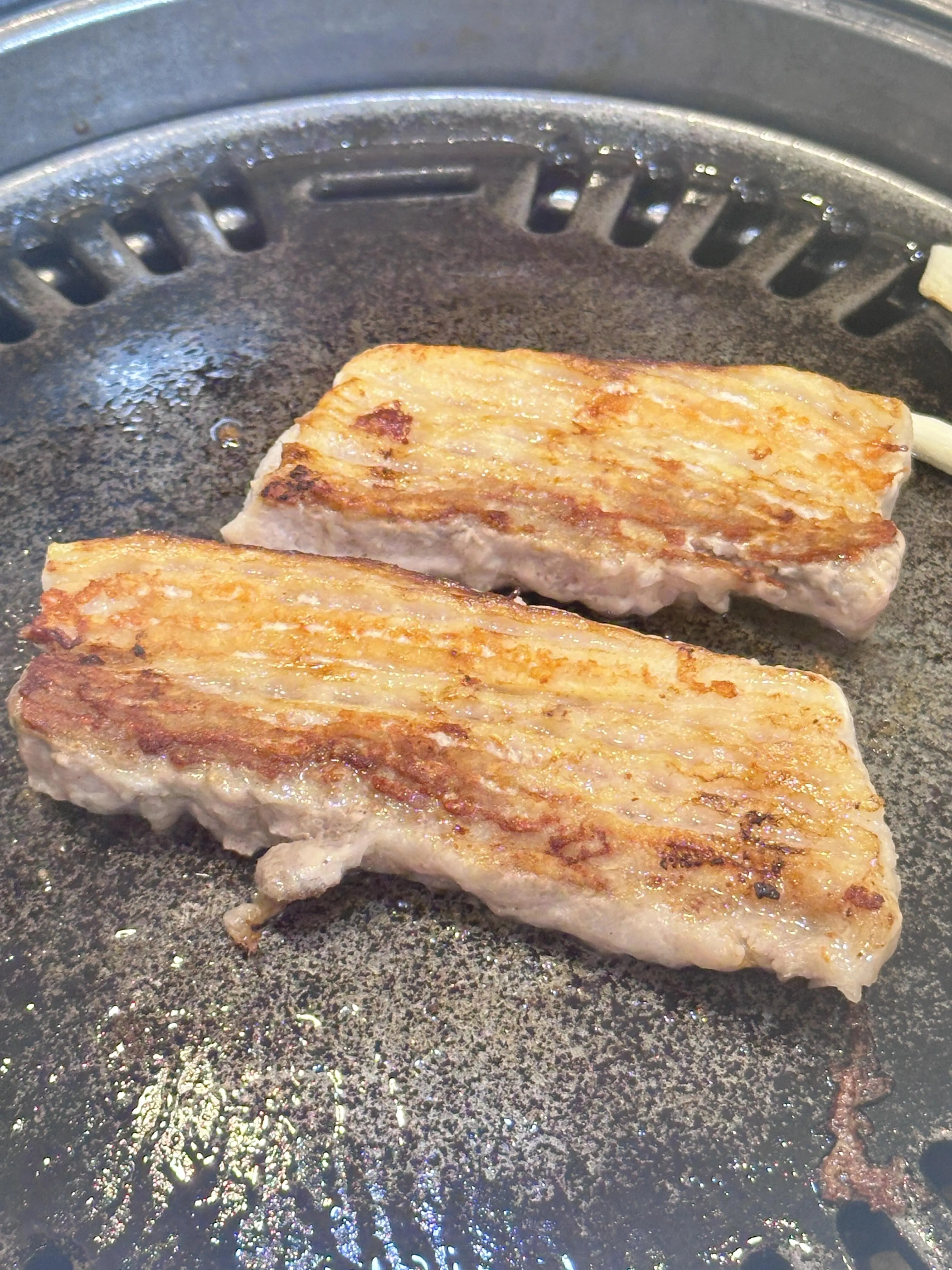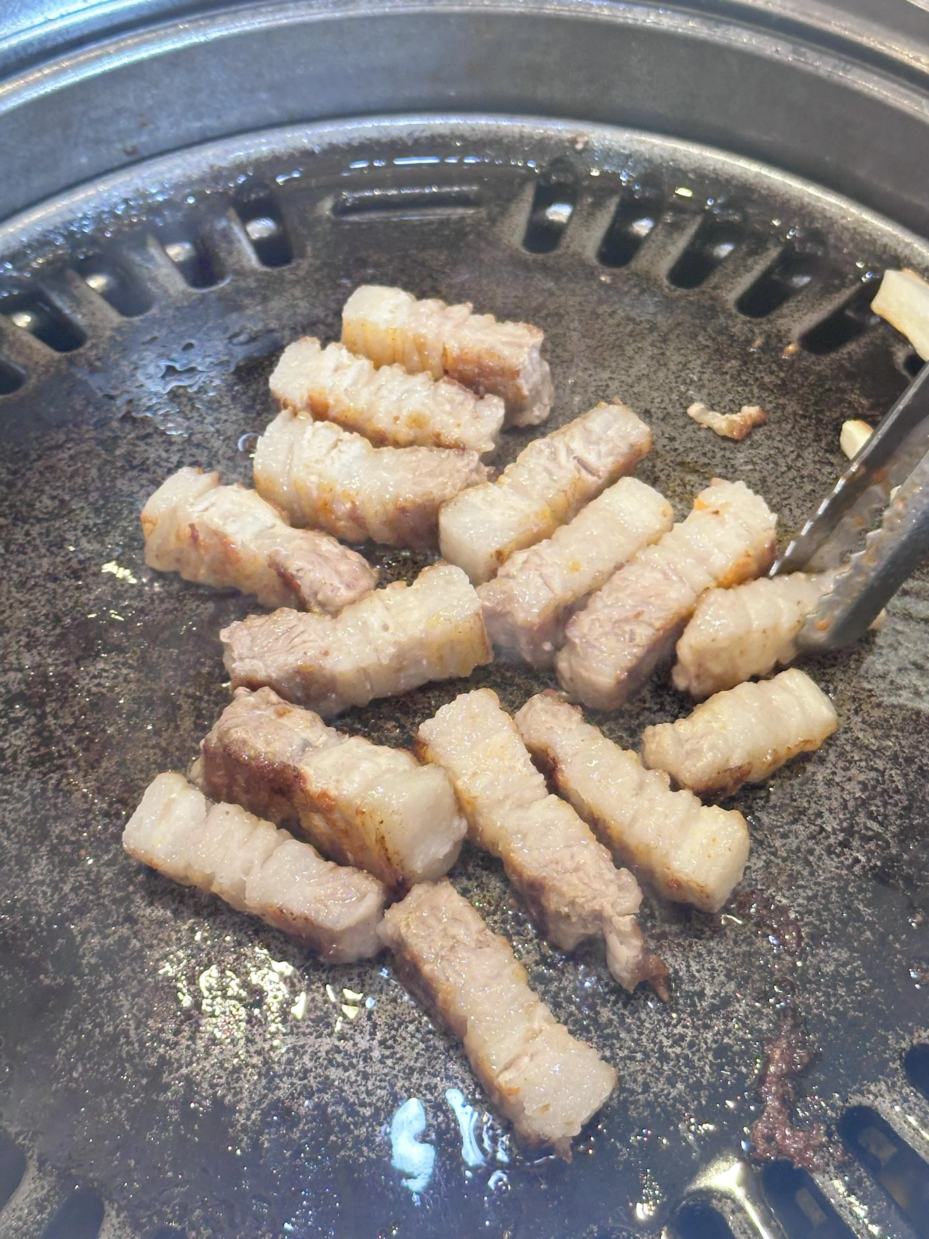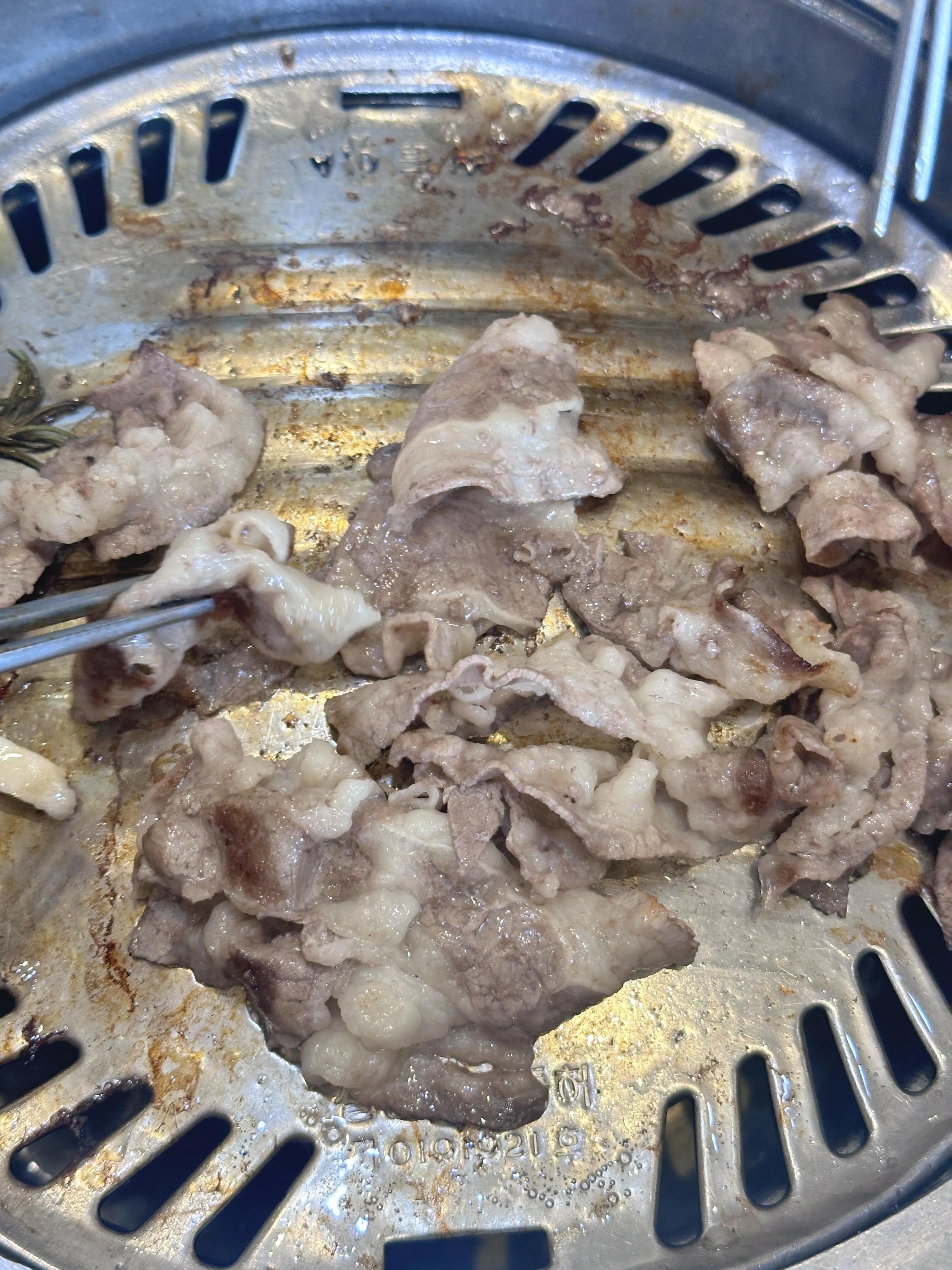 韩香福烤肉庄园是此次美食之旅的第一站。 这里的 烤牛五花肉绝对是必点菜品,肉质鲜嫩 ,完全不会觉得皮,有点像肥牛,值得推荐。烤厚切猪五花肉也不错,但稍微有点皮,感觉有点像牛排,建议烤的时间短一些会更嫩。鸡腿肉则比较一般,可以考虑跳过。石锅拌饭味道普通,饭有点咸,不太推荐。相比之下,营养脊骨汤饭更值得一试,汤头鲜美,牛骨头肉香嫩可口,非常美味。