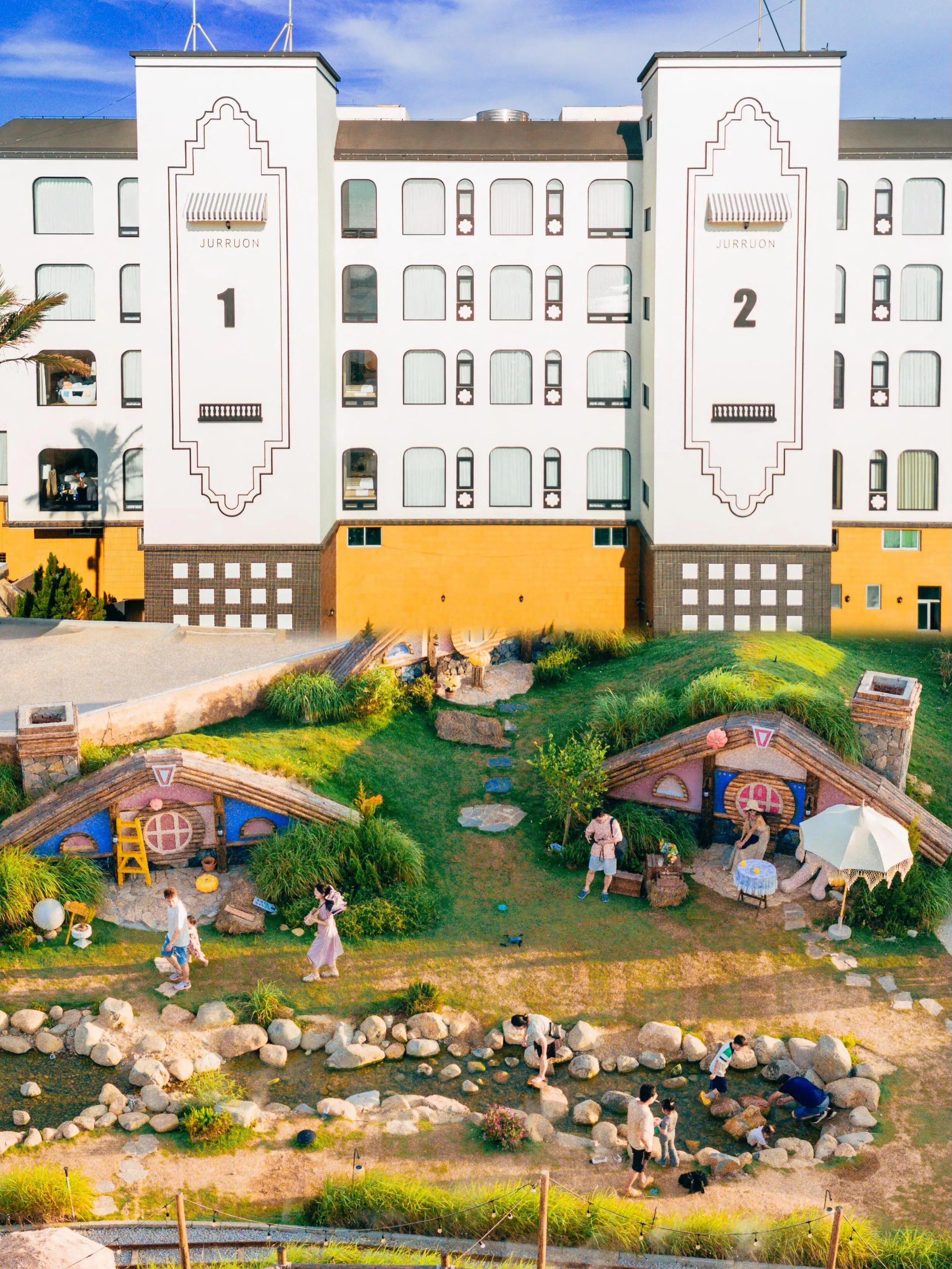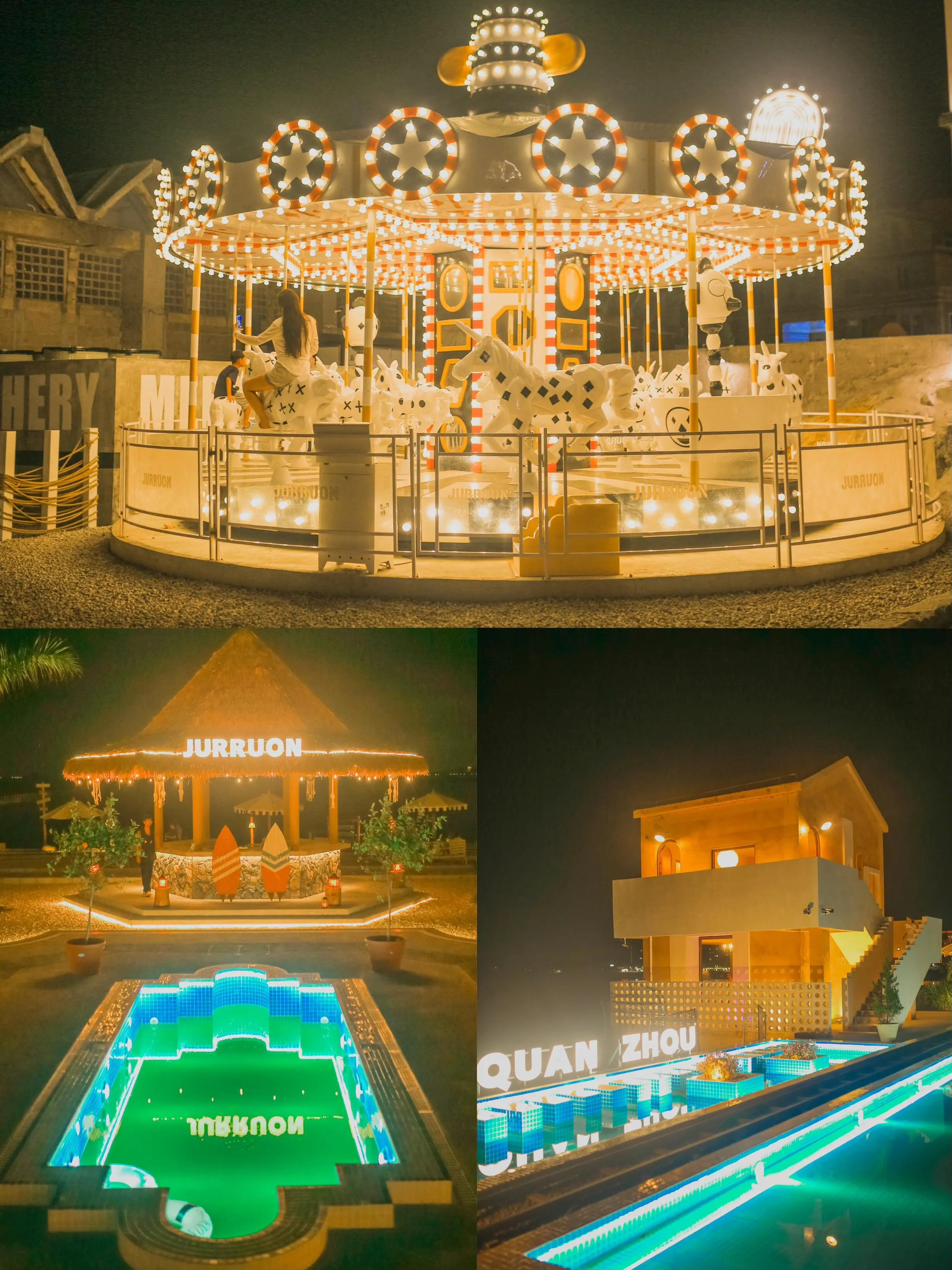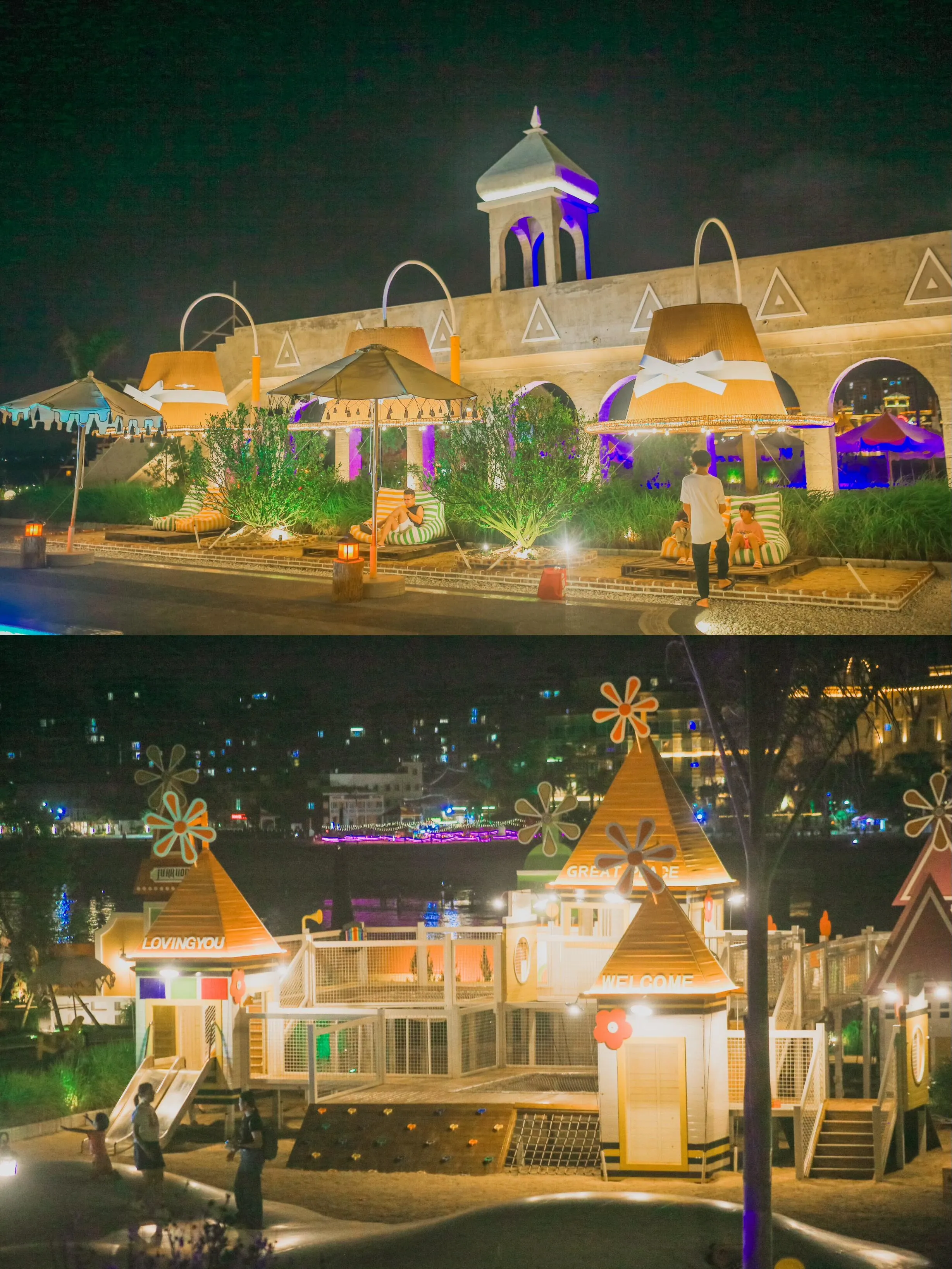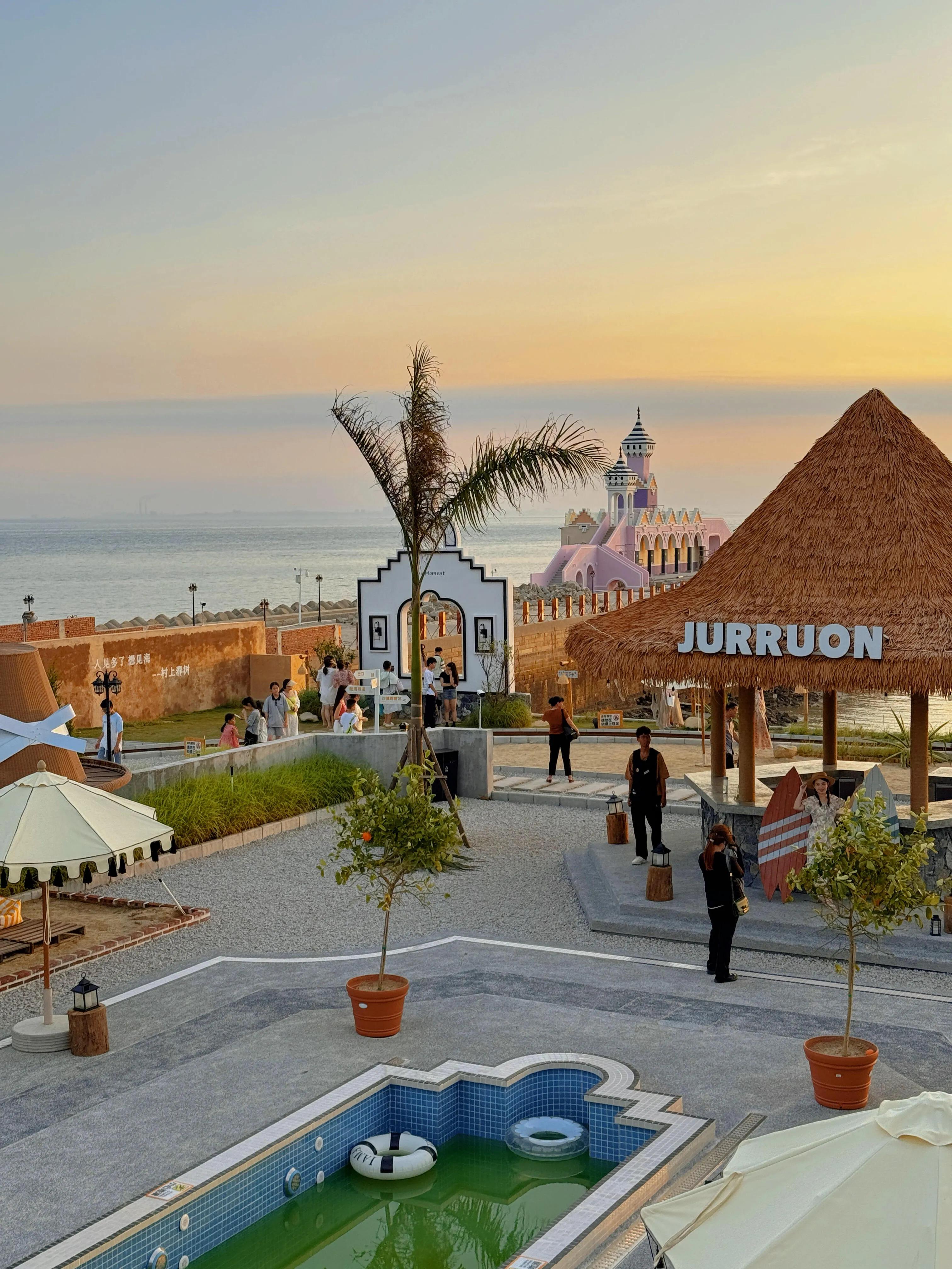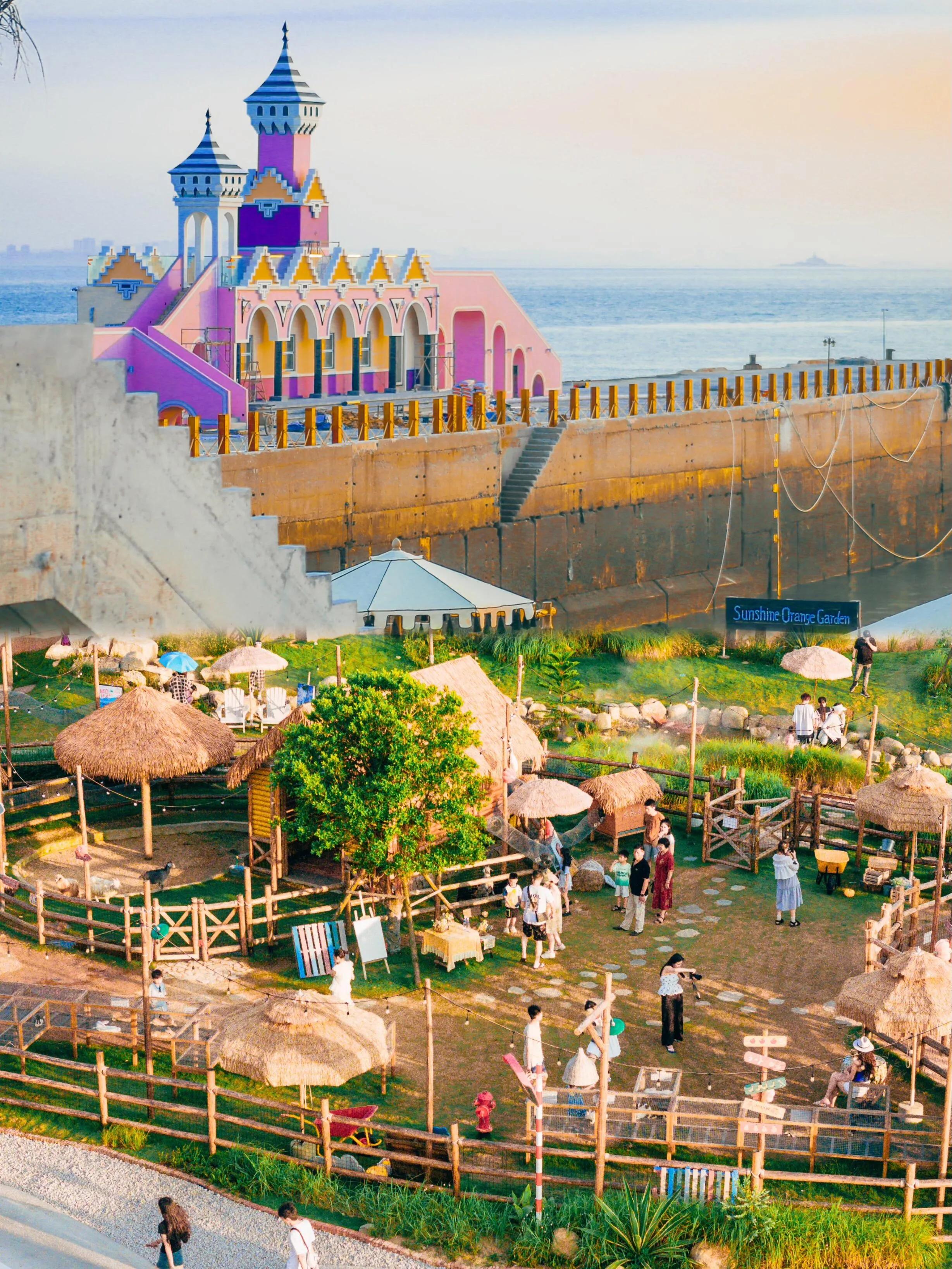 景区内的每个场景都精心设计,适合拍照。你可以在牧场喂养动物,在池塘捞鱼,坐上小火车在海边驰骋。傍晚时分,躺在沙滩椅上欣赏绝美的落日,夜晚则可以和朋友一起吹着海风,听着海浪拍打礁石的声音,在躺椅上观看户外电影,感受泉州独特的松弛感。