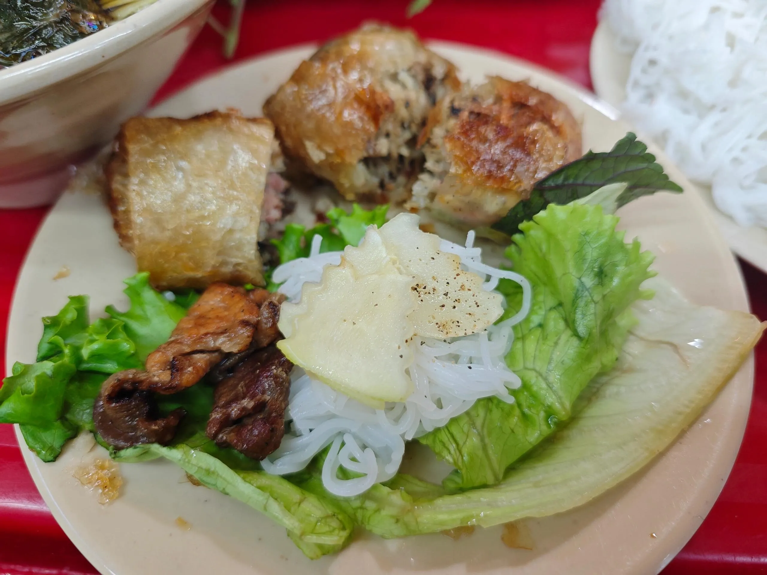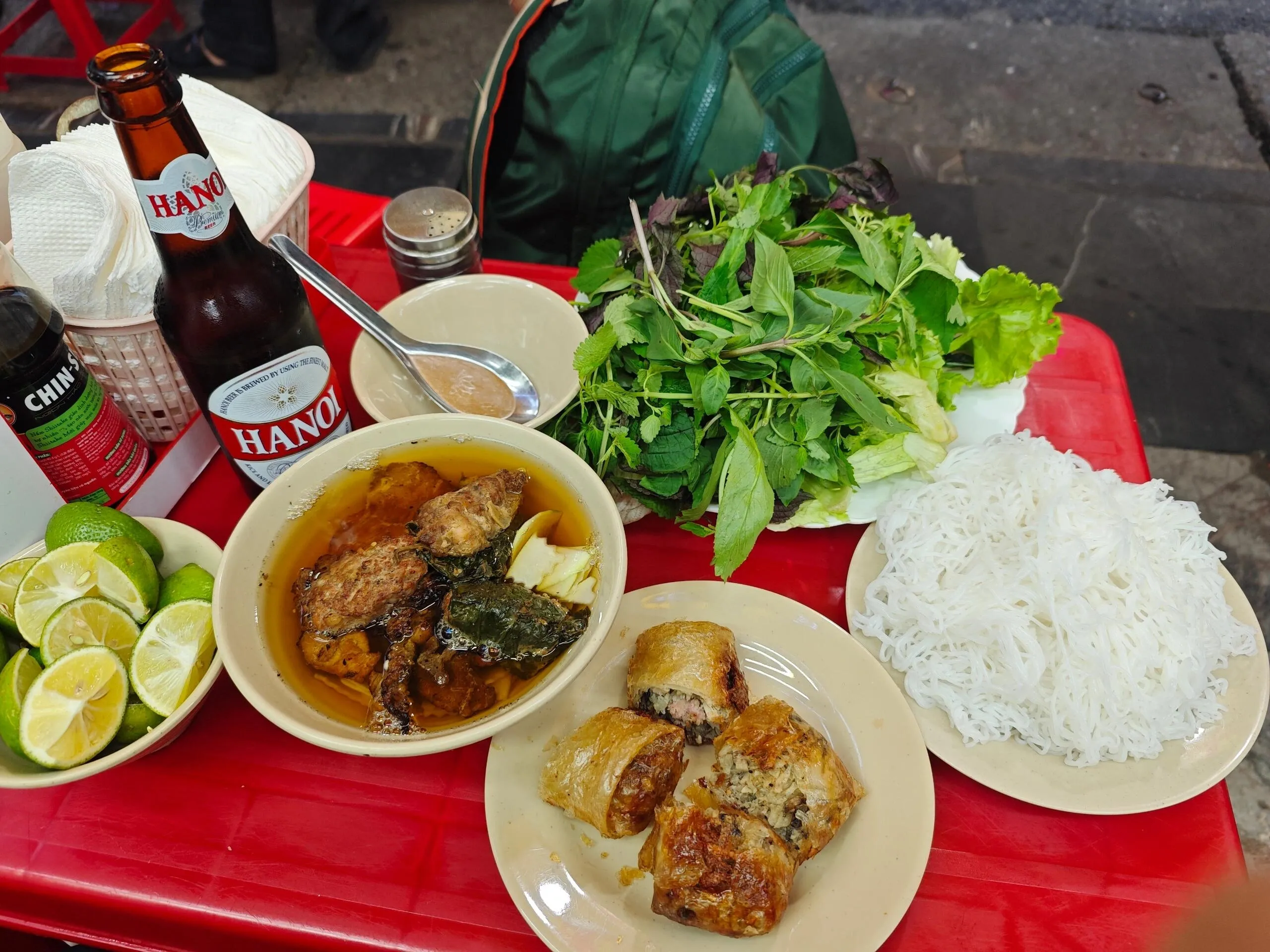 Bun Cha Dac Kim的烤肉米粉配上炸春卷和河内啤酒,是一顿完美的搭配。烤肉汤汁搭配鱼露、辣椒蒜末,味道独特。可以选择将米粉泡进肉汤,挤上青柠汁直接食用;或者用生菜叶包裹烤肉、米线和腌萝卜卷起来吃。炸春卷外皮酥脆,内陷扎实,有冬粉、炸肉和虾肉。