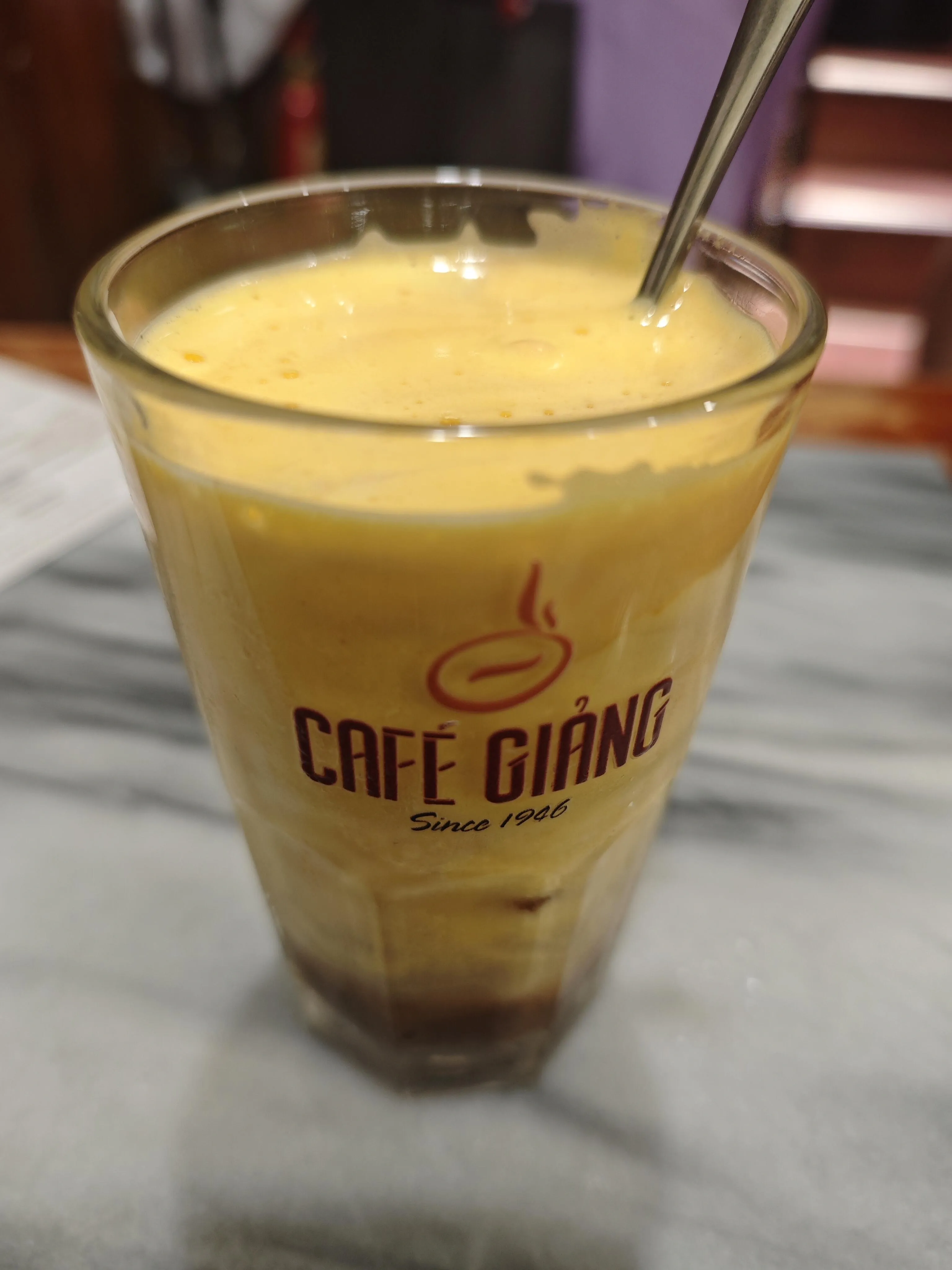 鸡蛋咖啡是河内的特色饮品,在Cafe Giảng可以品尝到正宗的鸡蛋咖啡。搅拌后外观像奶泡,入口绵密,无蛋腥味。鸡蛋与咖啡充分融合,中和了滴漏咖啡的苦味。