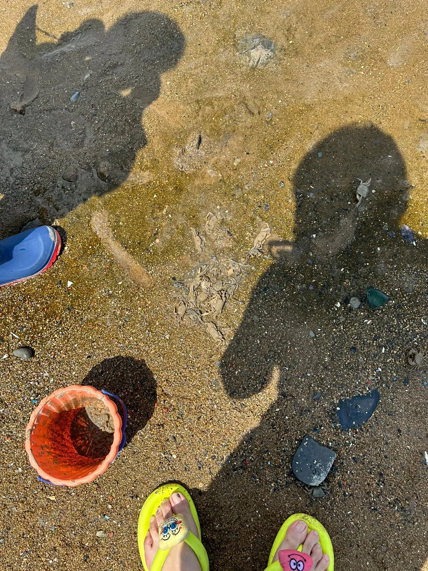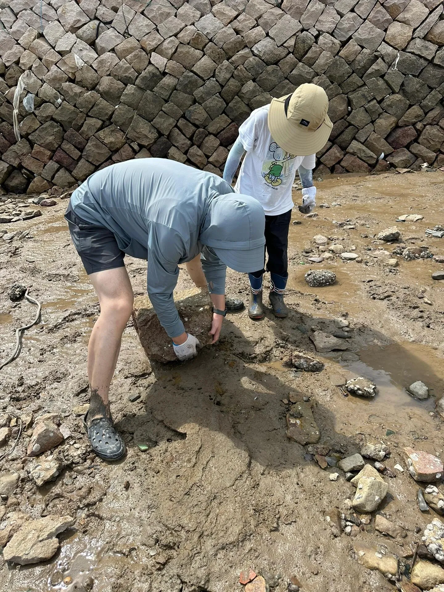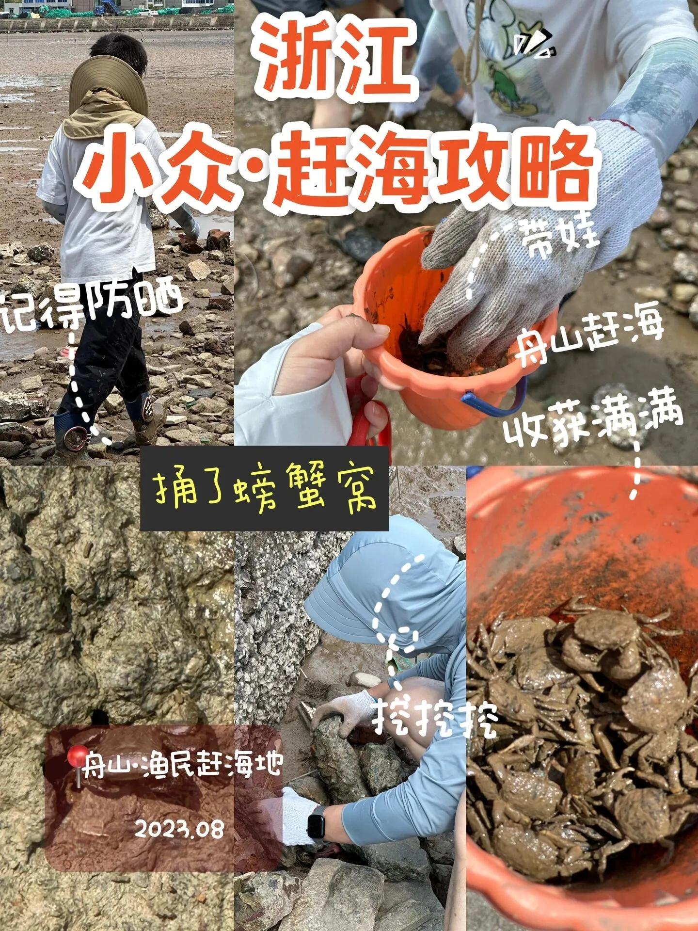 今天跟着民宿老板来到了朱家尖月岱村的一处海滩赶海。这里需要翻过山头才能到达,但设施还算齐全,有停车场和洗手间,带孩子来很方便。