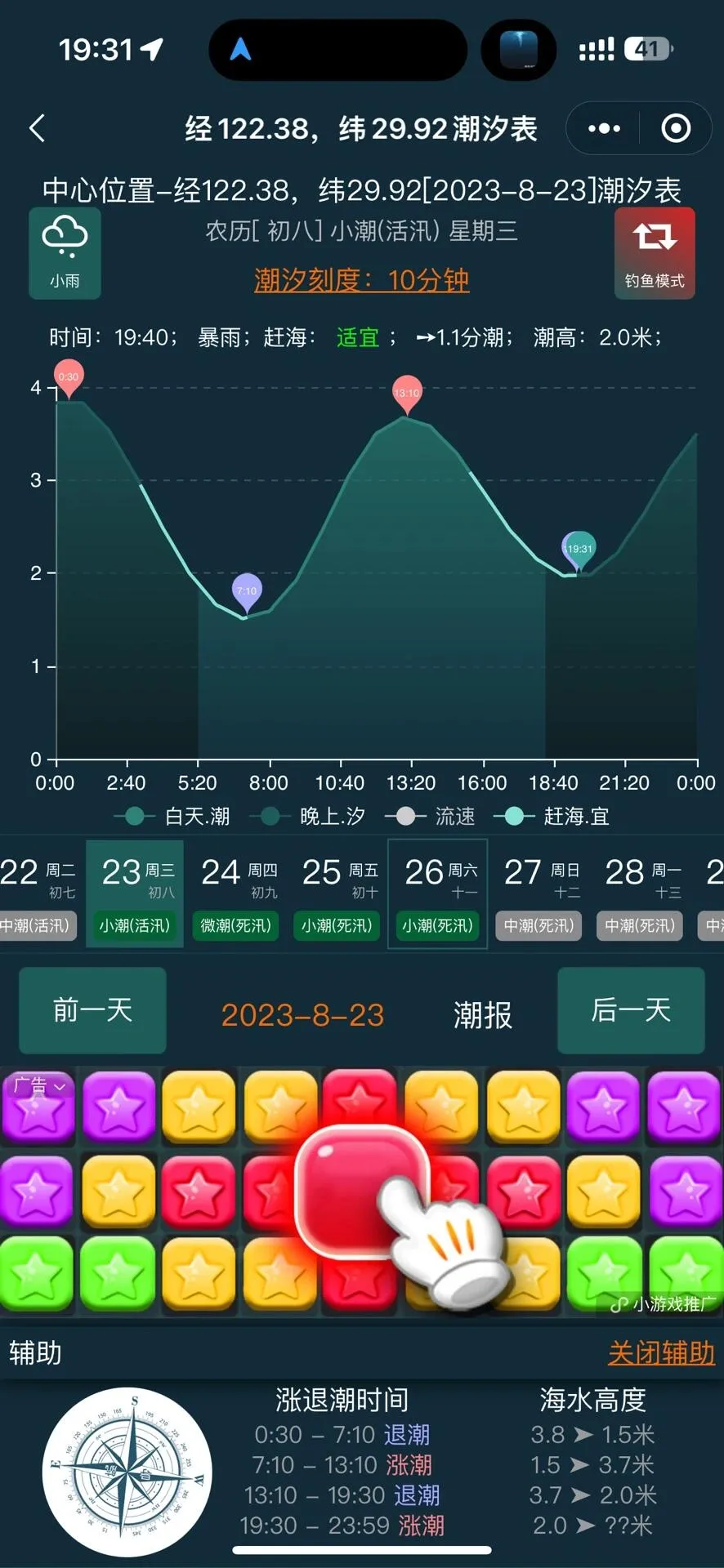 潮汐图对新手非常重要。我们用的是“潮汐图”小程序,可以查看退潮时间等信息。一定要在退潮时来赶海,并及时观察潮水变化,注意安全。