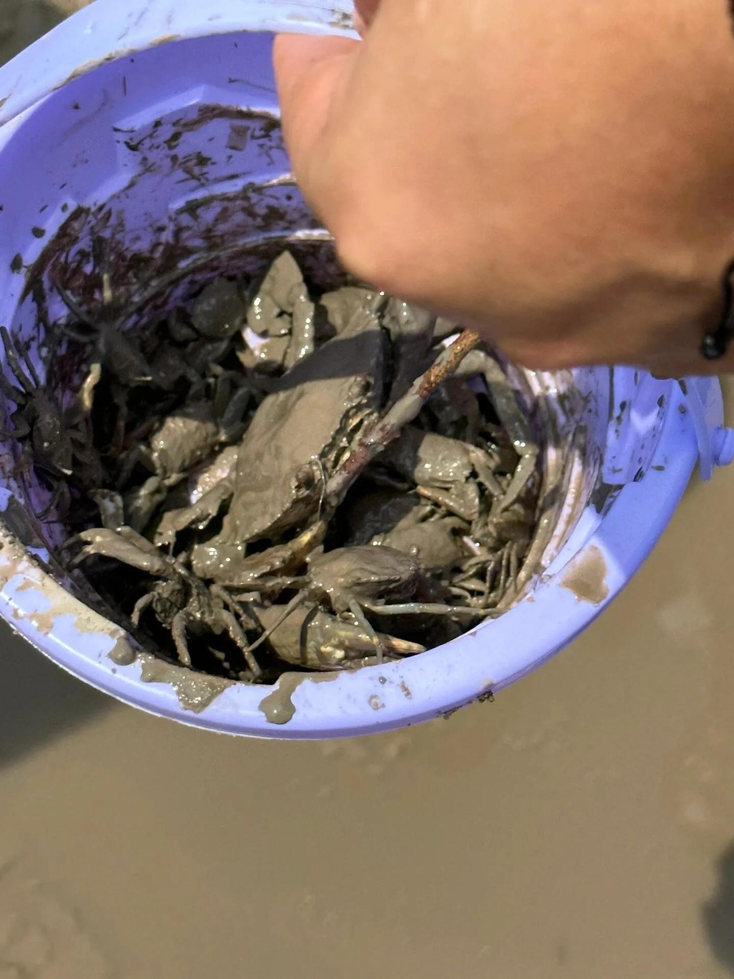 我们这次收获颇丰,满满一箩的螃蟹,隔壁还抓到了二两重的大青蟹,那钳子看着就挺吓人的。