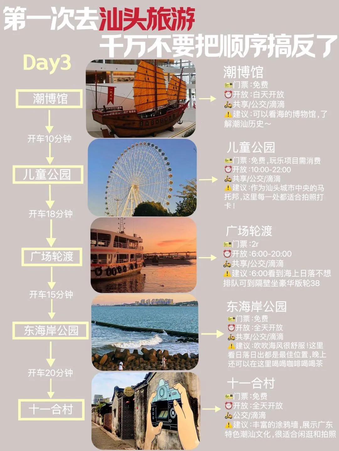 早上参观潮博馆,深入了解潮汕文化。随后带孩子们去儿童公园玩耍。中午乘坐广场轮渡,感受水上风光。下午游览东海岸公园,欣赏海滨景色。最后到十一合村,体验当地的乡村生活。