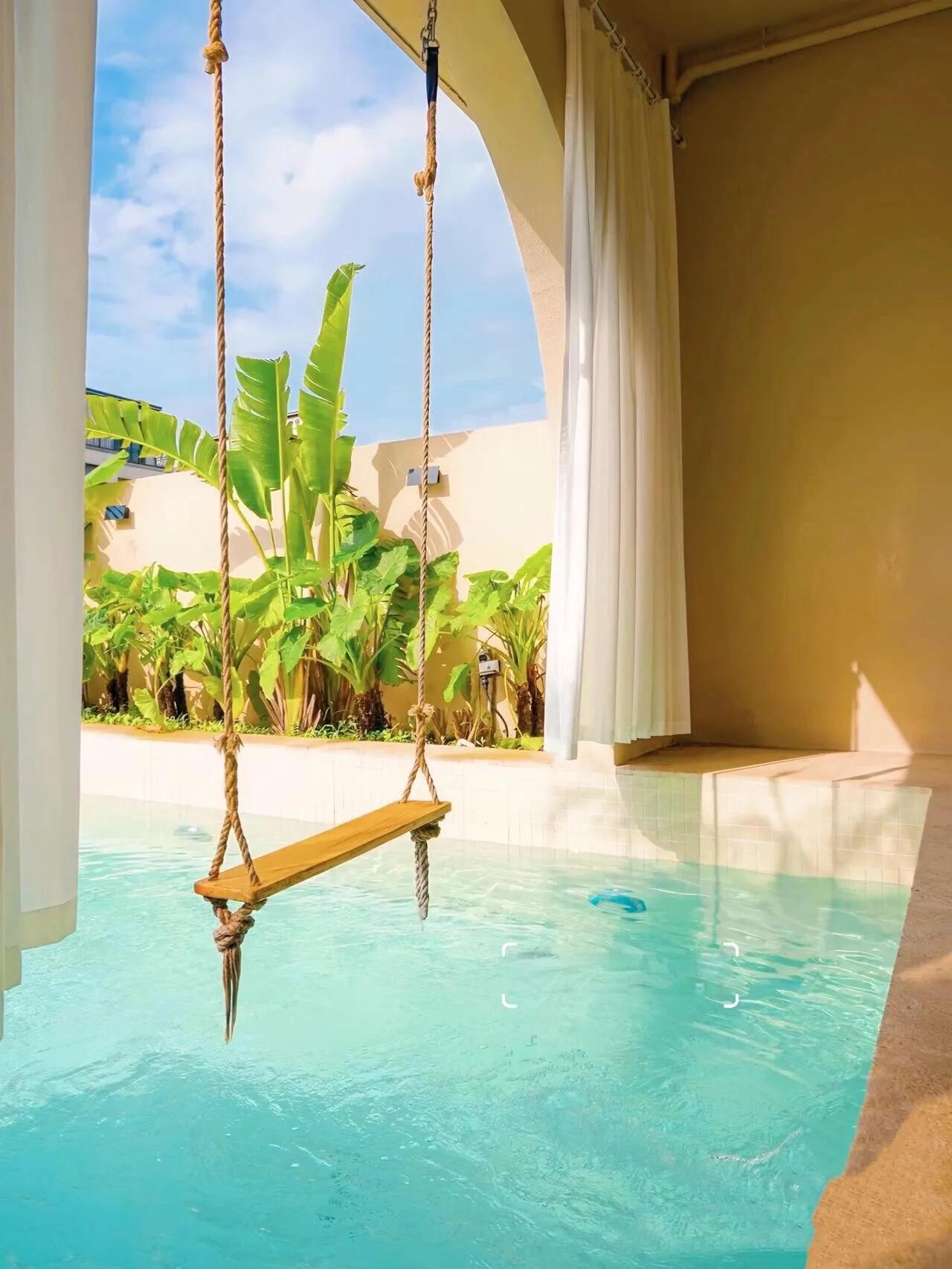 别墅的庭院充满异国风情,配有户外桌椅、烧烤炉和水上荡秋千等设施。晚上可以举办烧烤派对,吃得热了还可以直接跳进泳池里清凉一下,非常舒适。