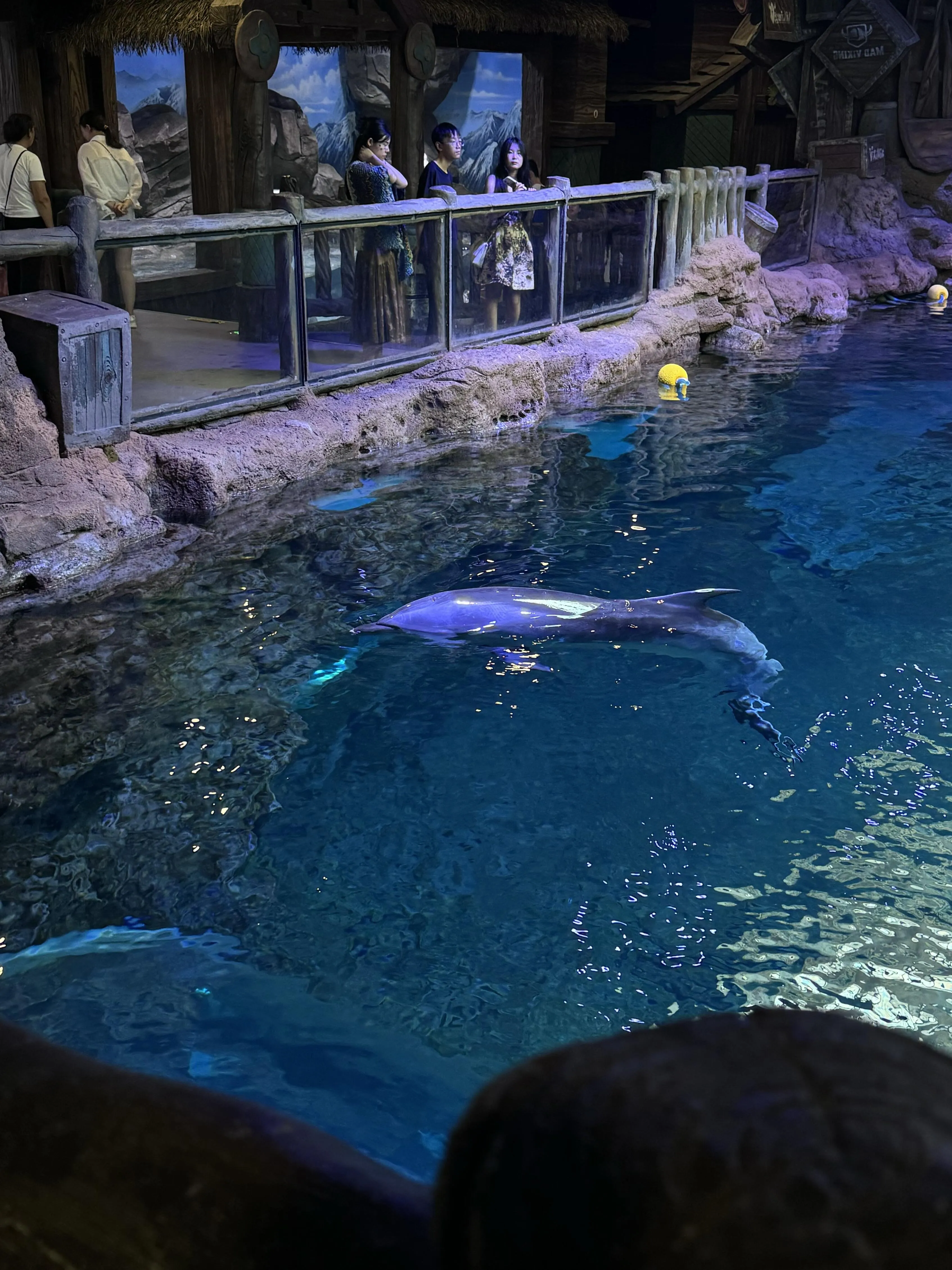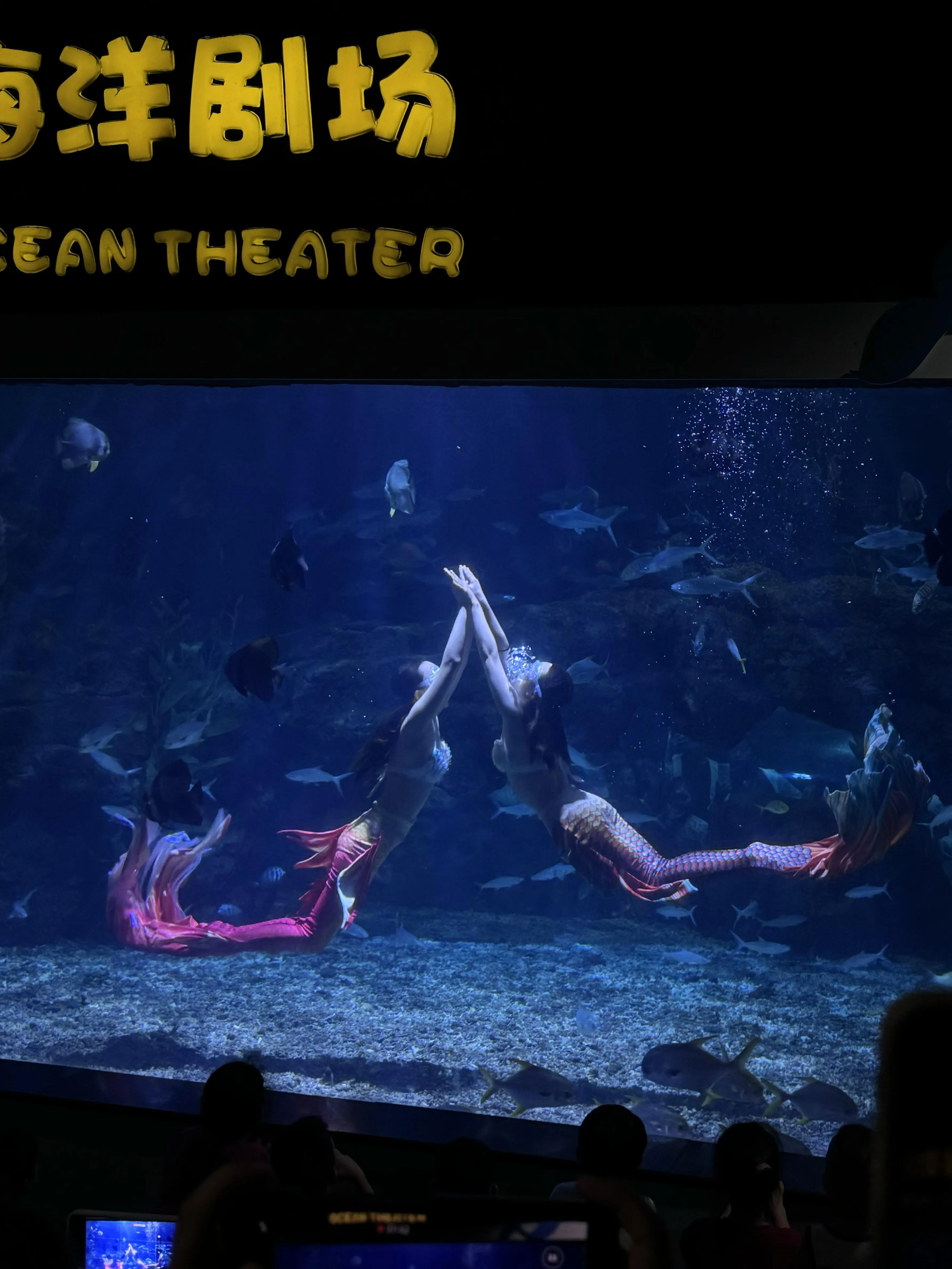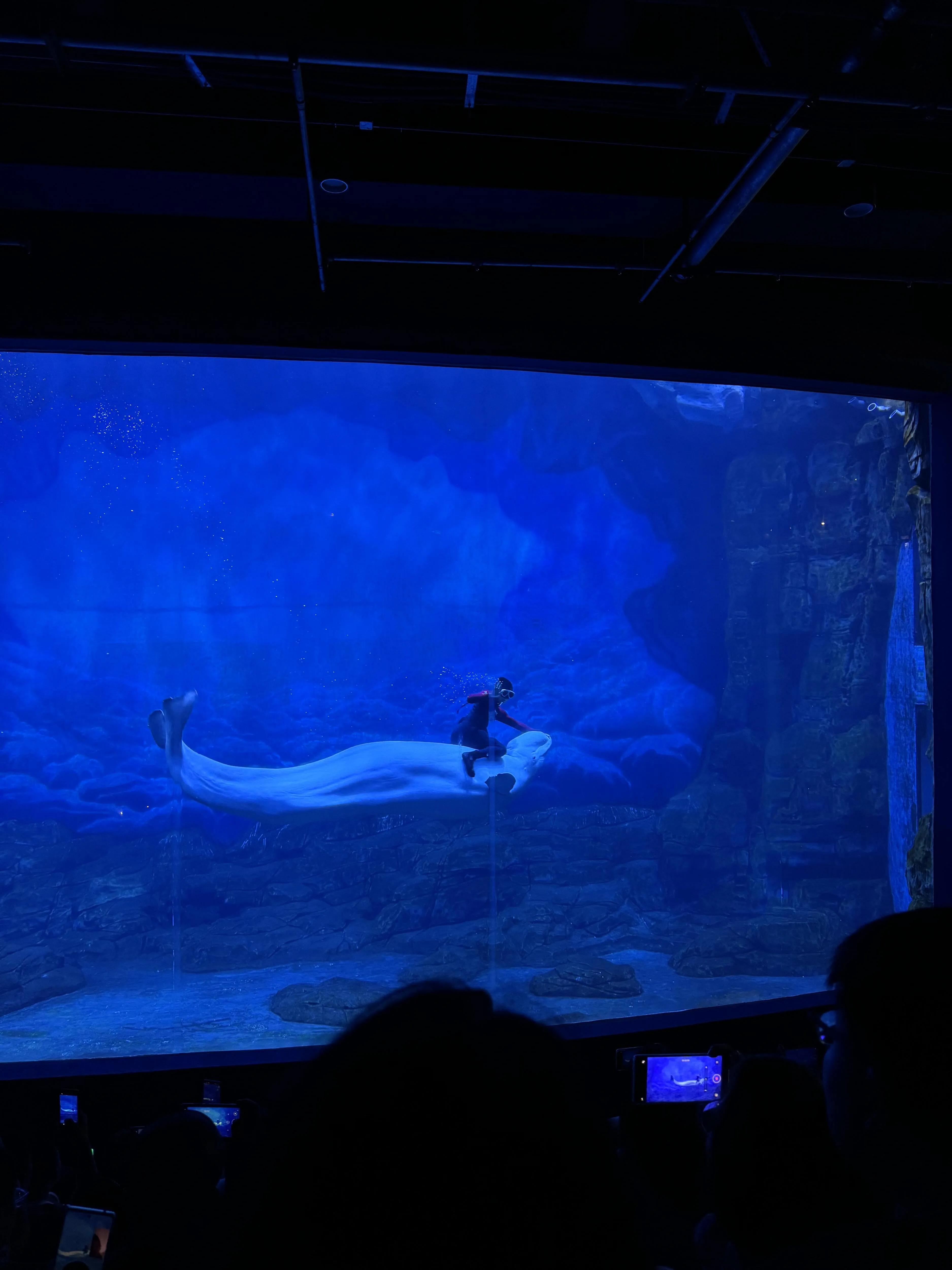 海洋馆的表演是一大亮点。美人鱼水秀表演终于能在眼前亲眼看到了,之前只能在网上看到。人鲸之恋表演也很精彩,有各种造型。不过要注意,演出一定要提前15-30分钟去抢座位,不然可能连站的地方都没有。