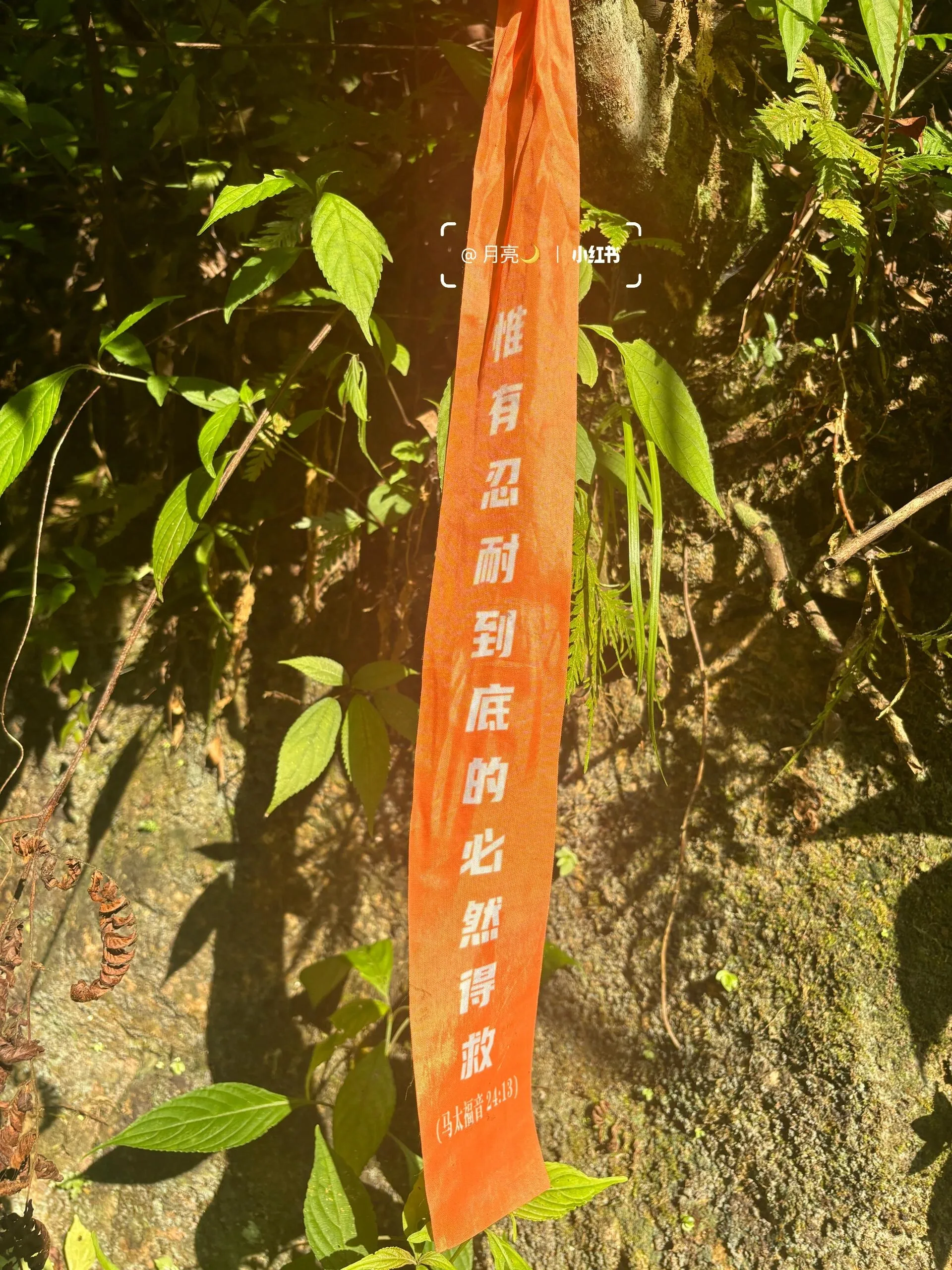 沿途都有专业团队挂的飘带,跟着飘带走就不会迷路。其中一条飘带上写着“ 惟有忍耐到底的必然得救 ”,这句话不仅适用于徒步,也适用于人生。