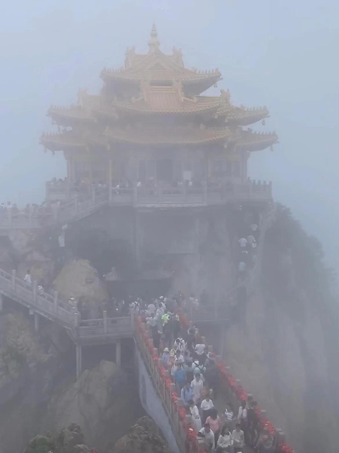 今日老君山小雨,山下温度17℃~28℃,山顶温度6℃~15℃。目前没有下雨,但十里画屏大雾影响观景,金顶道观群可见度不高。
