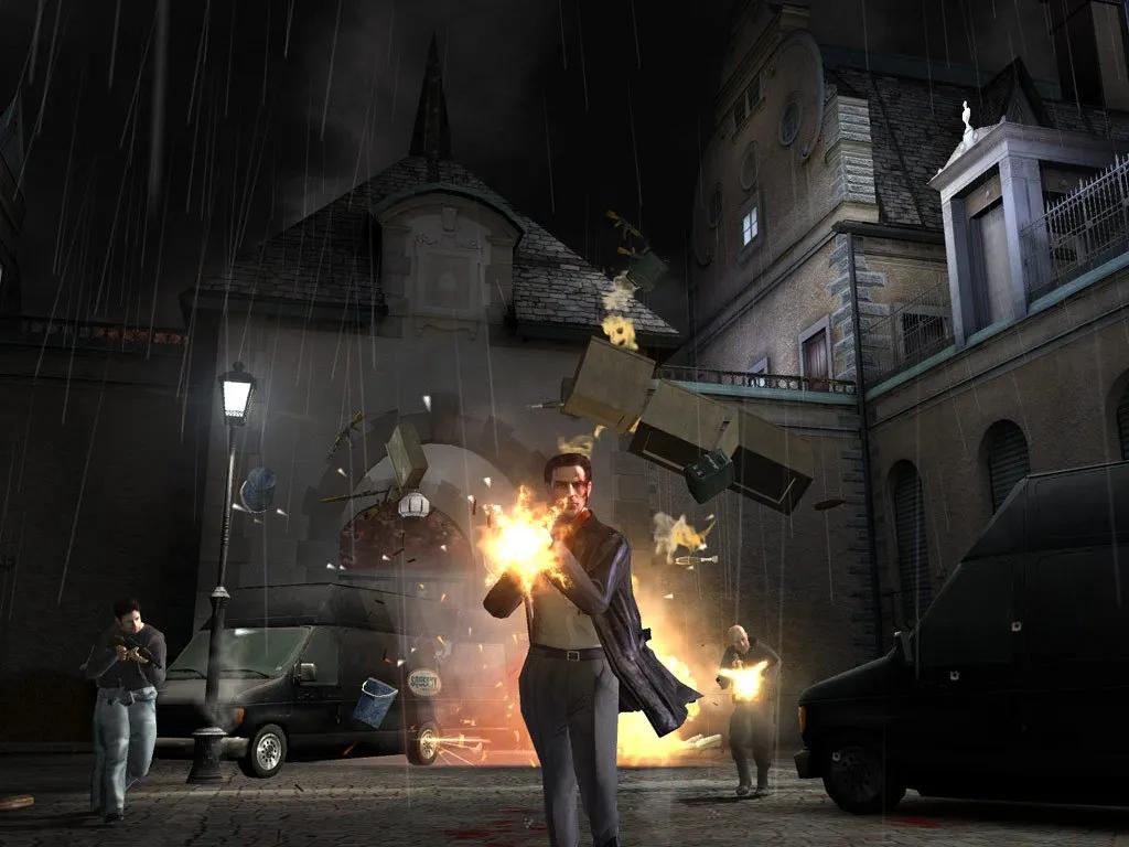 游戏的开场就充满了电影质感。玩家扮演的主角马克思·佩恩,一位饱经沧桑的纽约警探,独自一人站在雨中,回忆着过去的悲剧。这个场景不仅营造出浓厚的黑色电影氛围,也为整个游戏奠定了基调。随着剧情推进,游戏通过精心设计的镜头语言,如俯视、仰视、推拉等运镜手法,让玩家仿佛置身于一部精心制作的电影之中。
