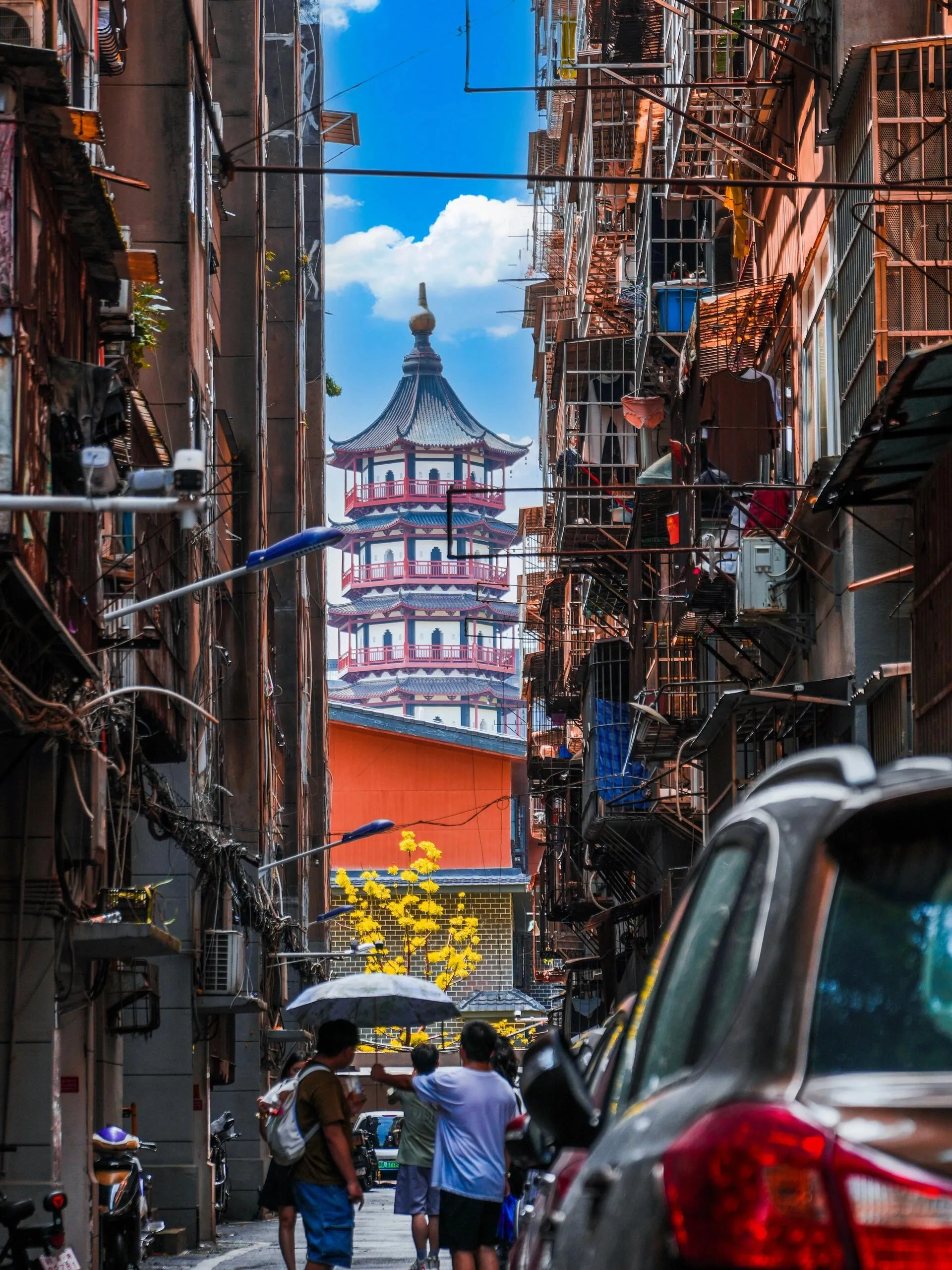 绳金塔的拍摄机位在会堂侧路的居民巷子里,很容易找到。也可以直接导航到“张小林废品店”。从地铁3号线绳金塔站步行约300米即可到达。绳金塔历史文化街区也值得一逛,同样从3号线绳金塔站出来就能到达。
