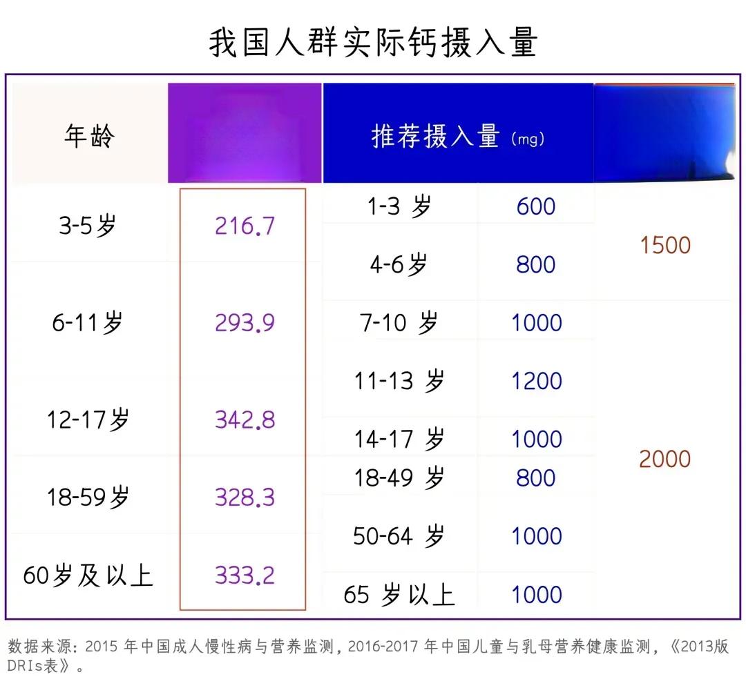 在我国,各年龄段人群的平均钙摄入量远未达到推荐标准,部分年龄段的摄入量甚至仅为推荐值的
