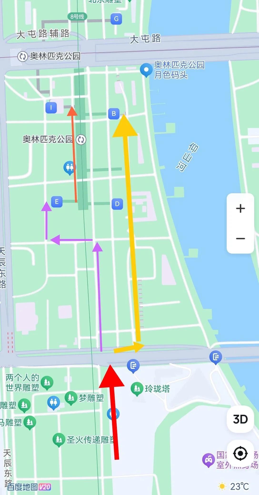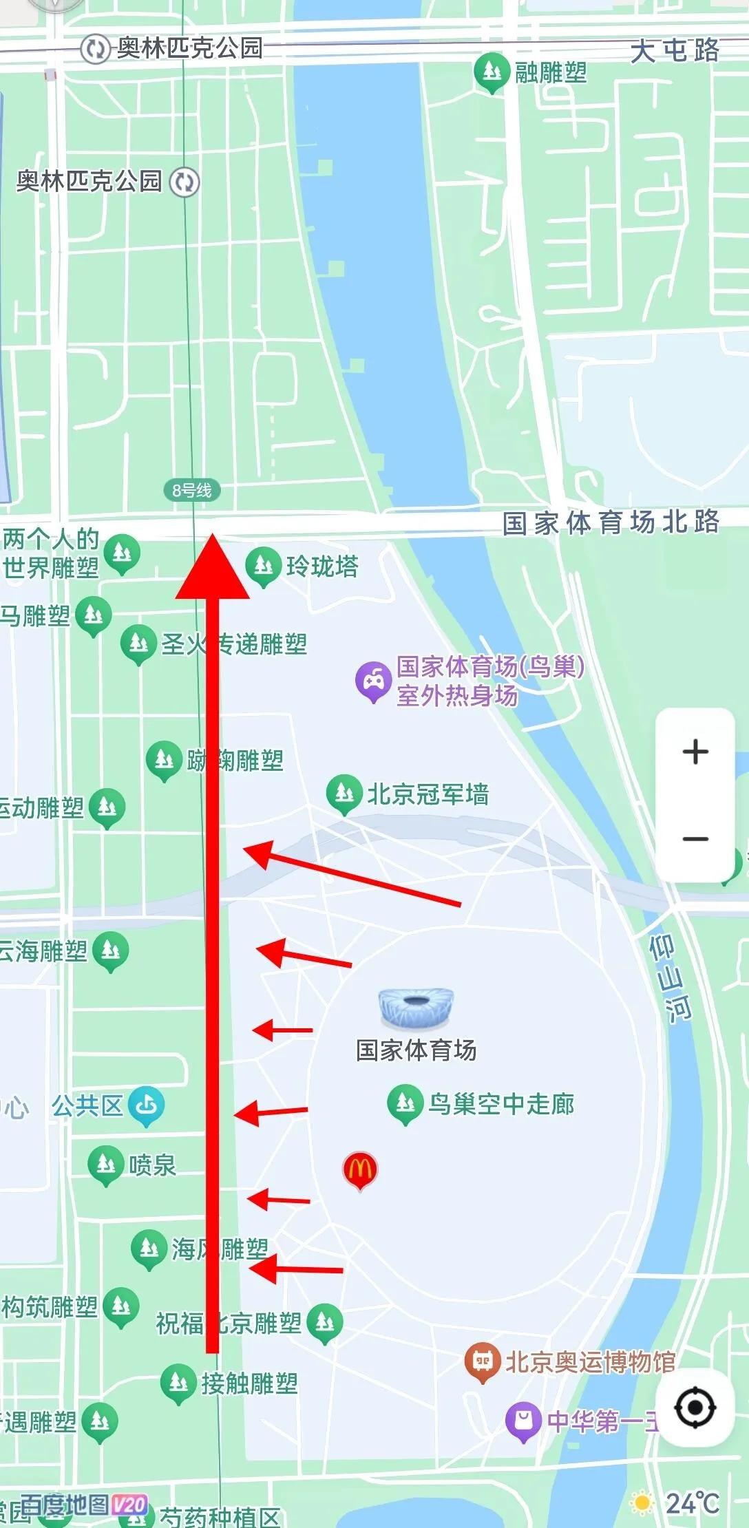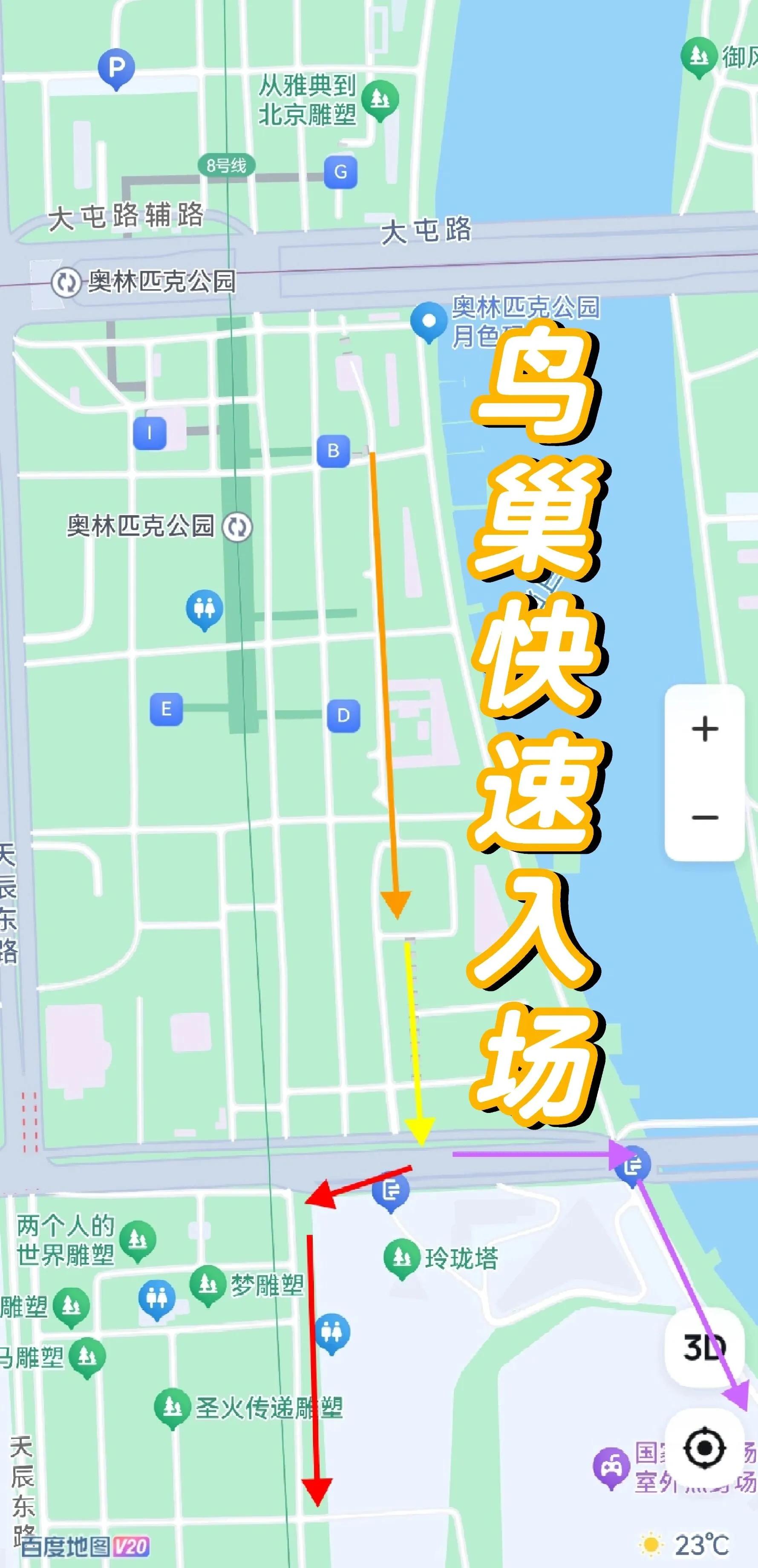 退场路线:跟随人群沿指示路线行进,经过鸟巢和水立方之间的大路,回到玲珑塔下。建议走人少的纯地面路线到达E口,然后下楼梯。