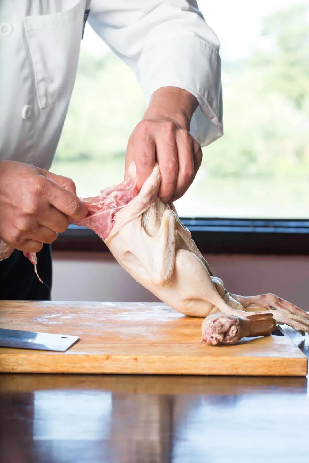 要从三只禽类的翅膀下面的小伤口进刀,将骨头全部拆除,而表皮不能破损,取出的骨头和部分肉必须保持外面完好。