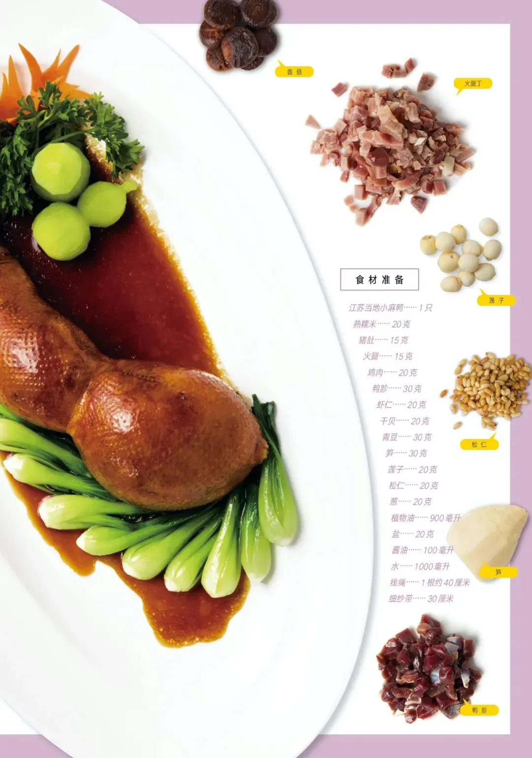 本文介绍的扬州八宝鸭,使用的是当地高邮湖的麻鸭,以半年以上大的为佳,肉质既不能太肥也不能太瘦。