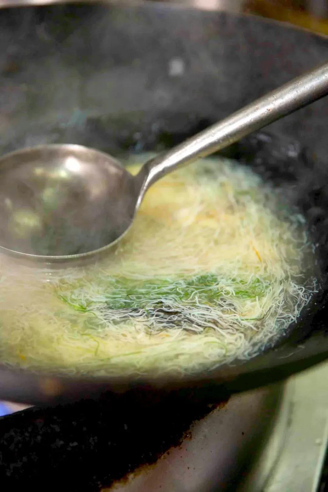 这时,你会看到厨师如何紧张地用勺子轻轻在汤面上搅拌,等到豆腐丝全部浮上来,这道菜才能端上桌面。