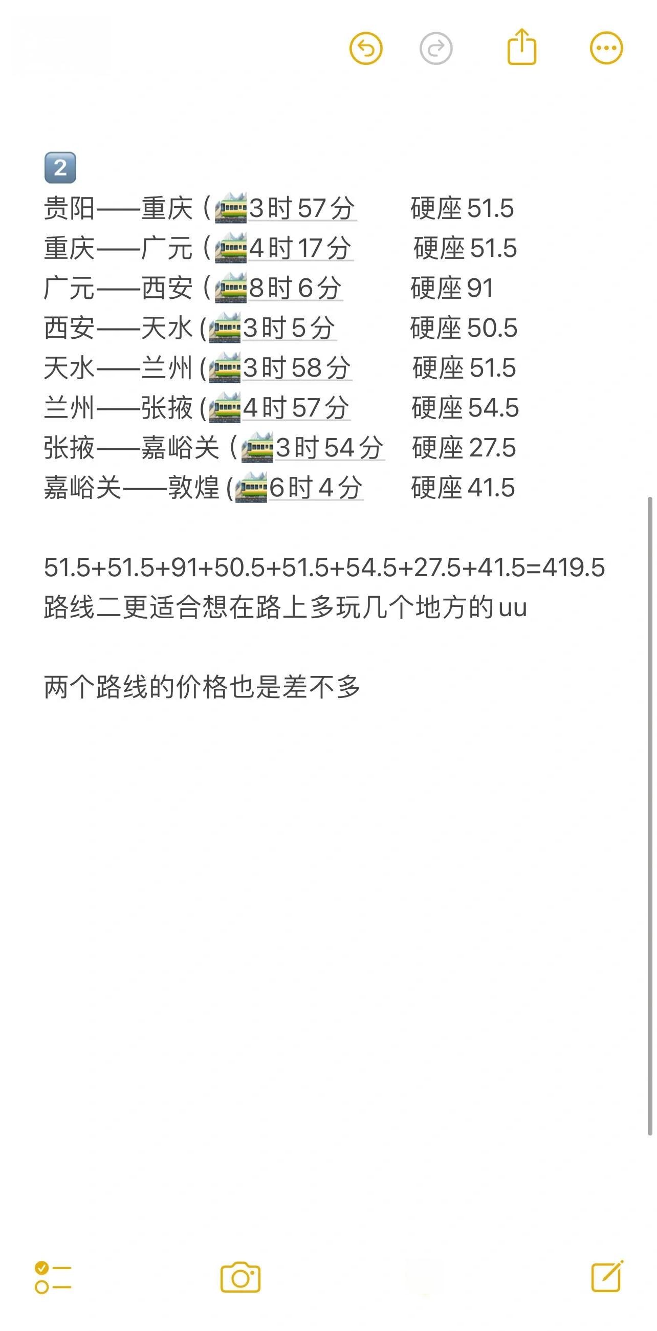 两条路线的总价格相差不大,可以根据个人喜好和时间安排选择。路线一借鉴了其他网友的经验,适合快速到达目的地;路线二则更适合想要体验沿途风景和城市的旅行者。
