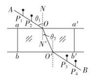 在玻璃砖一侧插入两枚大头针(P1和P2),调整位置直到透过玻璃砖看到P2恰好挡住P1。