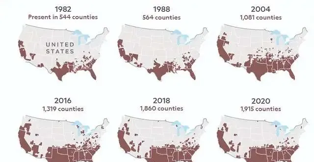 1982年以来,美国野猪分布图