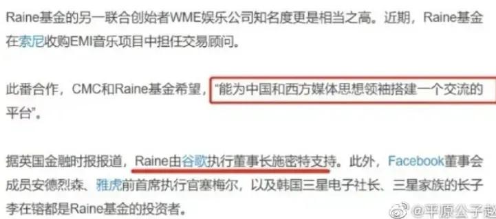 这个被称为“华人文化”的基金与美国的Raine基金存在战略合作关系,Raine基金到底是什么,大家无需过多了解,只需明了其背后有谷歌执行董事长埃里克·施密特的支持,曾成功助长过埃及的颜色革命,其战略目标是: