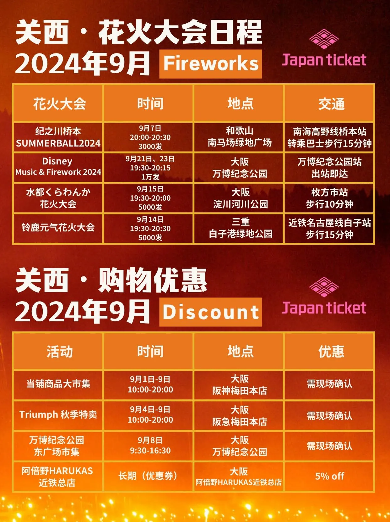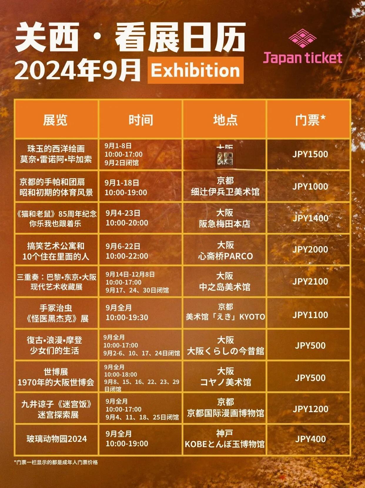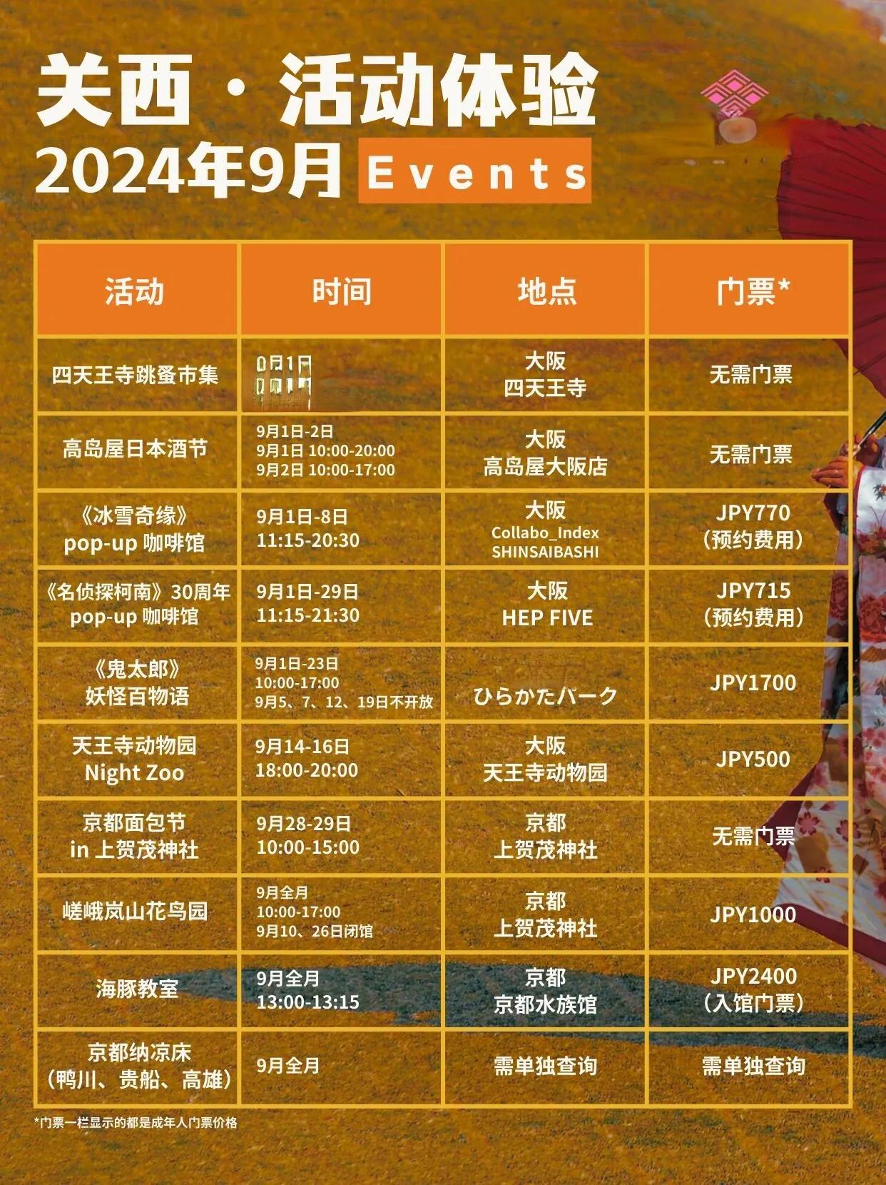 活动按照时间顺序整理,详细标注了休息日、交通和门票的信息。如果你打算9月来关西旅行,可以用这份攻略完善行程。没做攻略的朋友也可以直接参考。