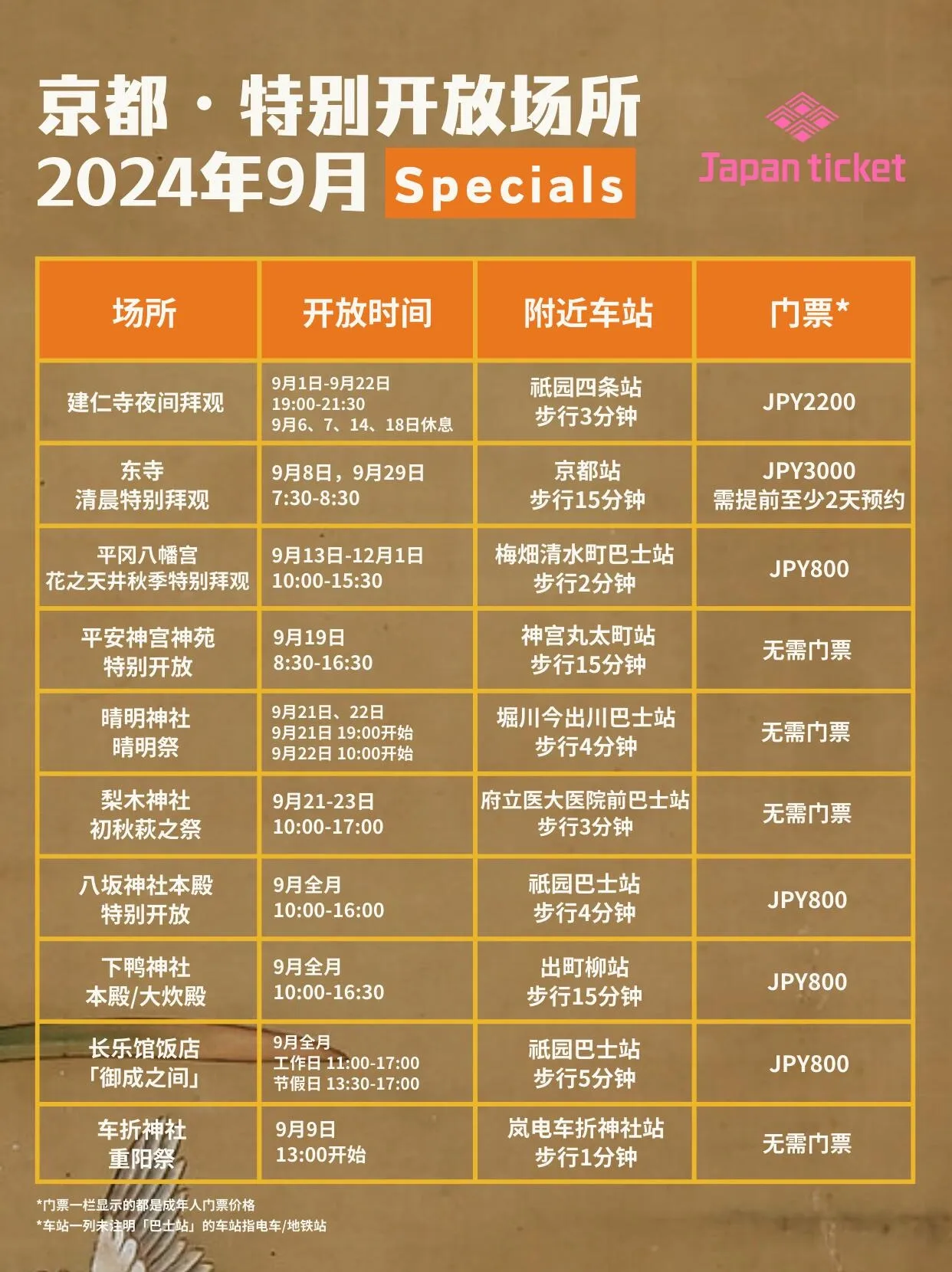 • 日本的「夏天」结束于日历上的秋分日(今年是9月22日),所以不少夏天相关的活动会在这天结束。京都的夏季特别开放场所是非常难得可以进入一些平常不开放的古迹/名建筑参观的机会,请大家抓紧时间。