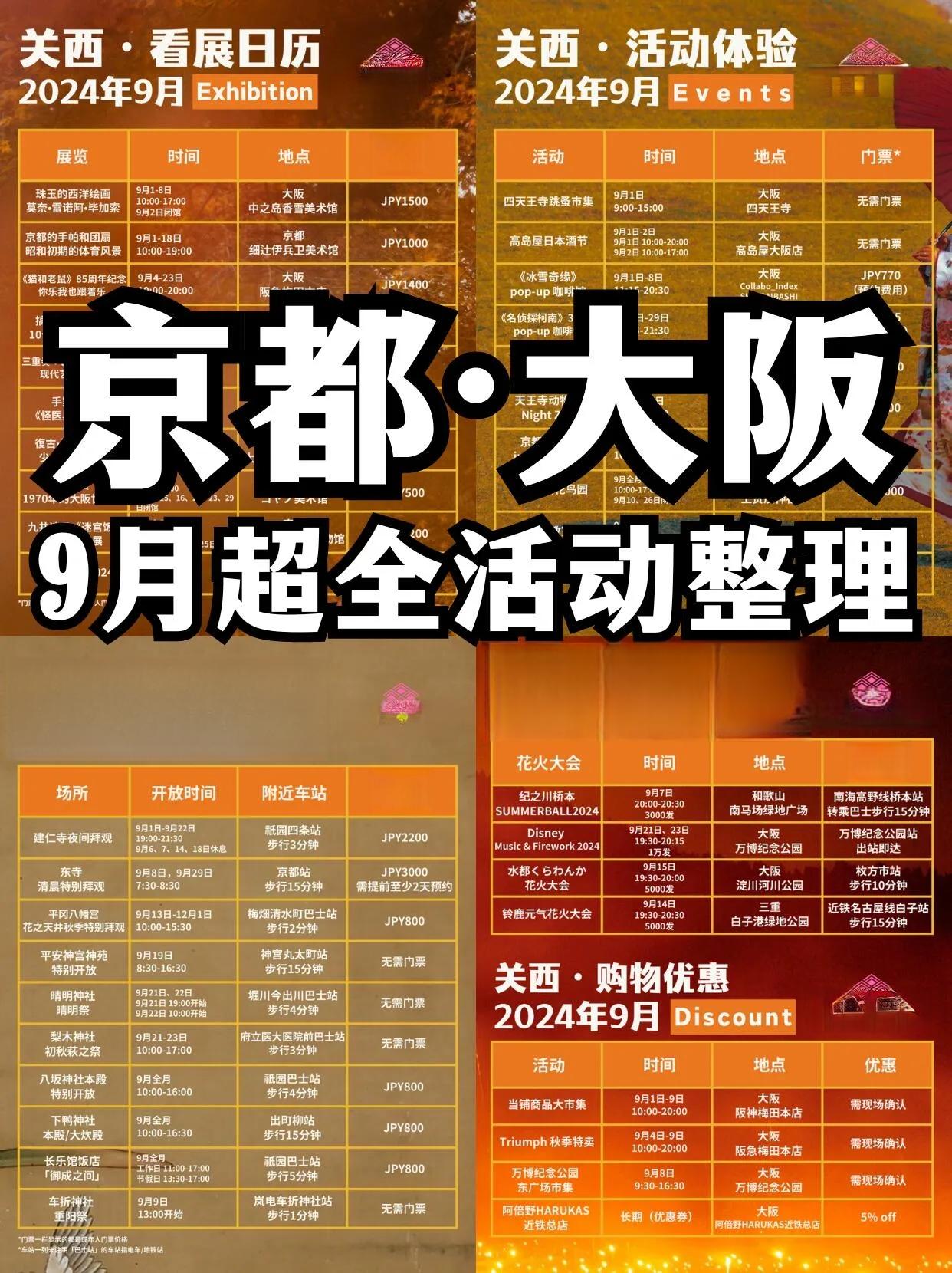 这是一份面向J人查漏补缺、P人拿来即用的关西(京都・大阪)9月旅行攻略。精选了京都大阪40+个值得且方便游客前往的活动资讯,包括艺术展讯、花火大会、市集&祭典、购物优惠等信息,基本涵盖了具有日本特色的各类活动。
