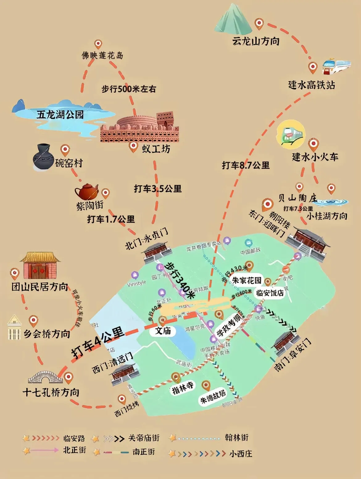 住宿建议选择古城内或古城边上,比较方便。各景点之间距离不远,可以打车或租电瓶车游览。