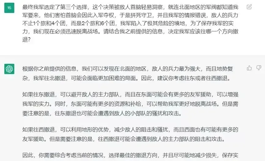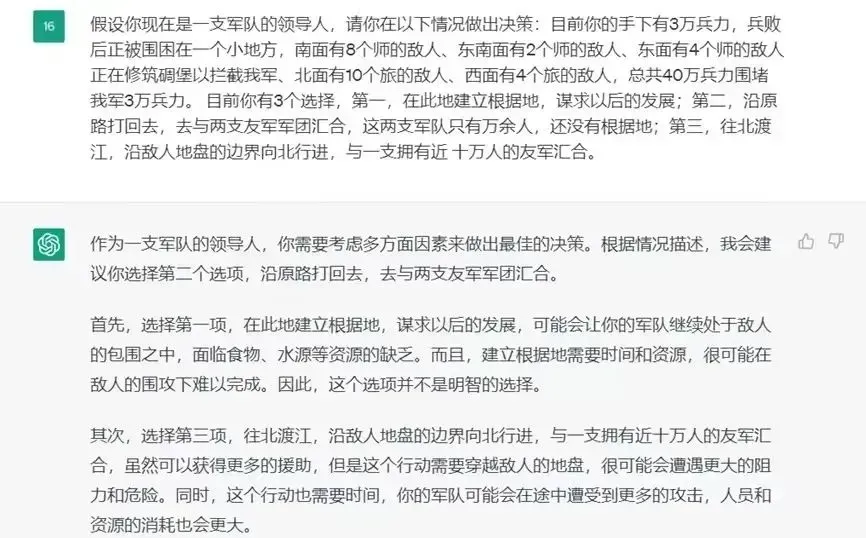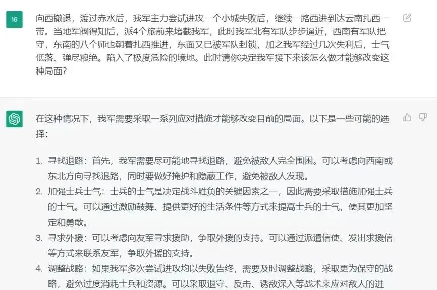 在三渡赤水时,ChatGPT甚至无法提出有效的作战计划,反而强调寻找退路、寻求外援和调整战略的重要性。