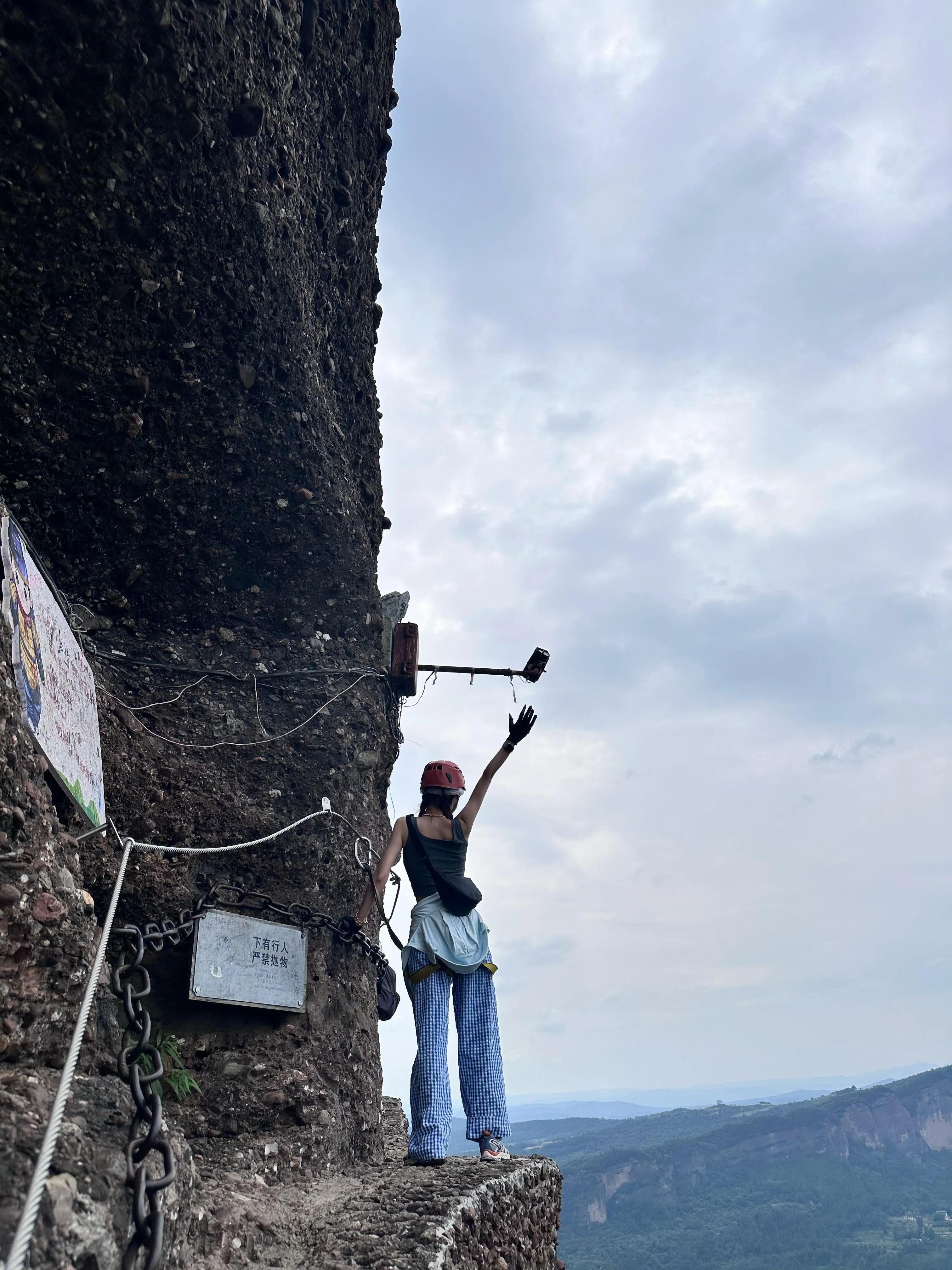 从索道开始,经猿猱道/鸟道、玻璃观景台、梁山寺、大/小穿洞、梁山亭、石笋峰、一线天、绝壁廊、雷鸣桥,最后到达关楼。这条路线的优点是坐索道后爬升较为轻松,途中能打卡众多景点。缺点是三分之二路程是下坡,可能对膝盖造成一定压力。