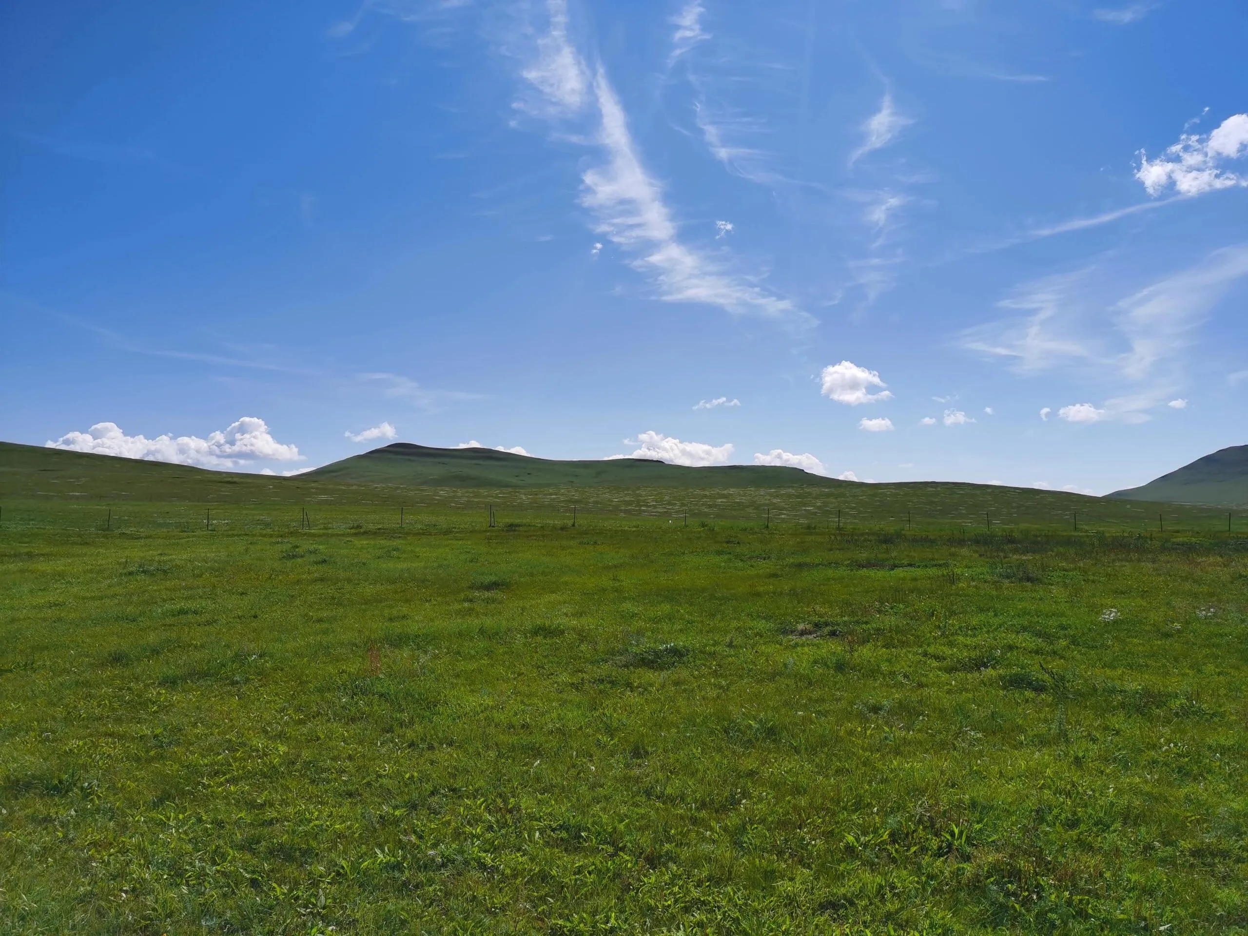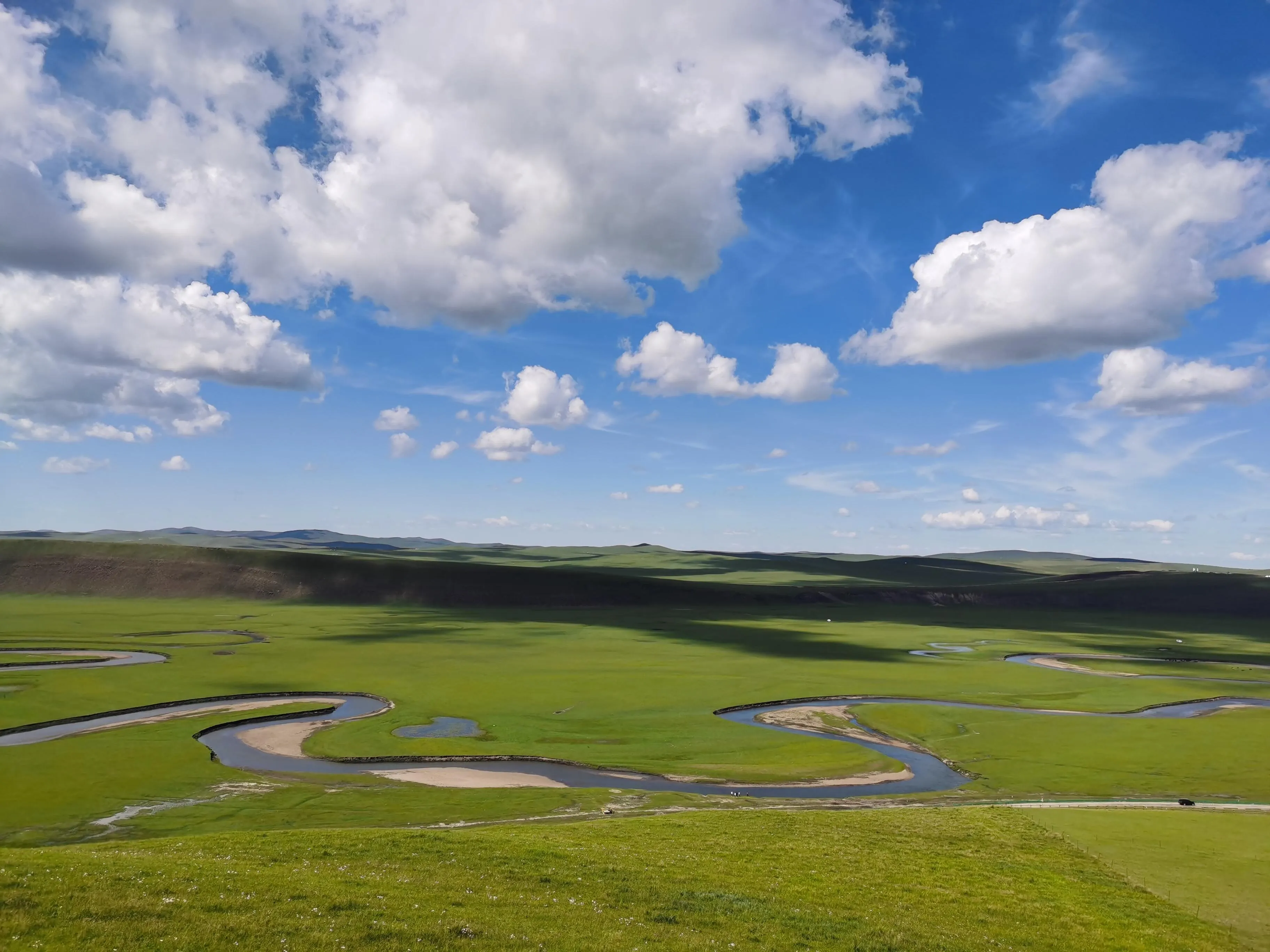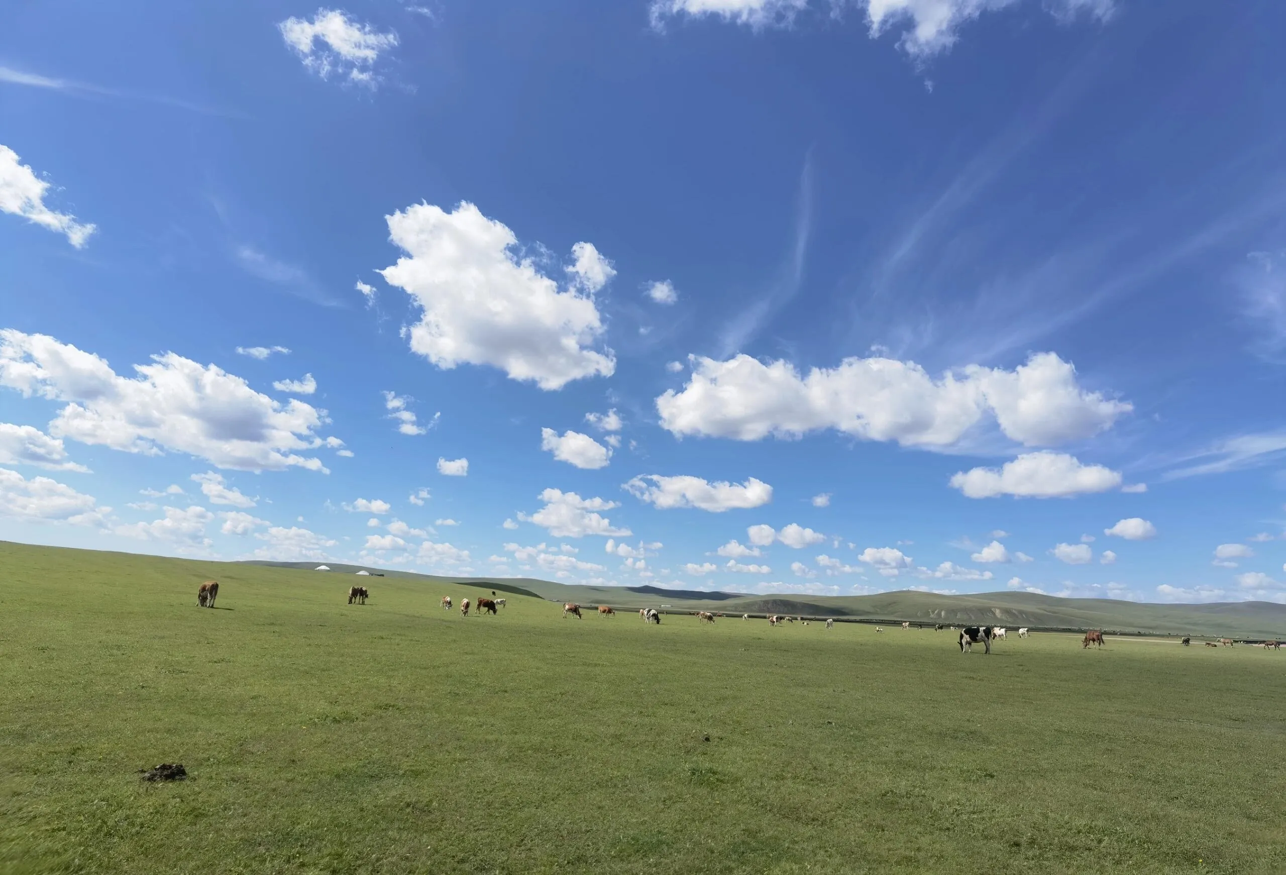 从第三观景台出发后,导航去额尔古纳市,但在遇到石子路(002乡道)时要果断右拐上山。 沿着车辙前行,很快就能进入呼伦贝尔草原的腹地。这里的景色震撼壮美,空旷而充满生机,是最纯粹的草原风光。一路上还能看到悠闲的牛马,让人忘却烦恼。这条路不仅能欣赏到最美的景色,还能节省近100公里的路程。