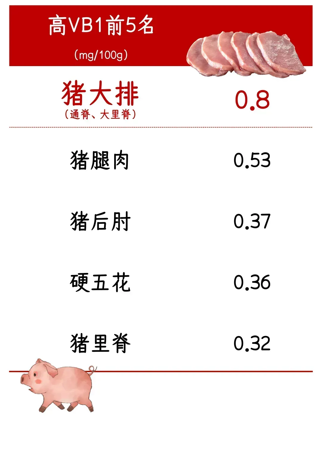 ,只需约一两(50g)的瘦猪肉便可以满足成年男女一天所需的维生素B1的20%左右,而牛肉和羊肉则难以做到。