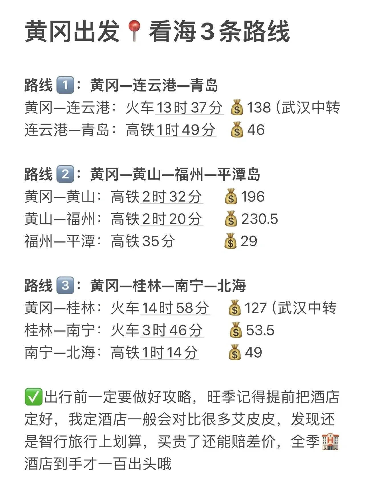 从黄冈出发,乘火车到桂林(需在武汉中转),用时14小时58分钟,票价127元。然后从桂林乘火车到南宁,用时3小时46分钟,票价53.5元。最后从南宁乘高铁到北海,用时1小时14分钟,票价49元。