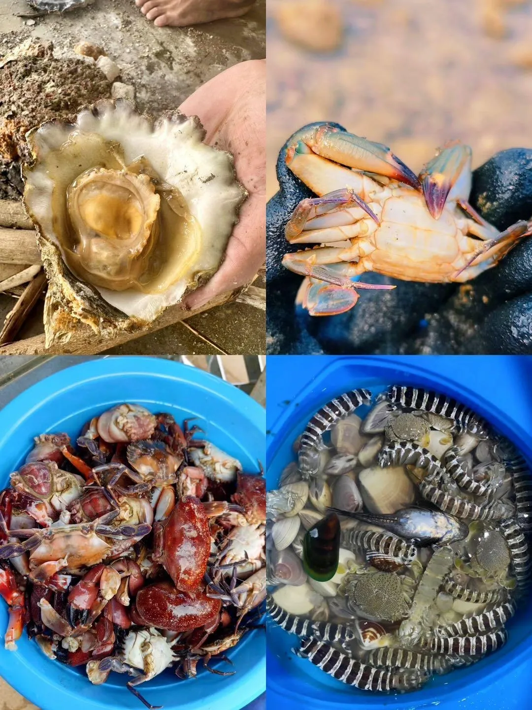 在退潮时,可以挖蛏子、抓螃蟹、捡海螺和吸皮皮虾。 收获的海鲜可以带回民宿自行烹饪或烧烤。此外, 涠洲岛海鲜市场也提供丰富的海鲜品类,价格合理,没有宰客现象。