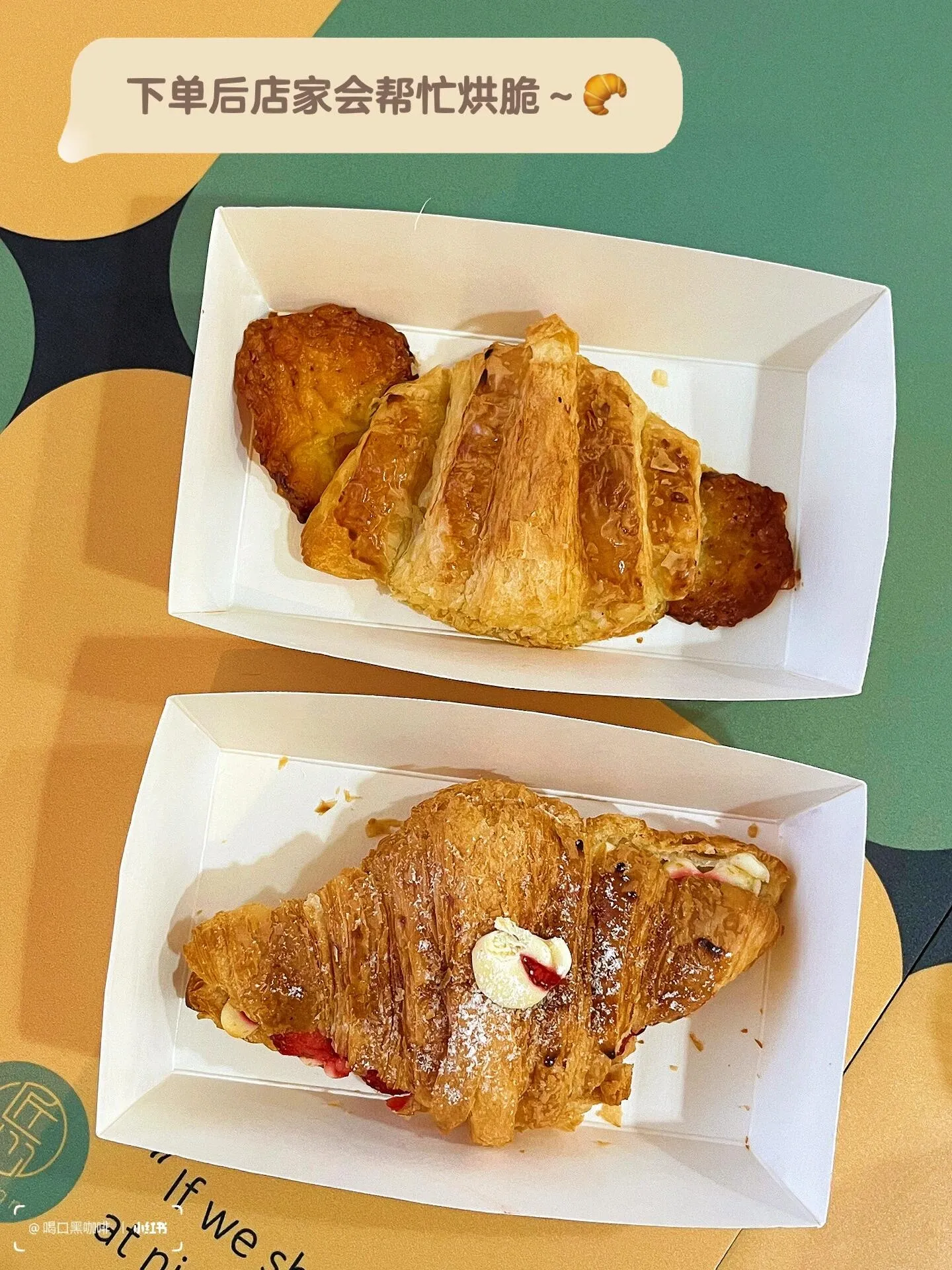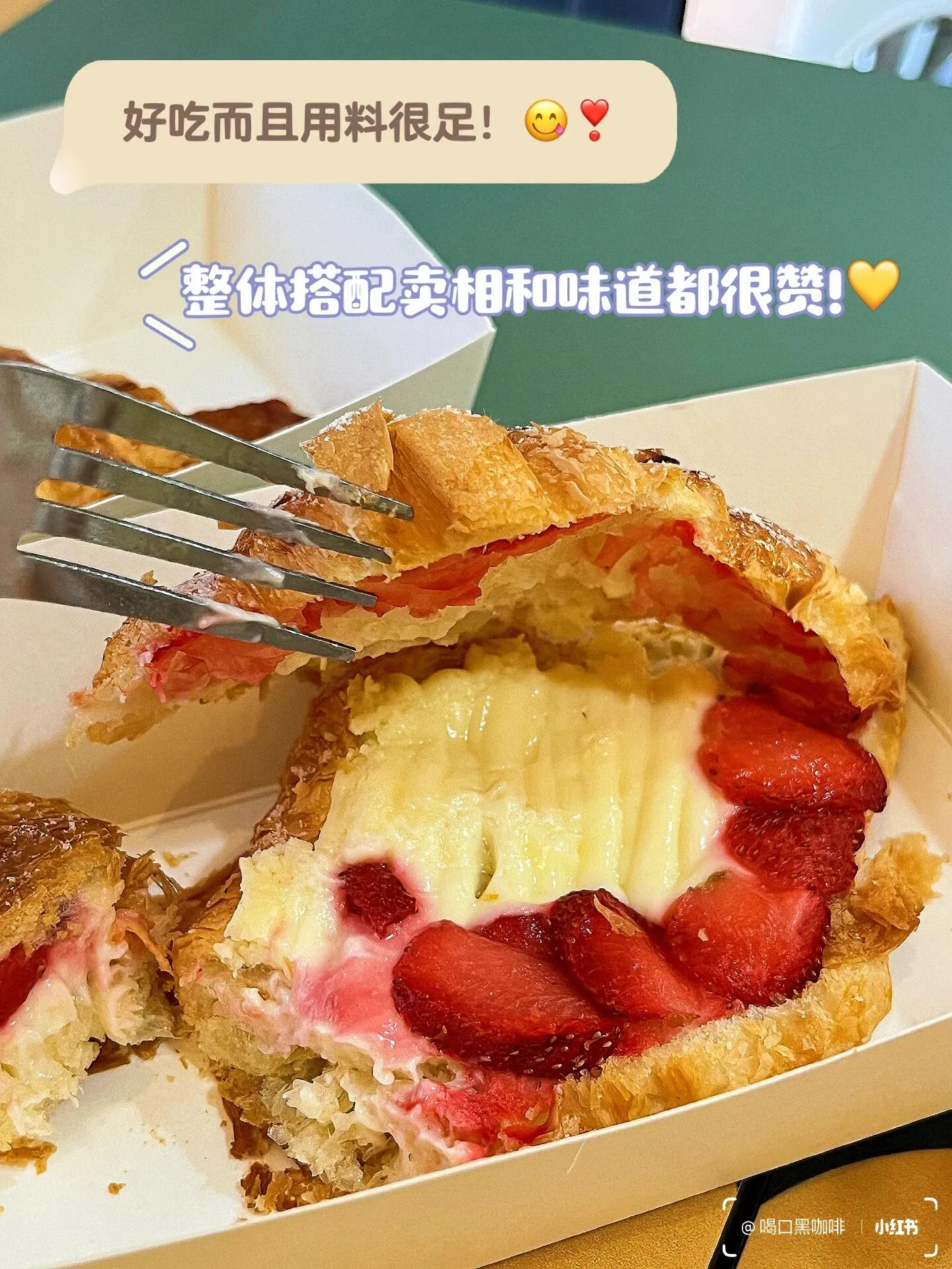 草莓奶油芝士可颂不仅卖相好看,味道也很棒。香脆的可颂搭配奶油芝士和草莓,口感丰富层次分明。培根芝士可颂中的芝士经过两次烘烤后变得较硬,但培根给的很大片,依然值得一试。